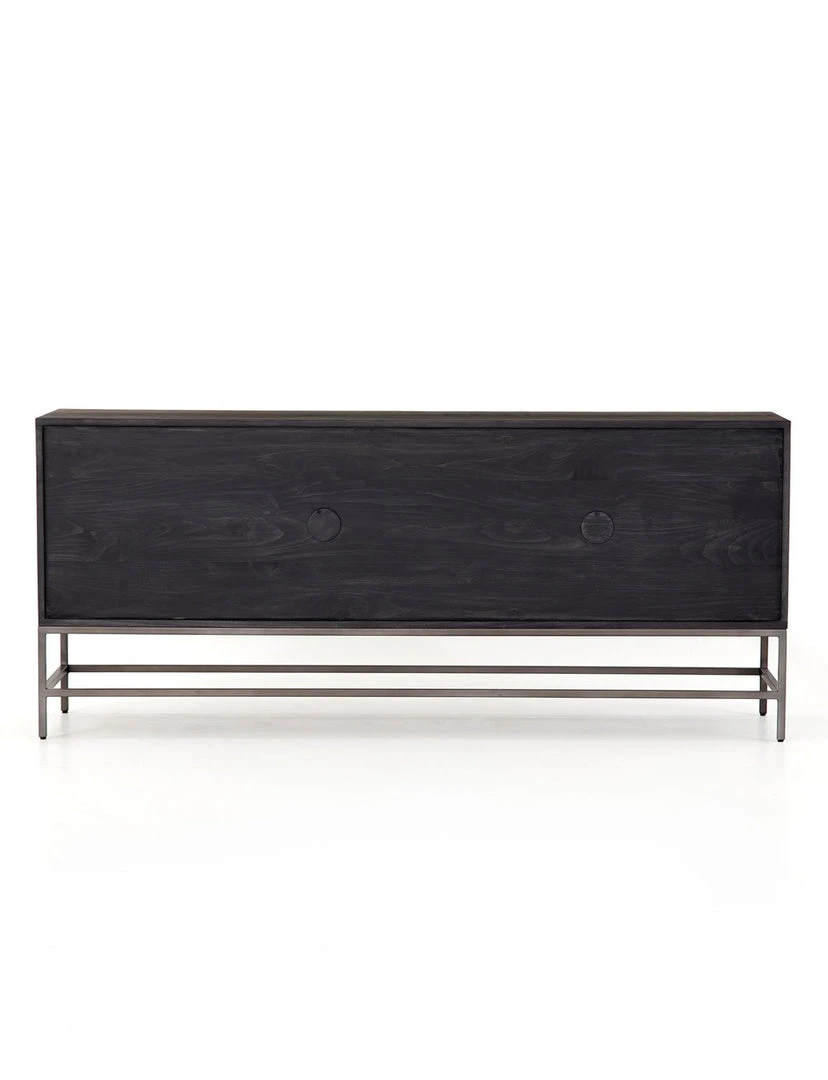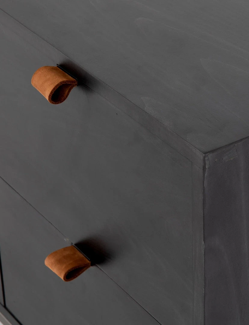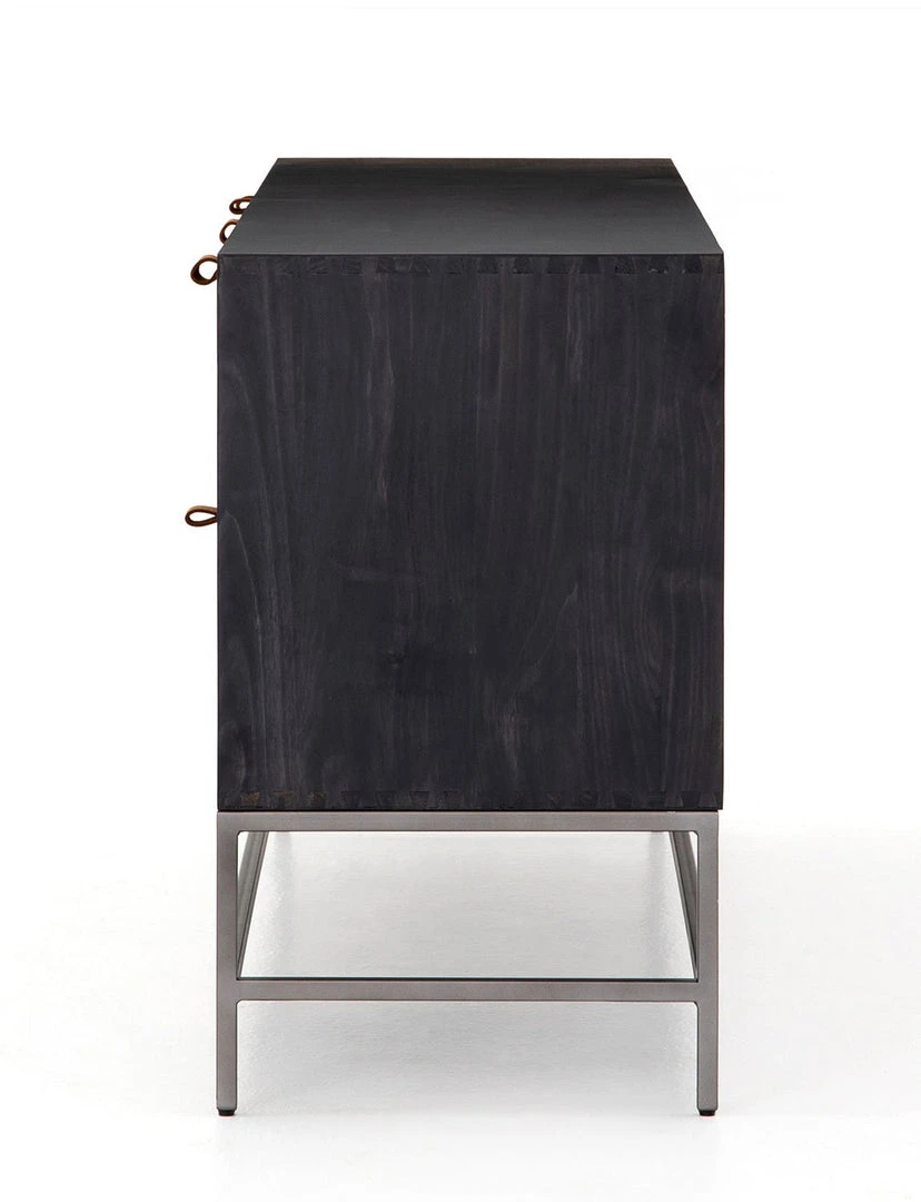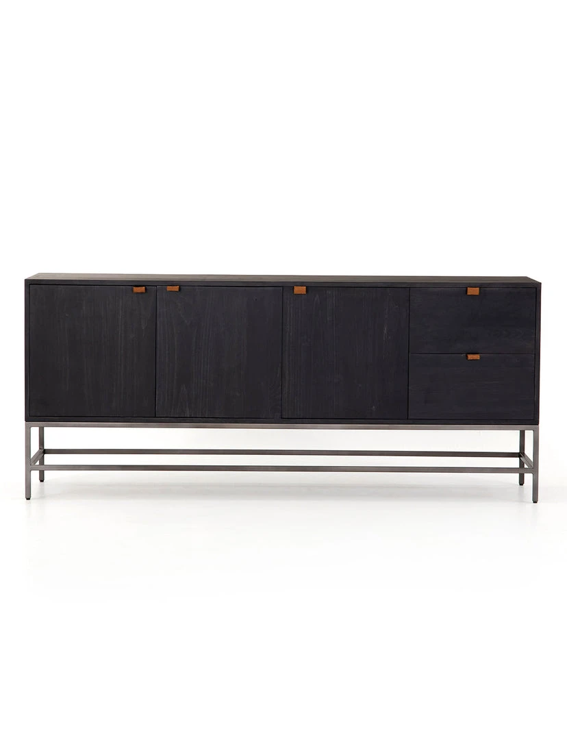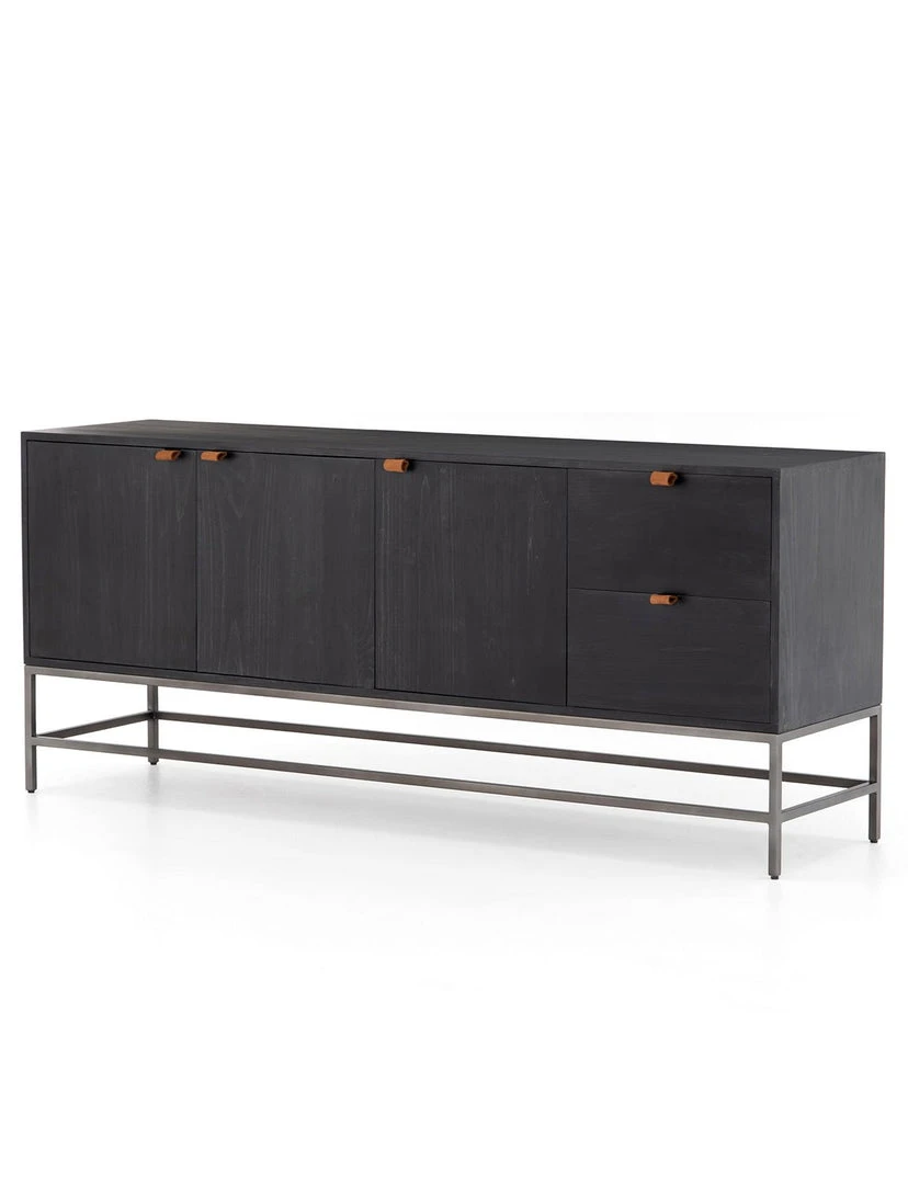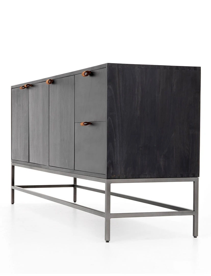 Inspired by sleek mid-century design, a stylish sideboard of black-washed poplar offers ample storage space by way of interior cabinetry and spacious dual drawers. Metal-secured pulls of toffee top-grain leather add a textural element of surprise.