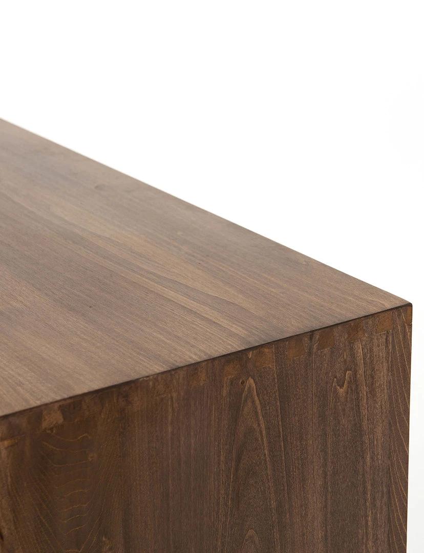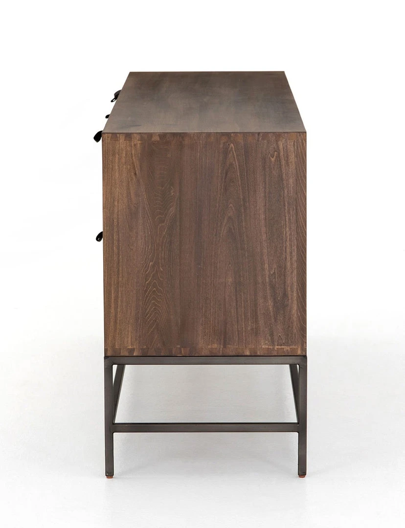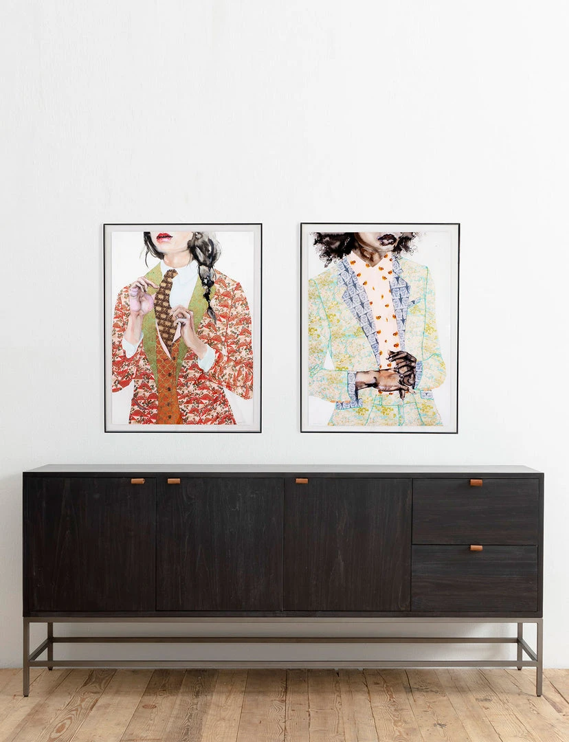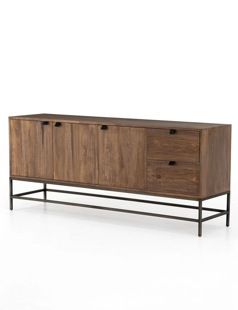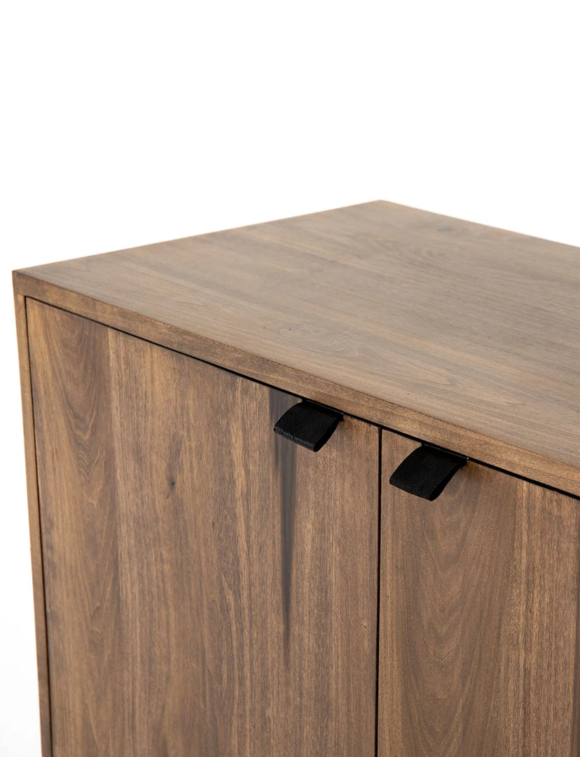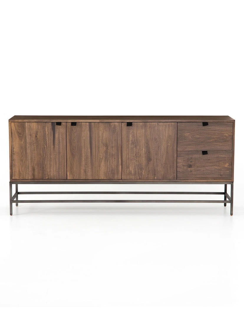 Inspired by sleek mid-century design, a stylish sideboard of black-washed poplar offers ample storage space by way of interior cabinetry and spacious dual drawers. Metal-secured pulls of toffee top-grain leather add a textural element of surprise.