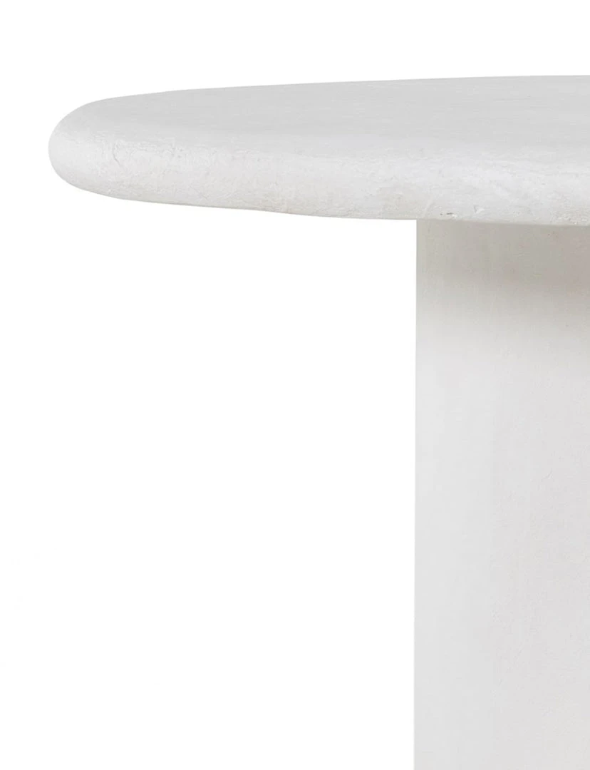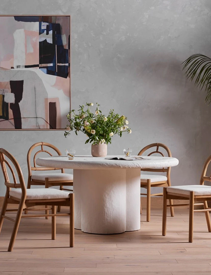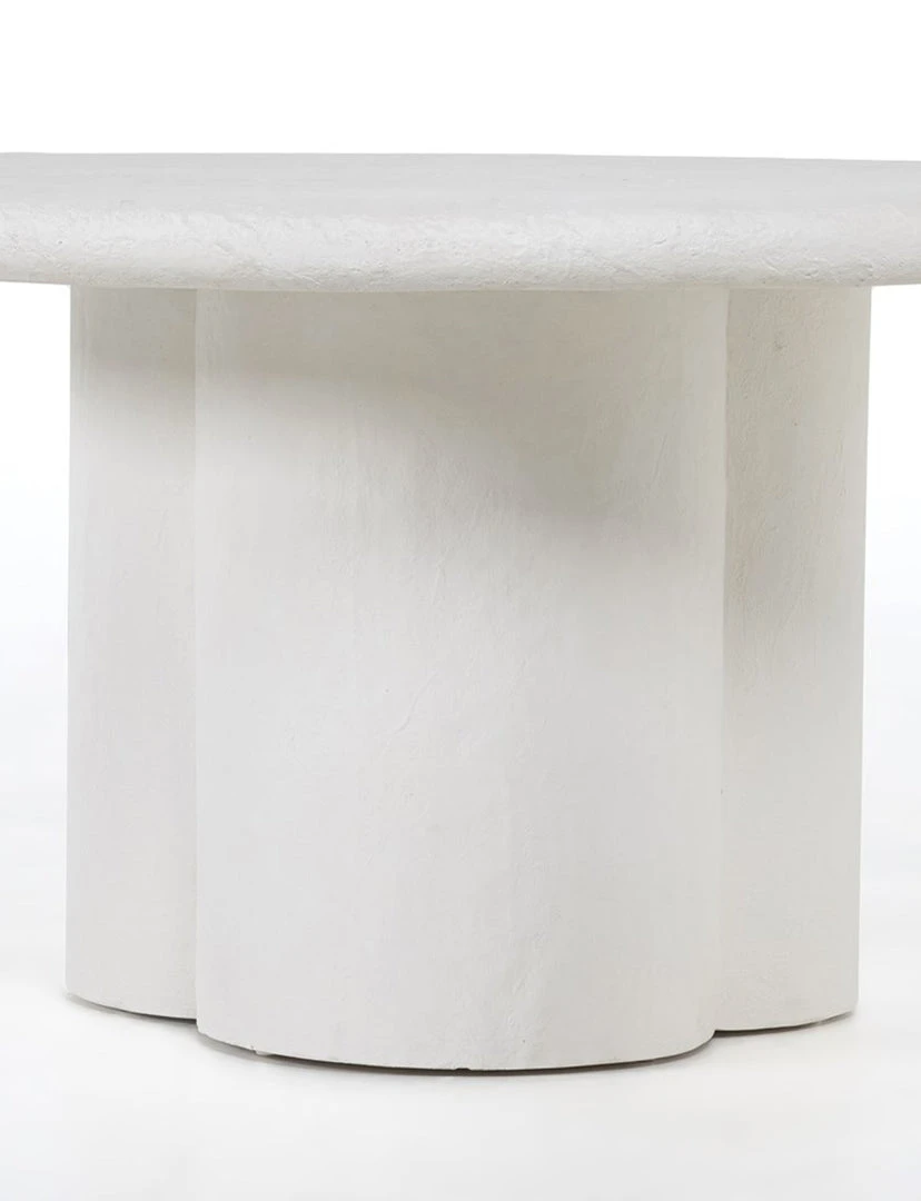 Crisp, clean adobe vibes. Made from white-finished concrete, a voluminous clover-shaped base supports a thick-rounded tabletop for dramatic scale. Soft yet textured look pairs with a wide range of seating, from natural woods to leather, and more.