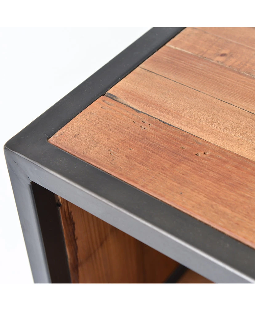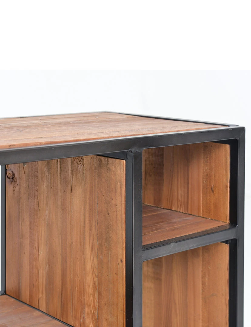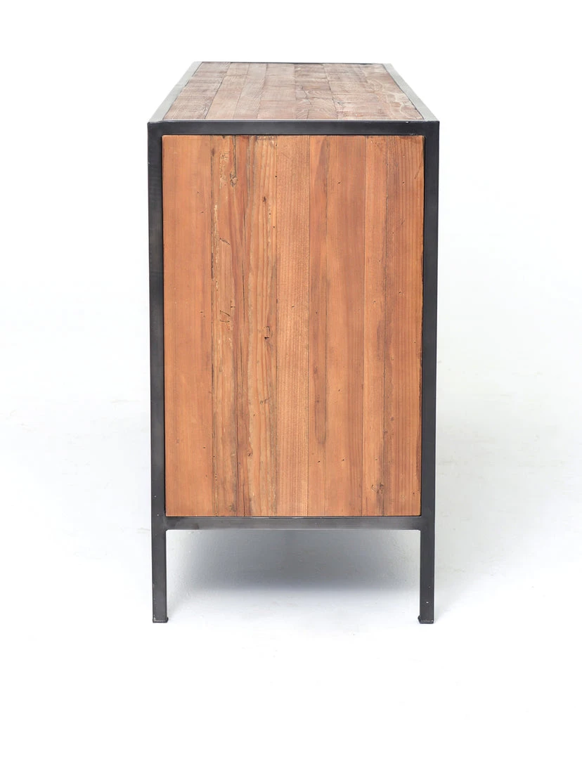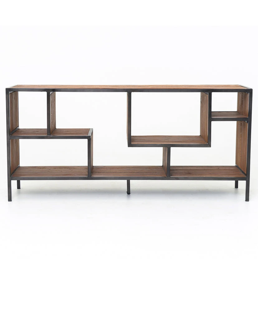 Varied compartments play across a modern, open console framed in slim, waxed-black iron. Reclaimed pine is bleached to remove layers of paint and stain, and finished in a soft, natural tone for an update on the industrial design aesthetic.