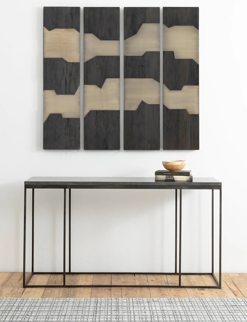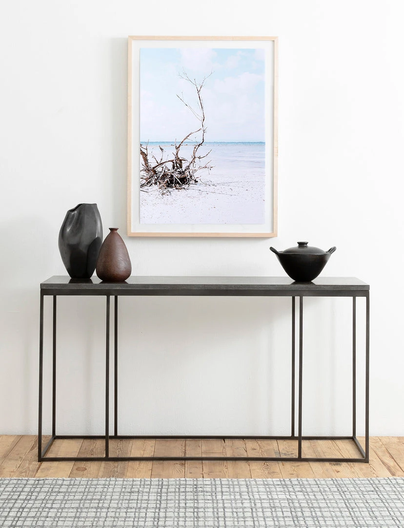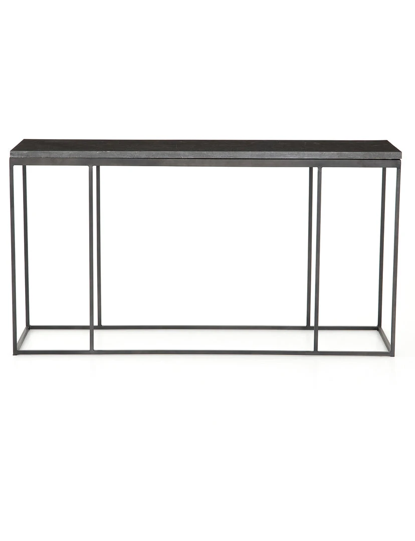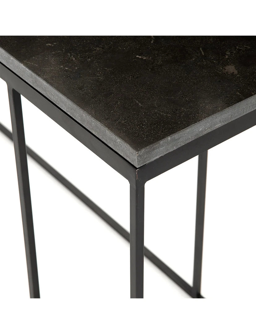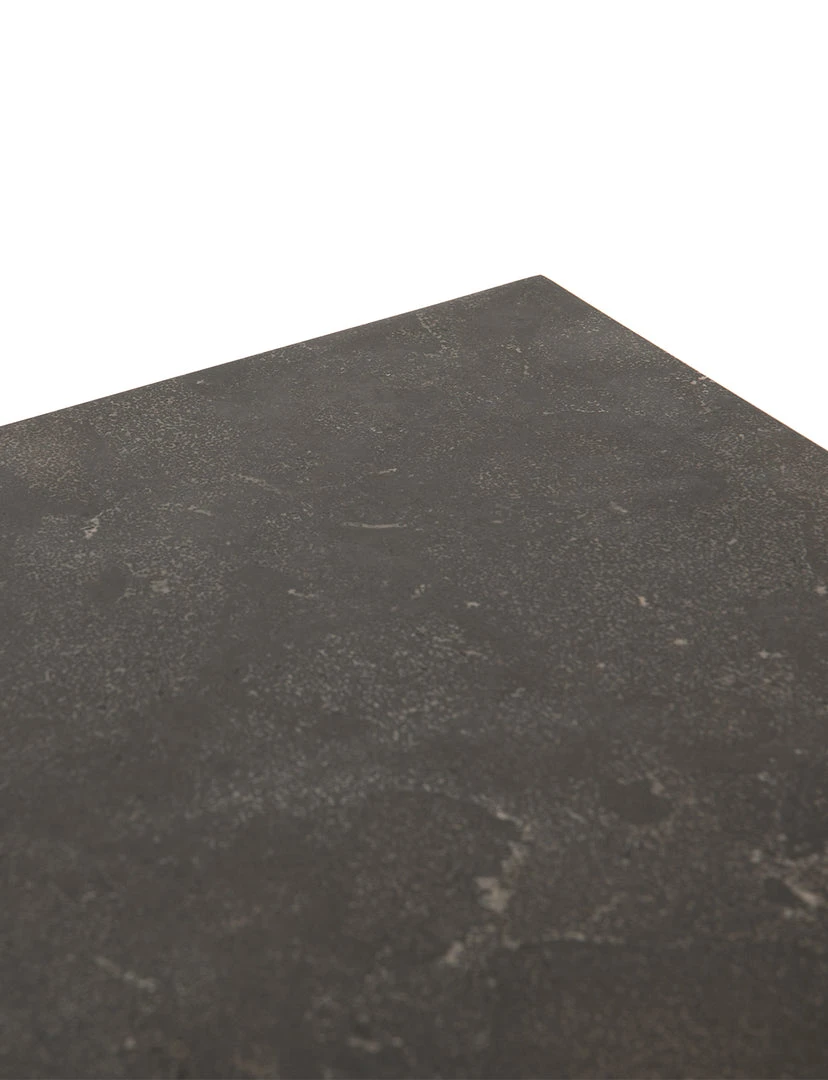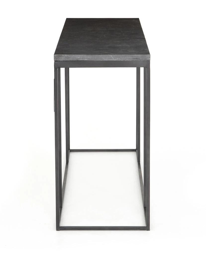 Spare beauty, casual elegance. A gunmetal Parson’s base with hand-rubbed, dimensional edges supports a rough-hewn bluestone slab that feels found and perfectly placed.