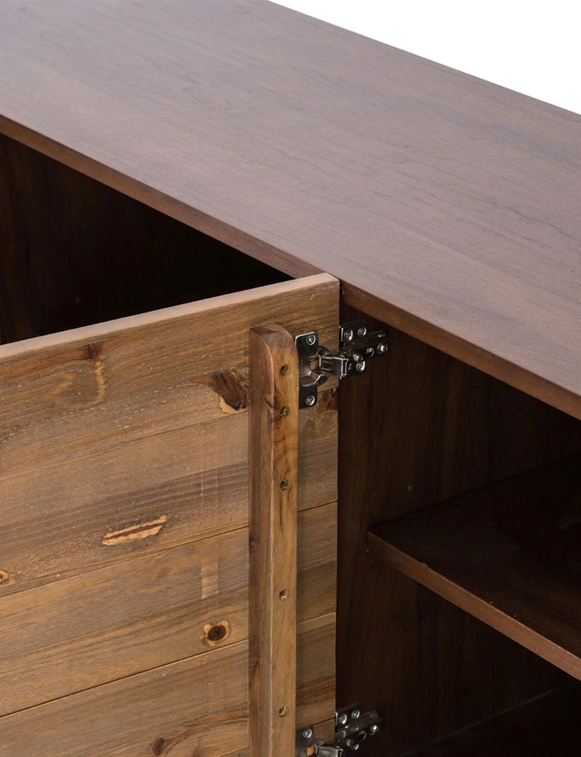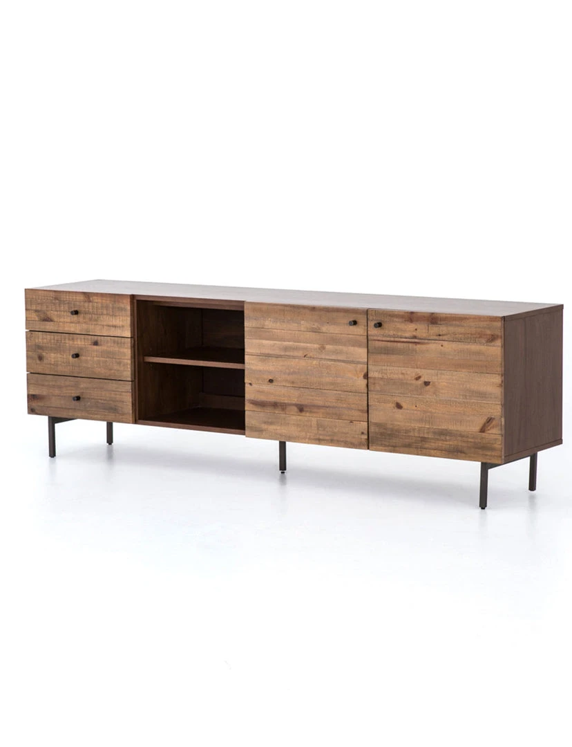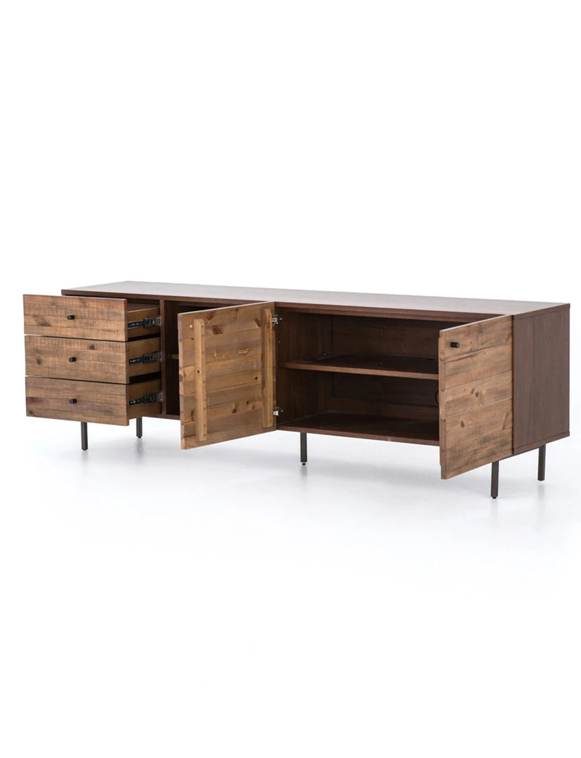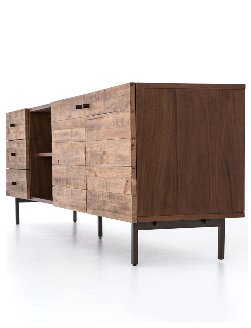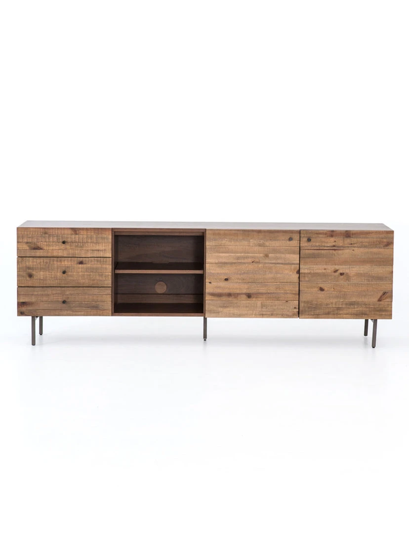Drawers, shelving and cabinetry of reclaimed pine meet chestnut-finished walnut veneer casing for a light, organic look. Slim iron legs of oil-rubbed bronze bring a freshly elegant touch to media storage.