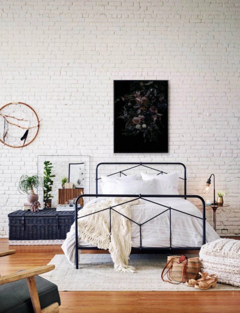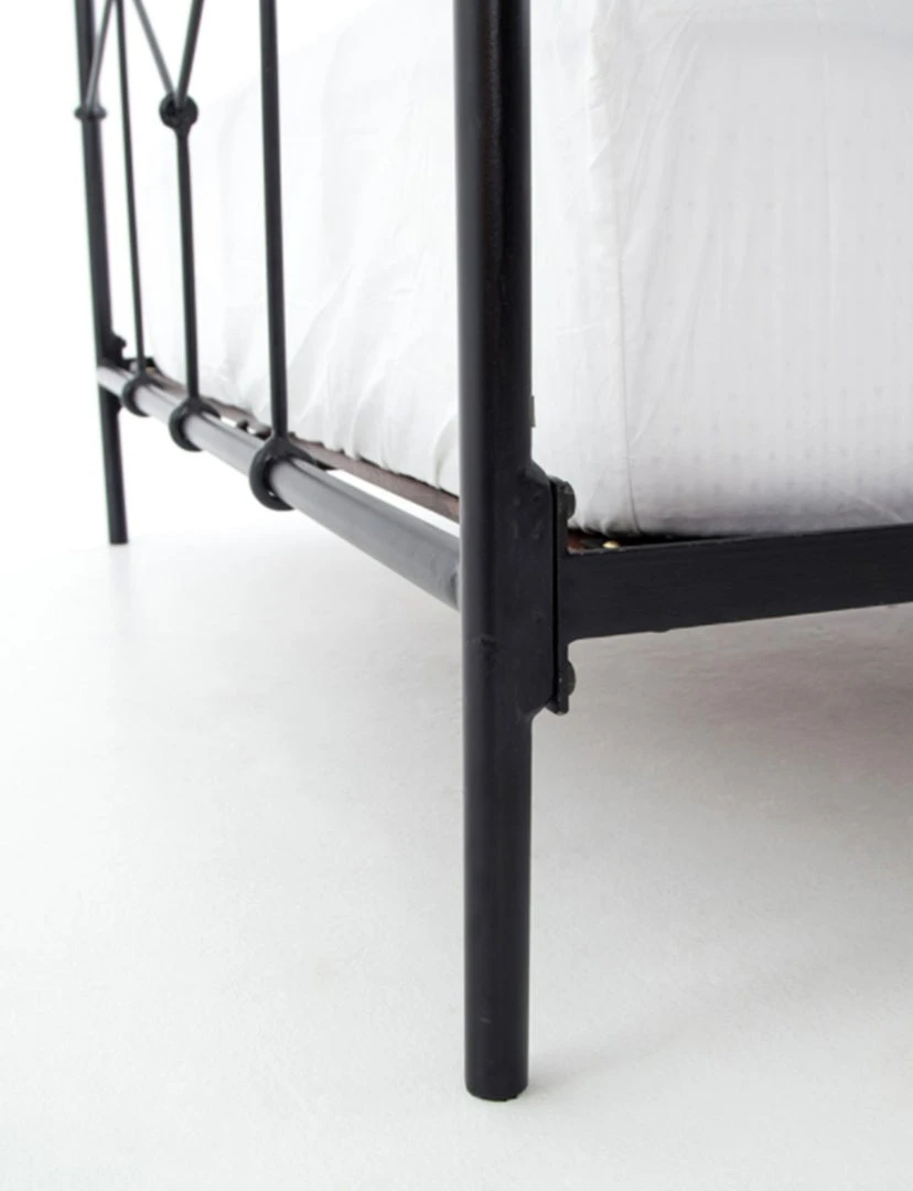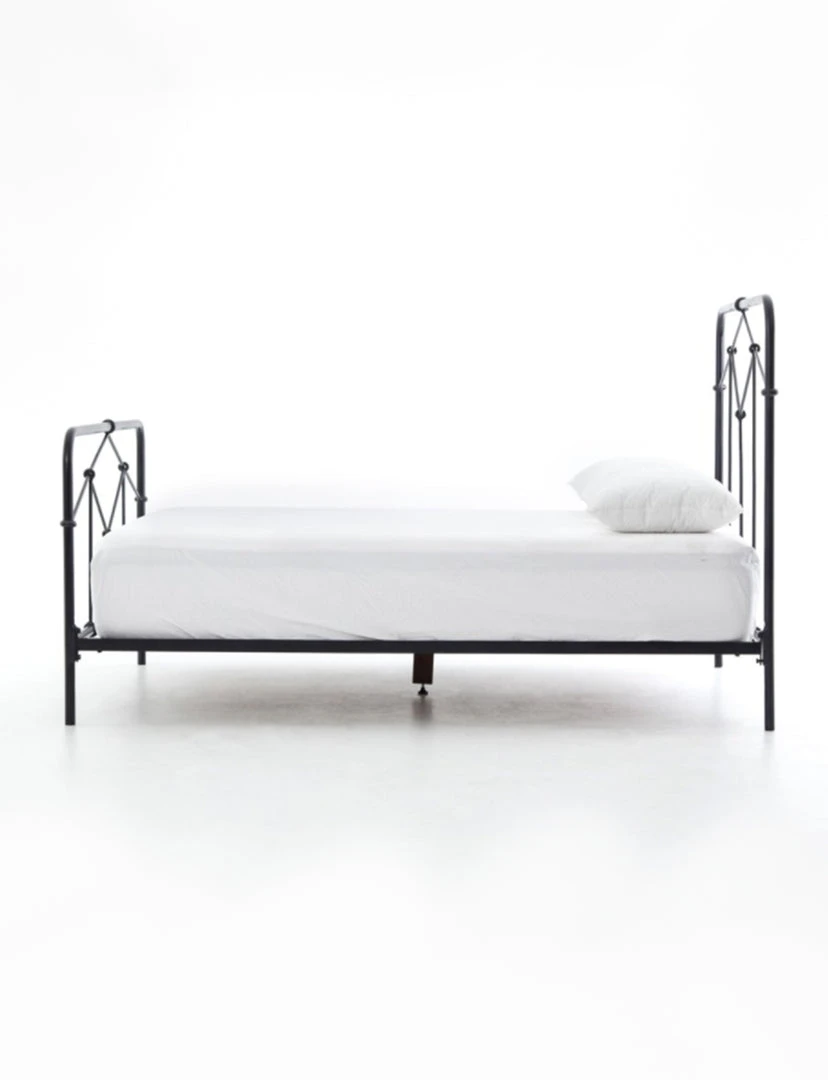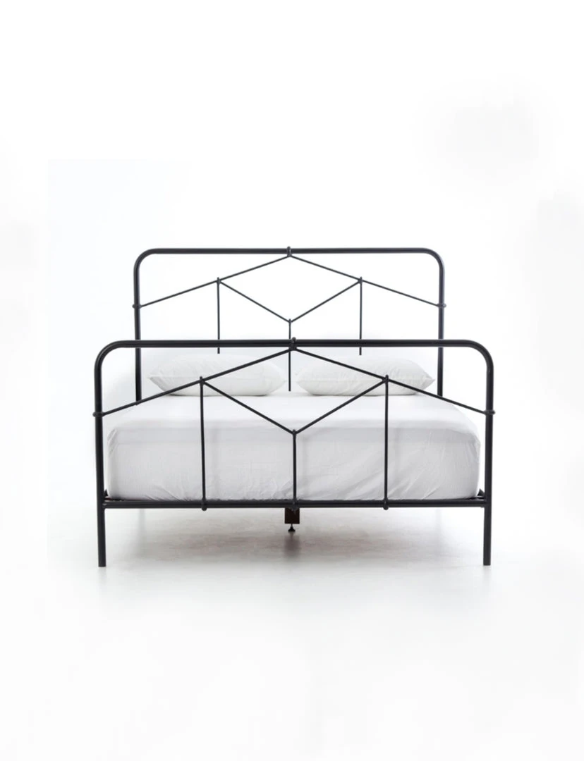 Modern geometric patterns update a design inspired by vintage European hospital beds. Finished in a sage green, simple iron tubing looks airy and feels substantial. Low-profile box spring recommended.