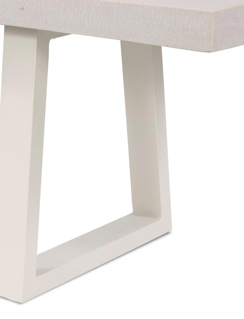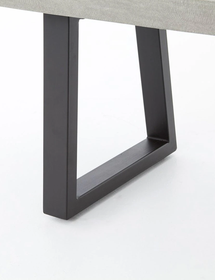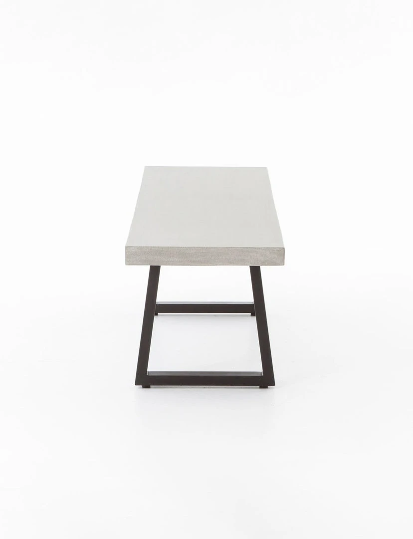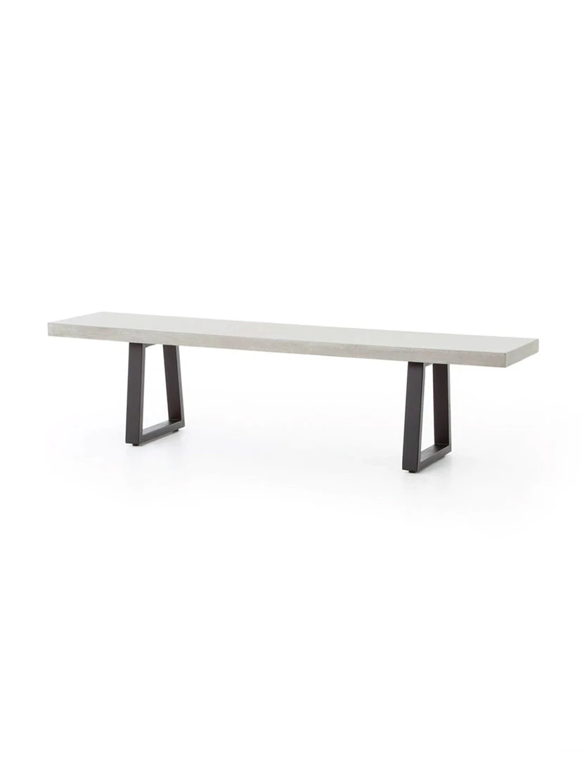 A strikingly simple poly-resin bench derived from river sand is polished to a smooth sheen. Angled, natural white iron legs add architectural appeal to bench-style seating. Great solo or paired with Linear Dining Table, indoors or out. Slight color variance is to be expected, and speaks to lava stone’s organic nature. Cover or store indoors during inclement weather and when not in use.