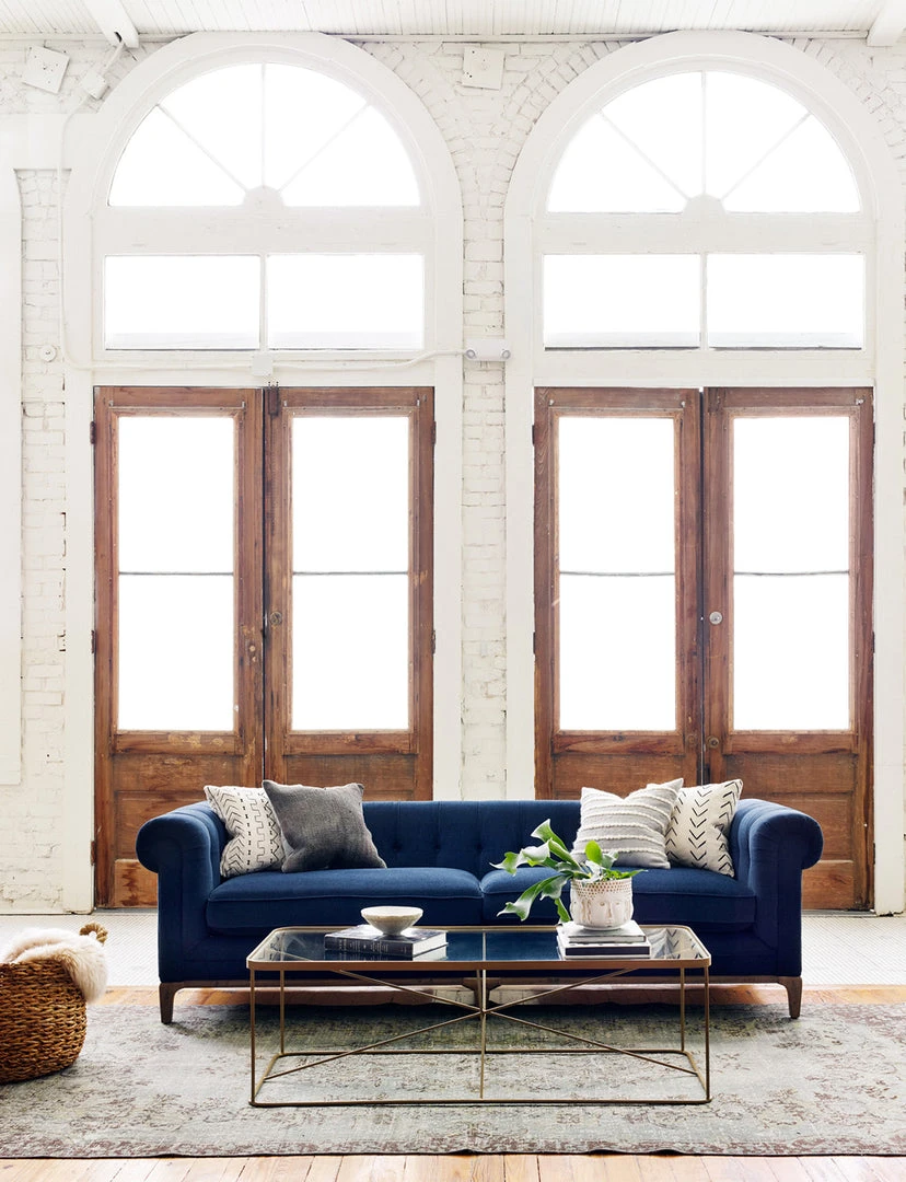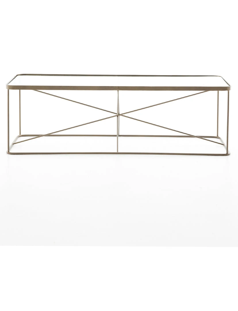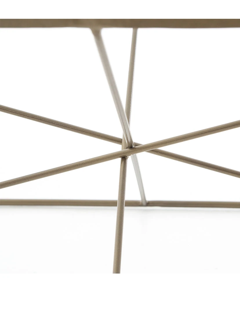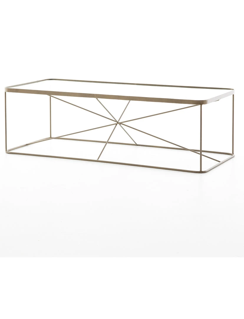 Modern geometrics play with antique brass in this fascinating coffee table. Radiating lines create a sense of simplified, airy space without feeling stark.