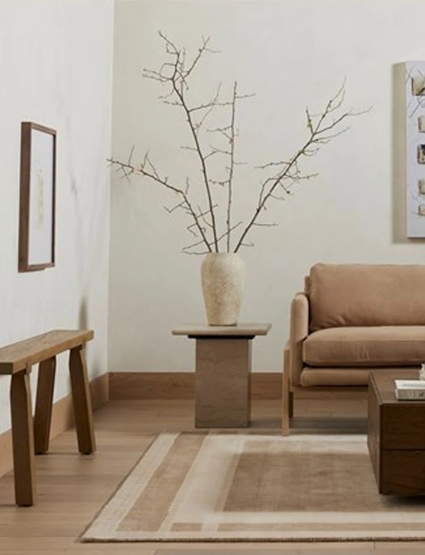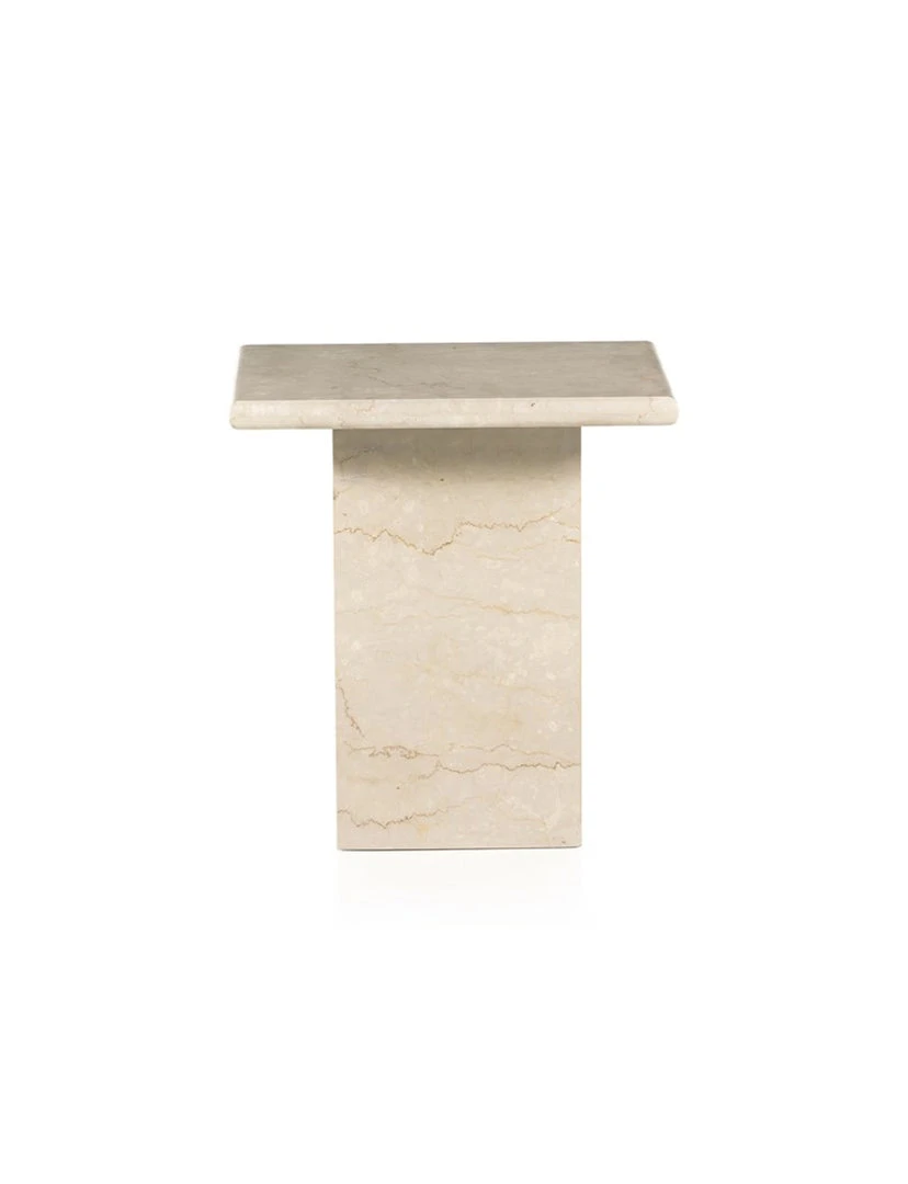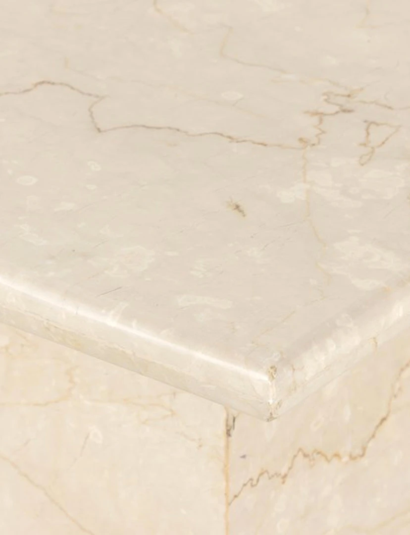 Inspired by Italian design of the 1970s, a monolithic end table is made entirely from solid marble in a soft cream.