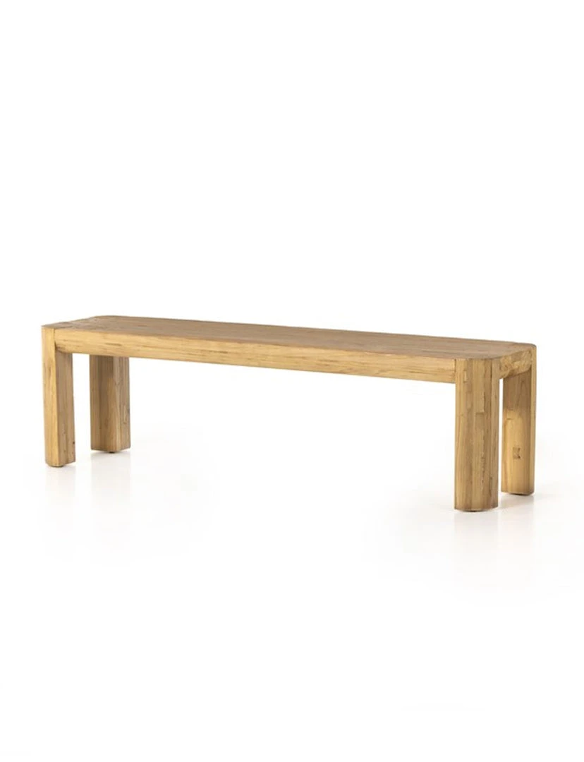 Solid reclaimed elm flaunts its bright natural finish, forming beautifully streamlined bench seating. This timelessly versatile style awes in the entryway, living area, hallway, and beyond.