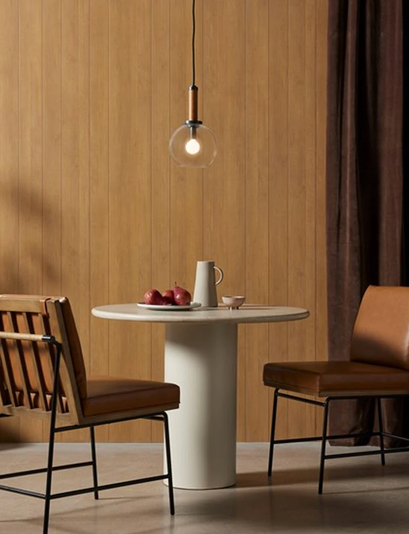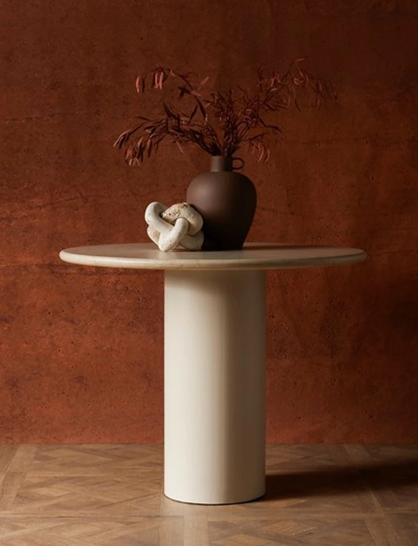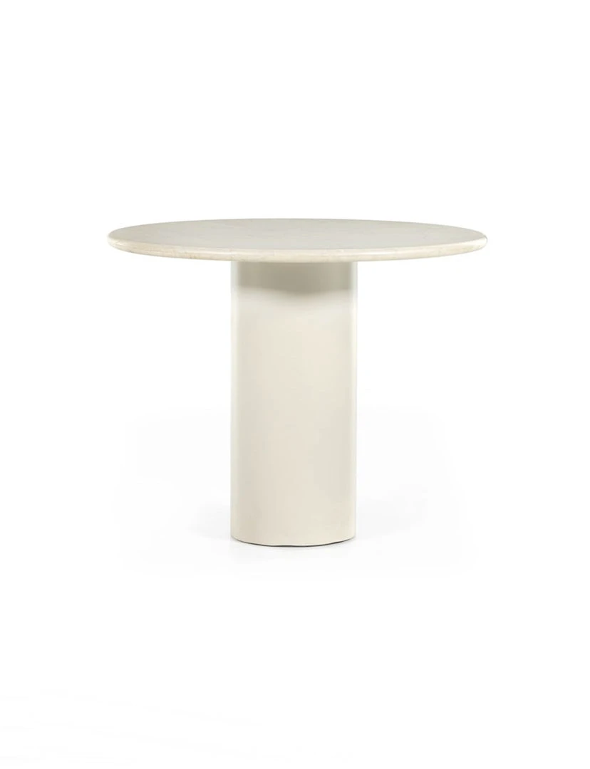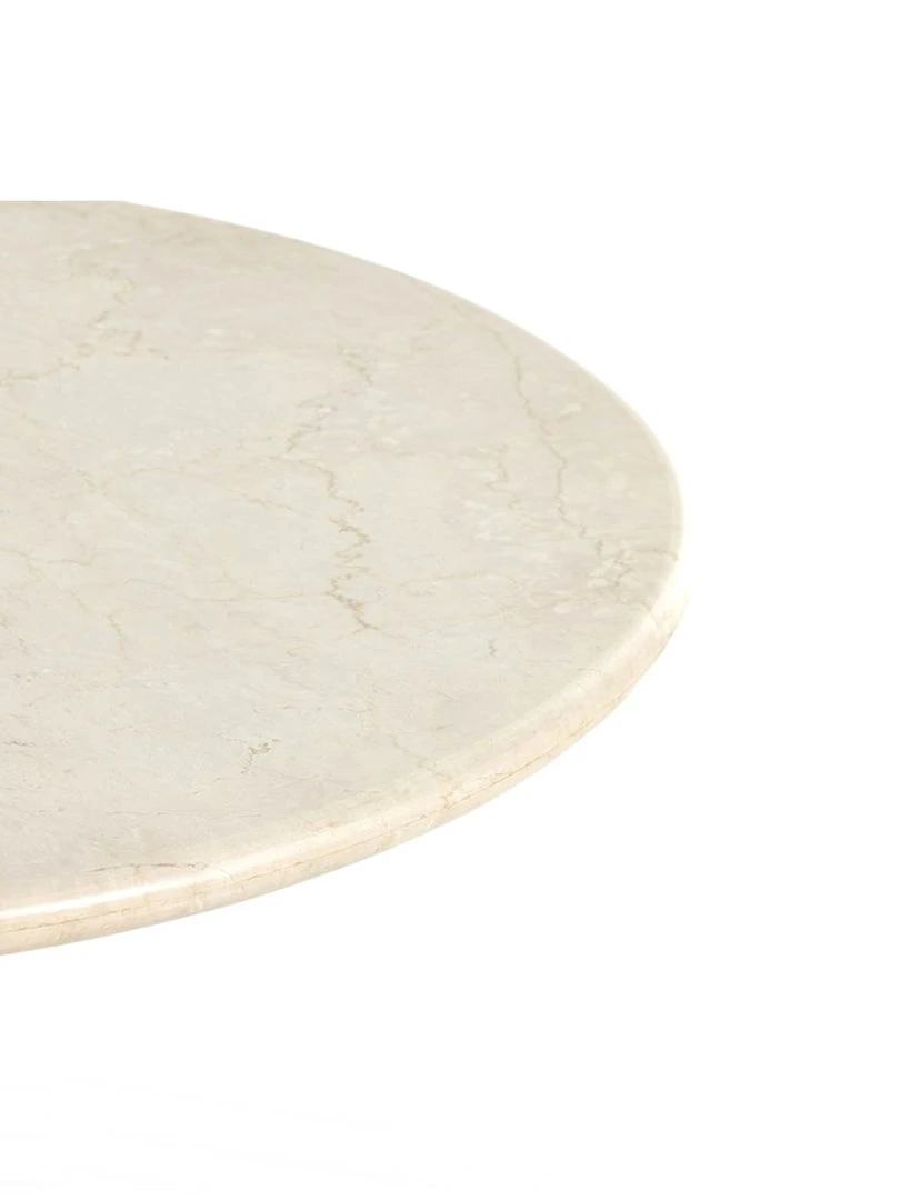 Simply sophisticated. A bistro-style table inspired by 1970s Italian design, an ivory-finished iron base supports a rounded tabletop of cream-colored solid marble, for a fresh, monochromatic look that pairs with just about anything.