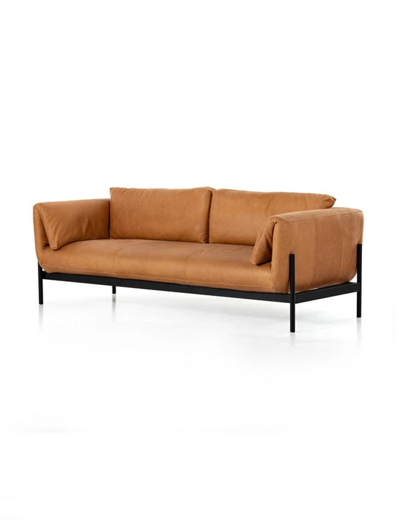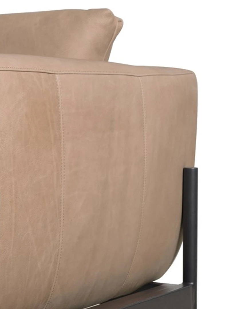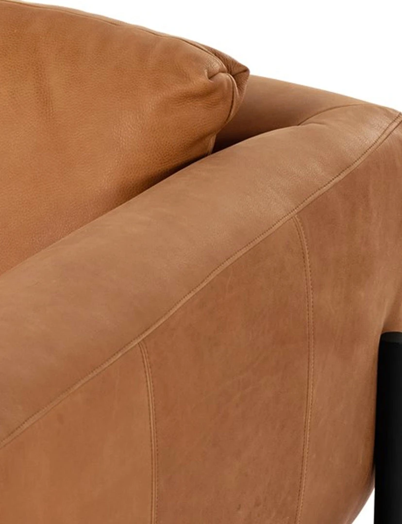 A softer, more modern take on a classic silhouette. Plush cushioning and unique foldover arm details are upholstered in our rich, buttery soft 100% top-grain leather. Matte iron base adds just the right amount of contrast.