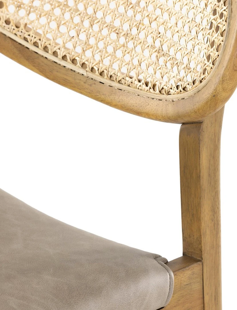 Make it modern with mixed materials. Burnished solid parawood forms a streamlined frame for faux leather seating and an inlaid cane back in an updated kidney shape.