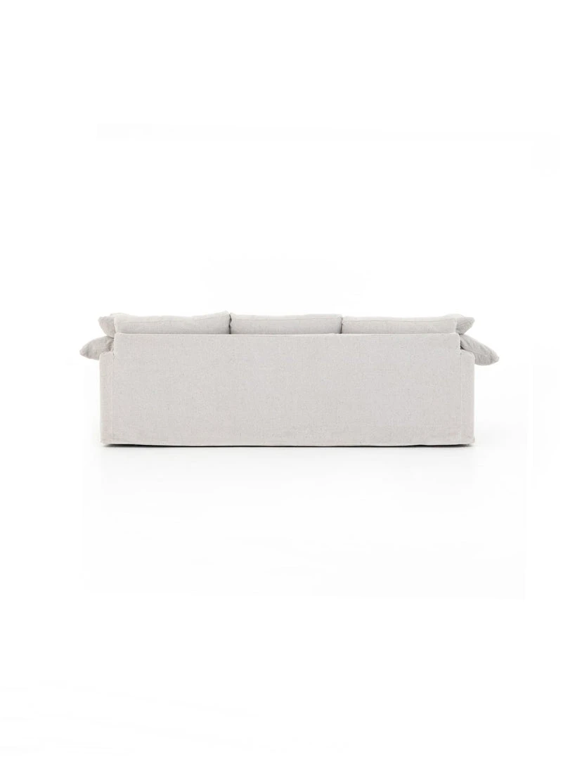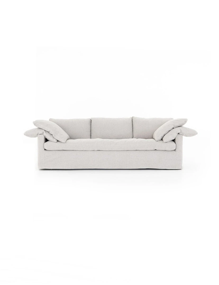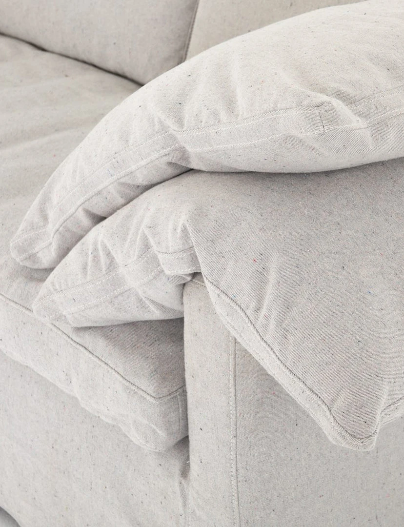 Sink right in. Made from upcycled denim, luxurious, light grey cotton seating features feathery cushioning and casual pillows for total comfort.