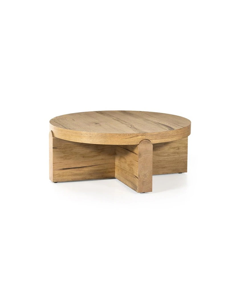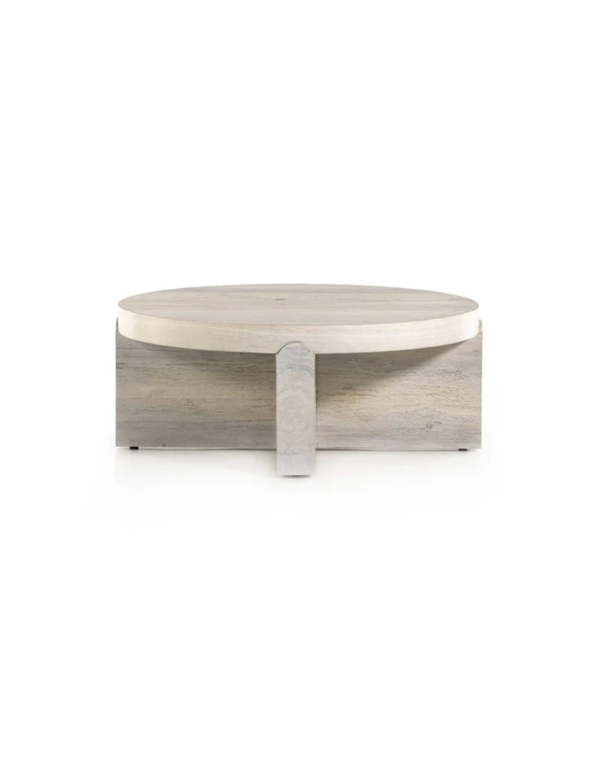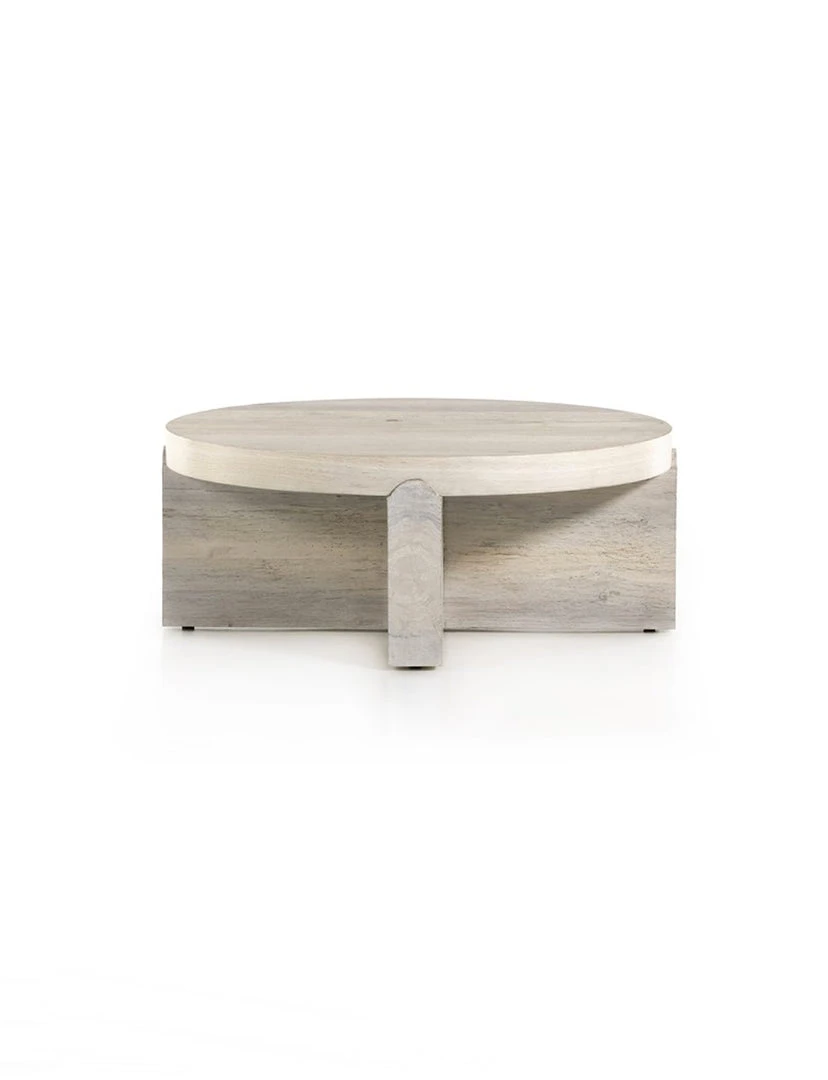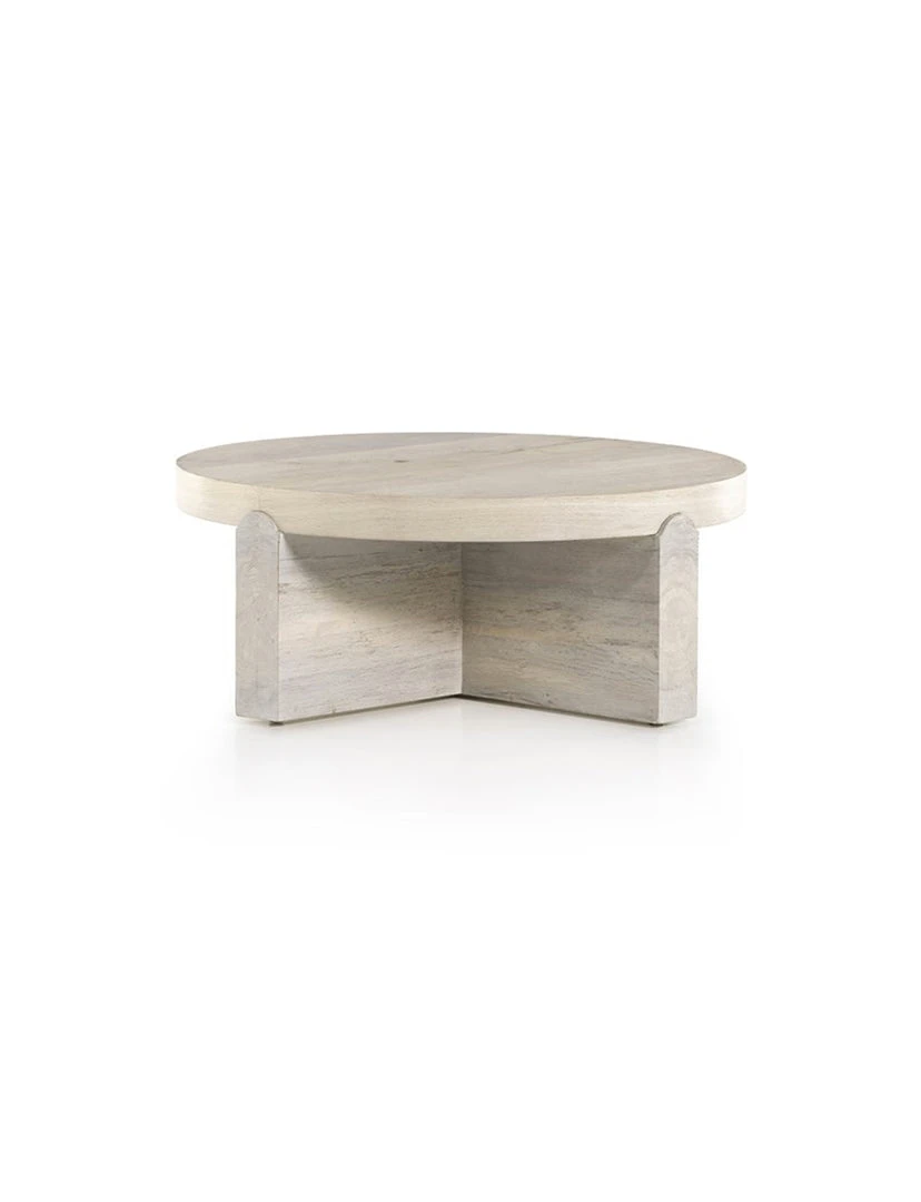 Keep things light and monochromatic with a rounded coffee table. Slab-style legs intersect a thick-cut top for an intriguing, geometric touch.