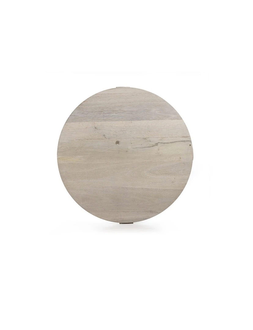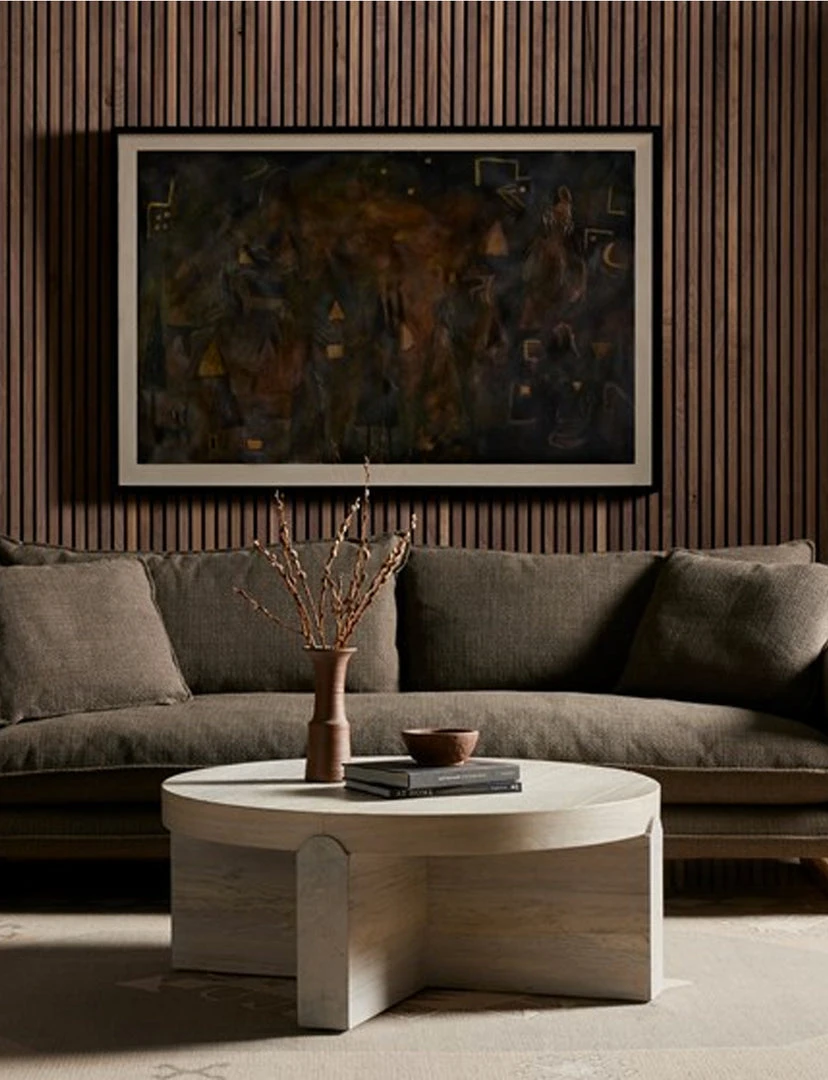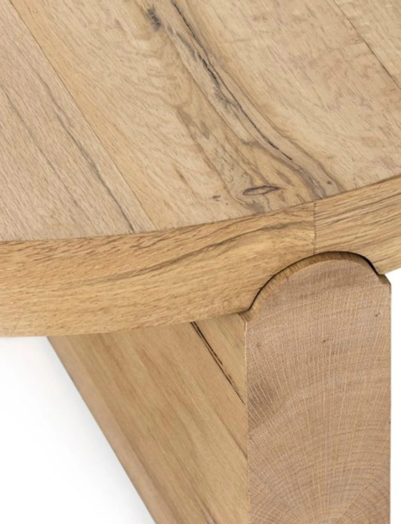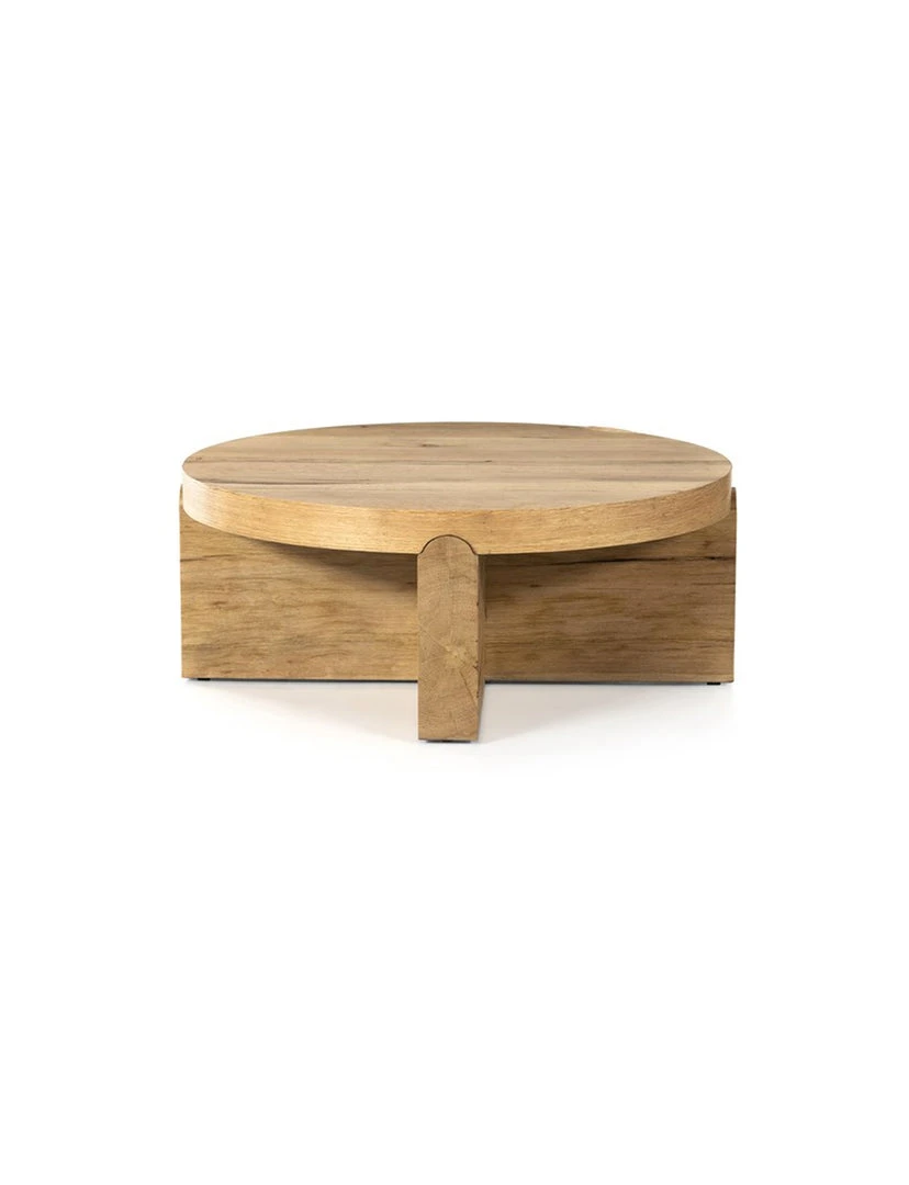 Keep things light and monochromatic with a rounded coffee table. Slab-style legs intersect a thick-cut top for an intriguing, geometric touch.