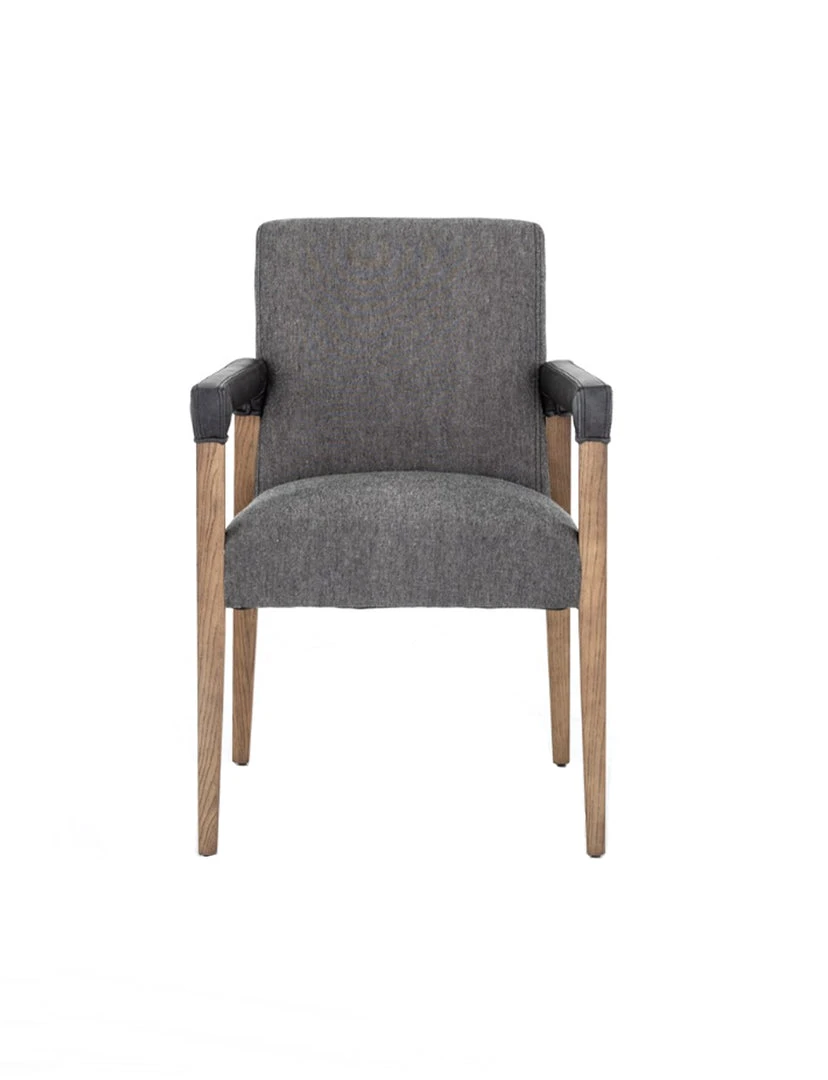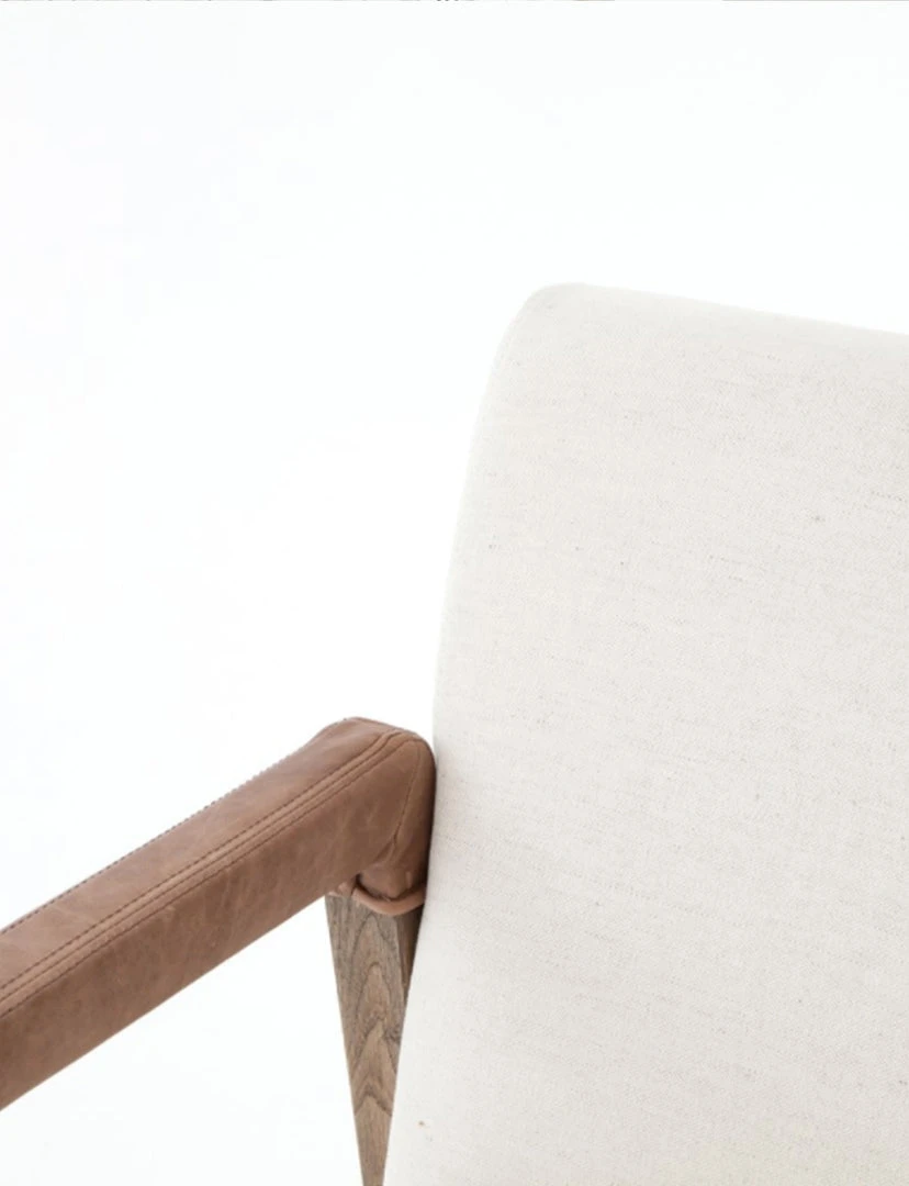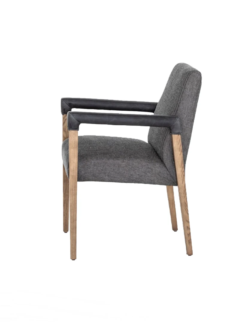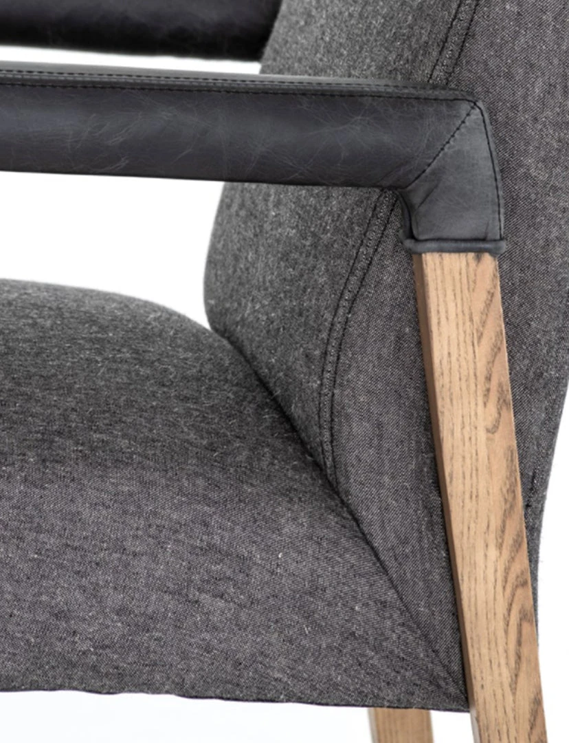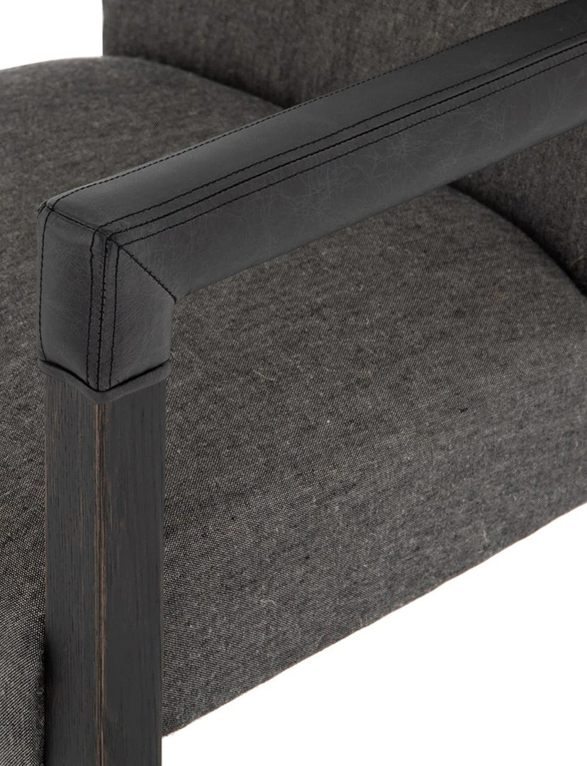Elegance is no exaggeration. Slim, tapered oak with arms wrapped in smoky top-grain leather frames a floating hemp-blend seating, for a fresh material mix.