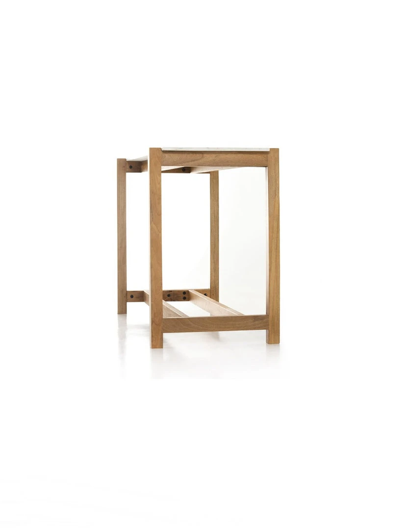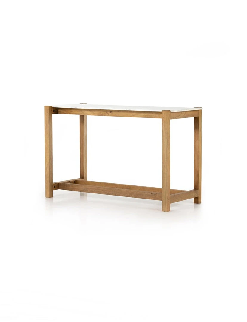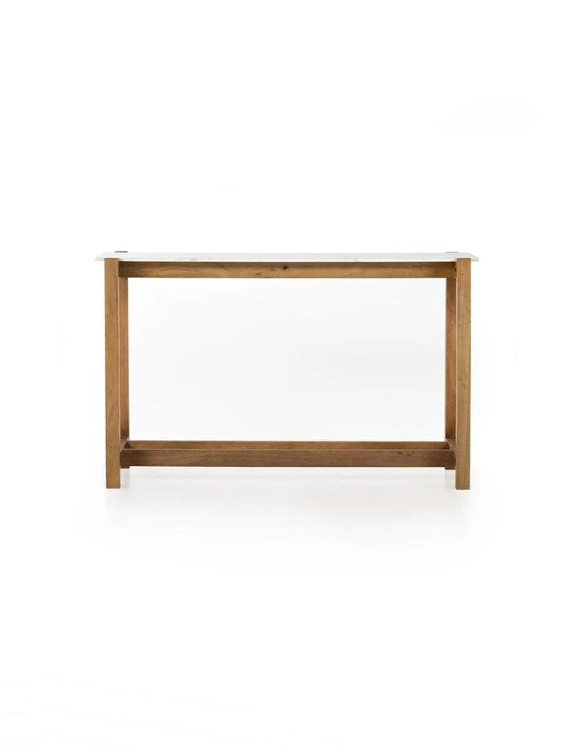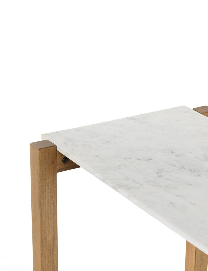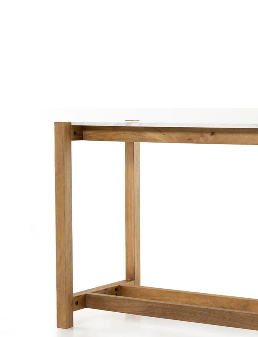 Simple and streamlined, an eye-catching material mix takes this modern bar table to the next level. Auburn-finished mango forms an open, structured frame for a rectangular tabletop of solid white marble, for a midcentury-infused twist on traditional farmhouse styling.