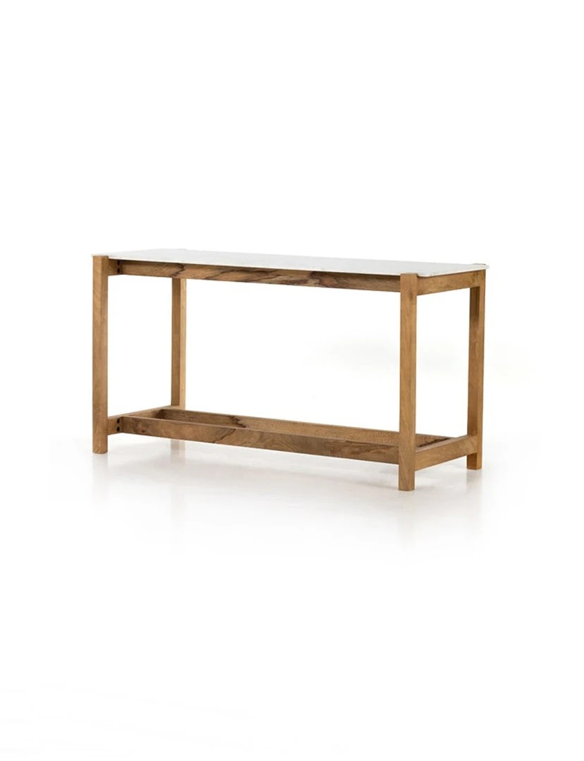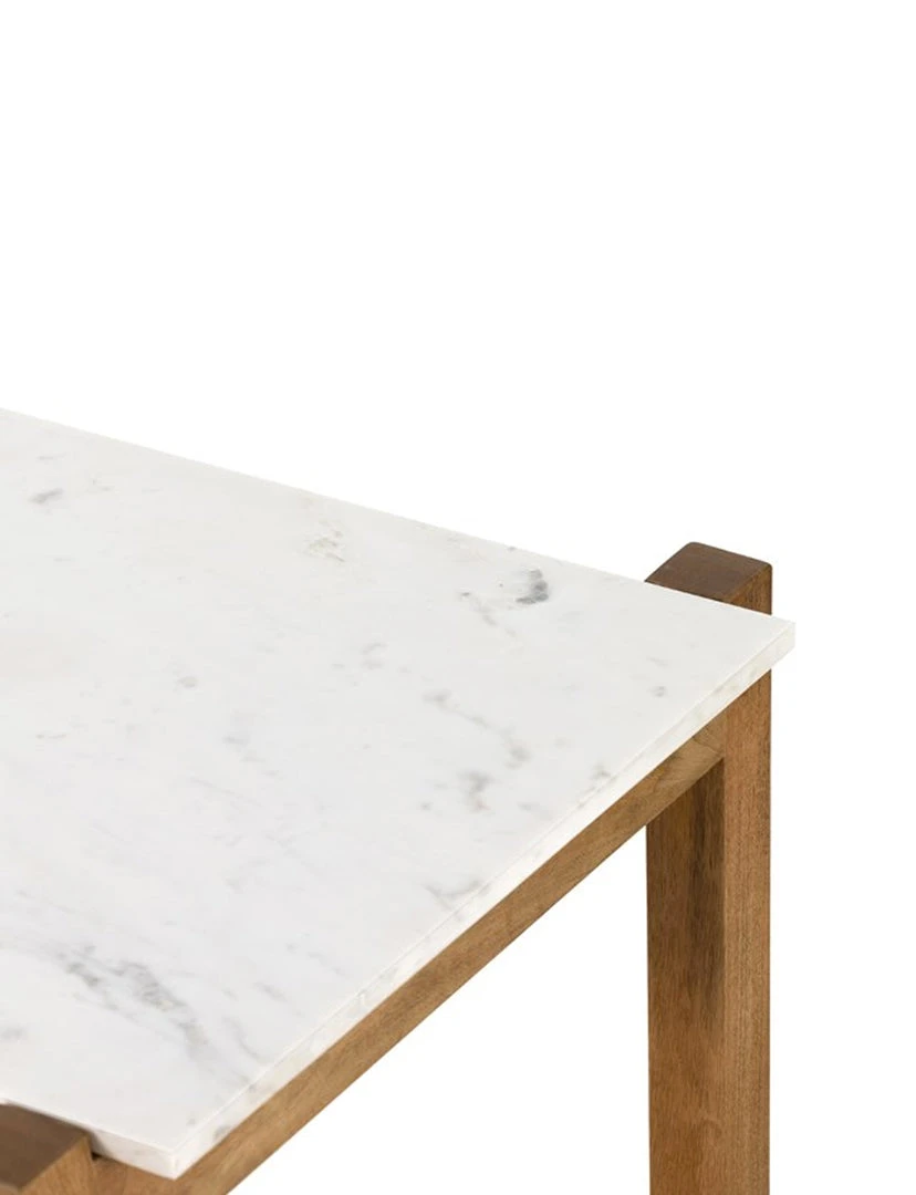 Simple and streamlined, an eye-catching material mix takes this counter-height table to the next level. Auburn-finished mango forms an open, structured frame for a rectangular tabletop of solid white marble, for a midcentury-infused twist on traditional farmhouse styling.
