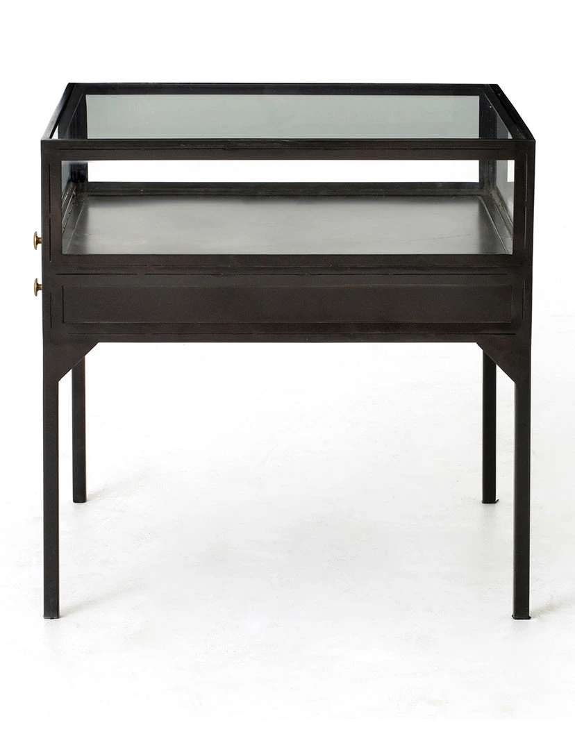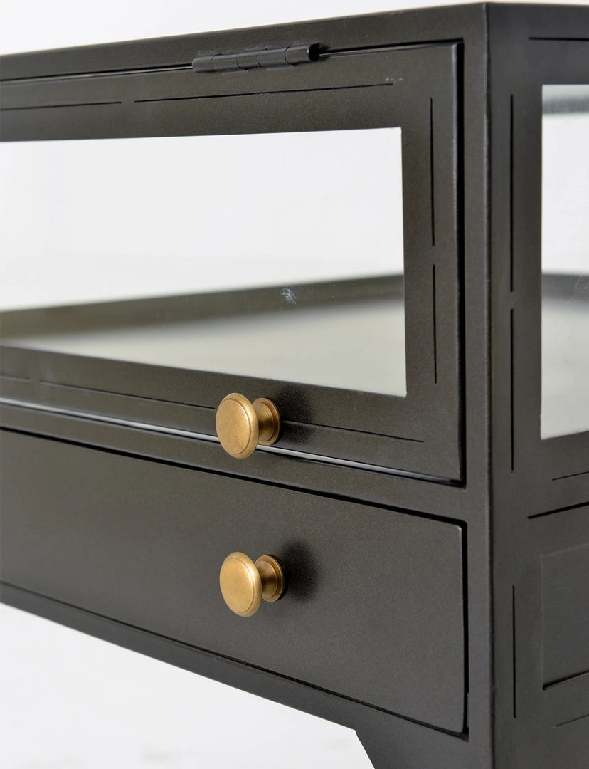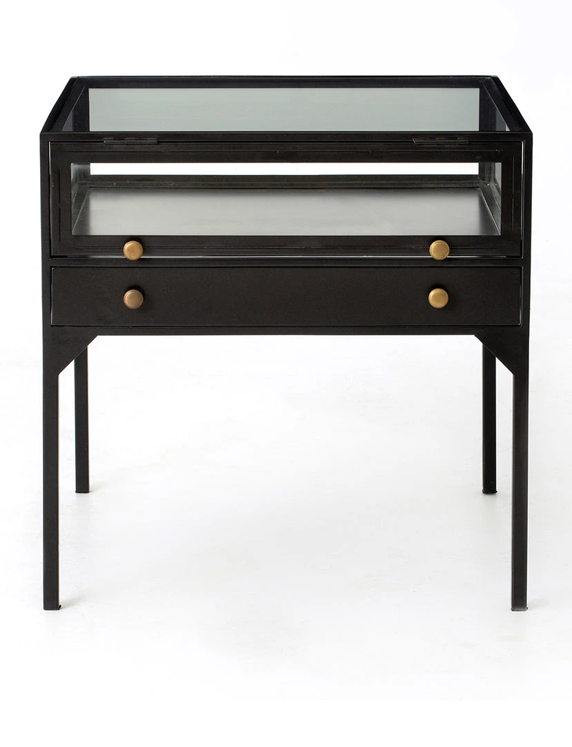 A shadowbox-inspired end table gives your inner collector a place to play. Frame prized possessions in a glass enclosure with matte-black metal and brass knobs.