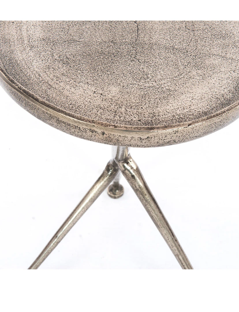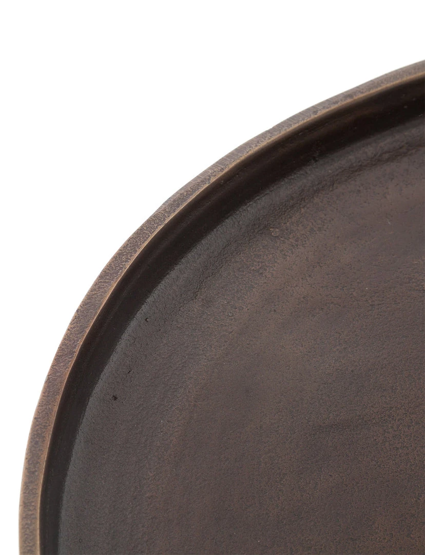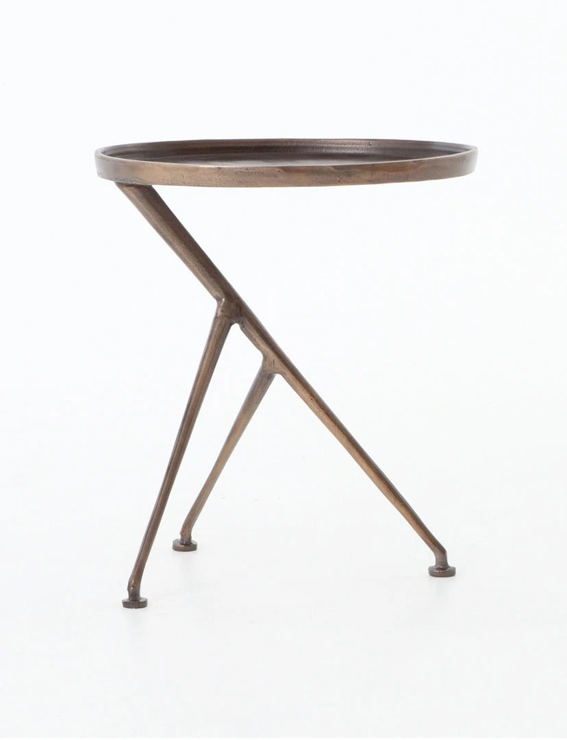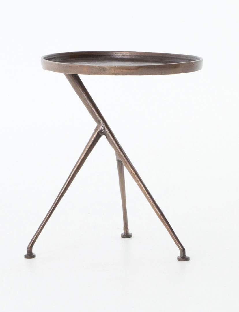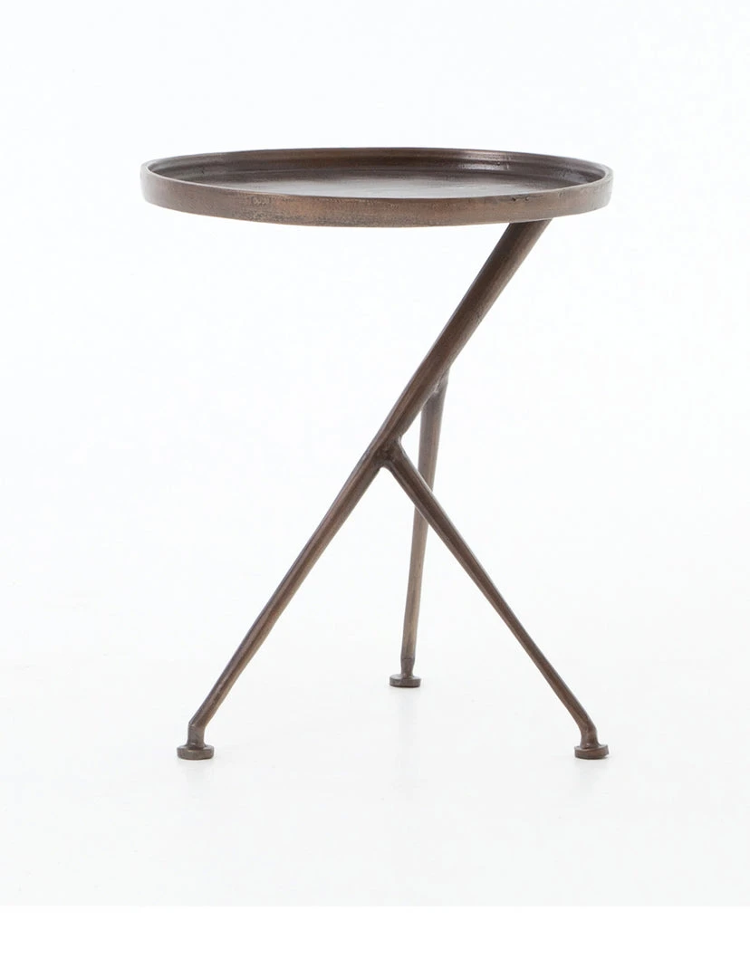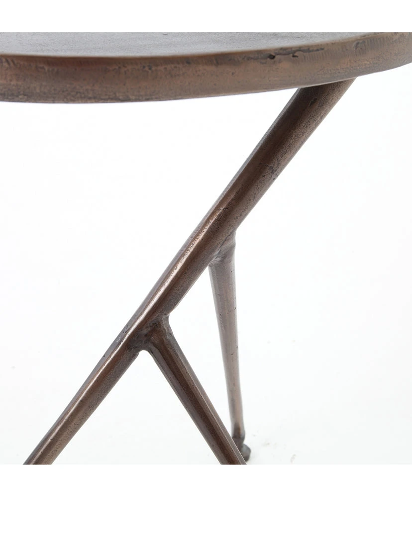 The tripod table with a cleverly balanced twist. Angular cast aluminum is finished in antique rust to bring out highs and lows. Great indoors or out – cover or store indoors during inclement weather and when not in use.