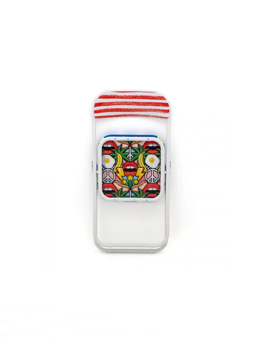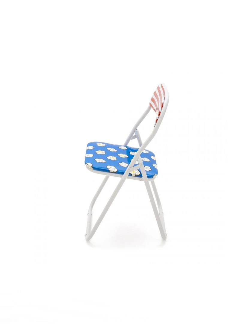 The unique creativity of Studio Job decorates the folding chairs with different images: Flash, Hot Dog, Egg, Mouth, Peace, Weed.