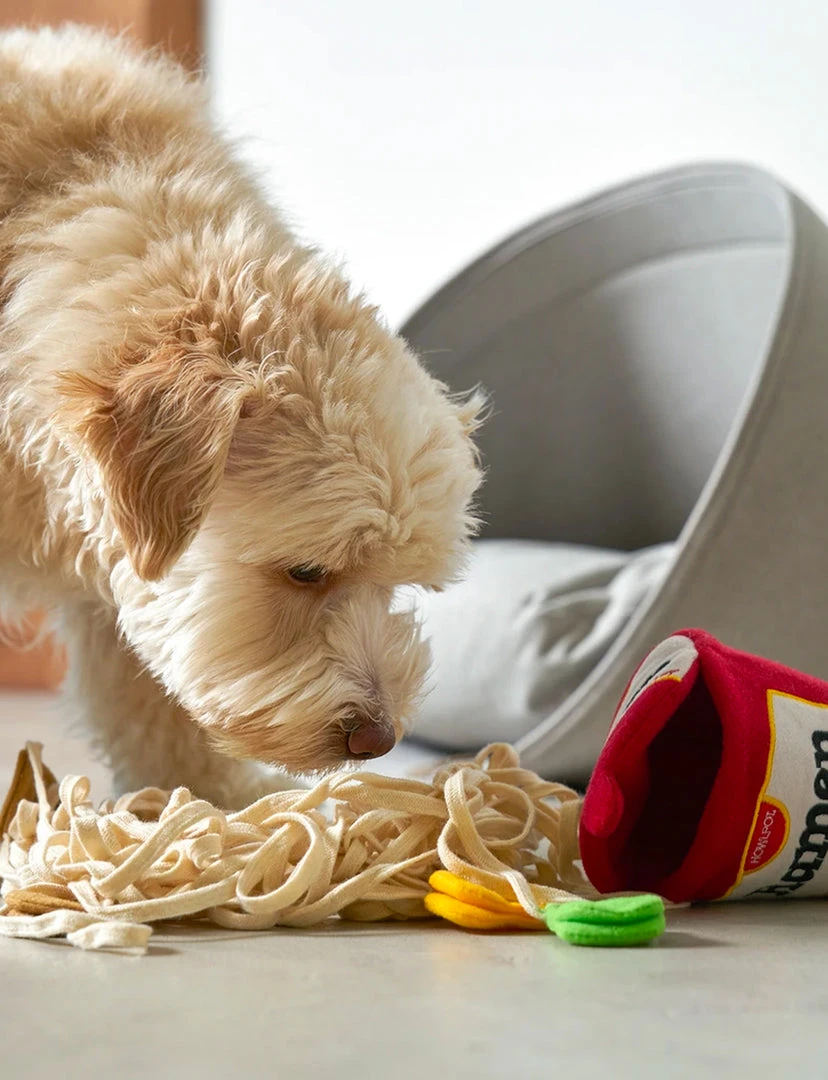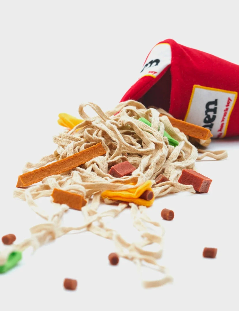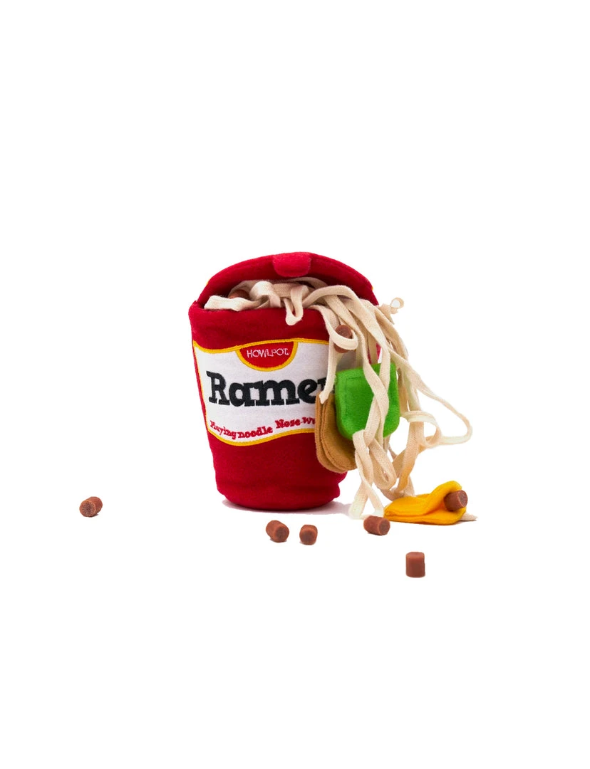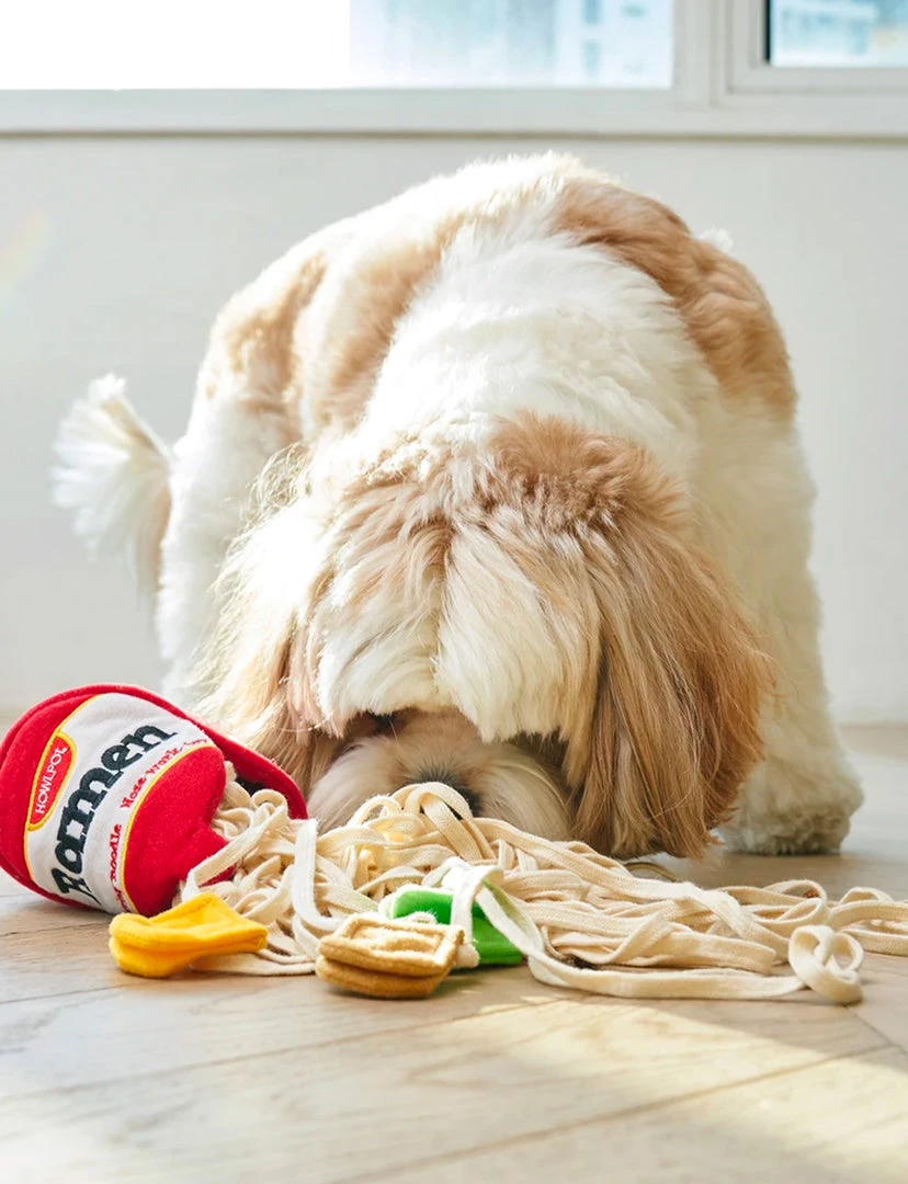 Ramen is a nose walk toy where pets find snacks through olfactory activities when they hide snacks between tangled noodles, meat, and vegetable topping pockets.