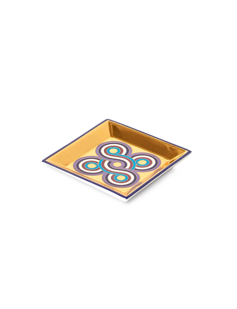 Mod patterns, heavenly hues. Treat your tablescape to our Milano trays, featuring concentric loops in cool blues and lavender on a warm gold backdrop. Crafted from high-fired porcelain.