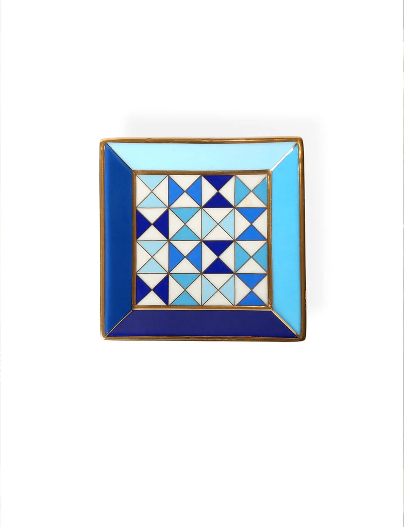 - High-fired porcelain with blue and shiny gold accents