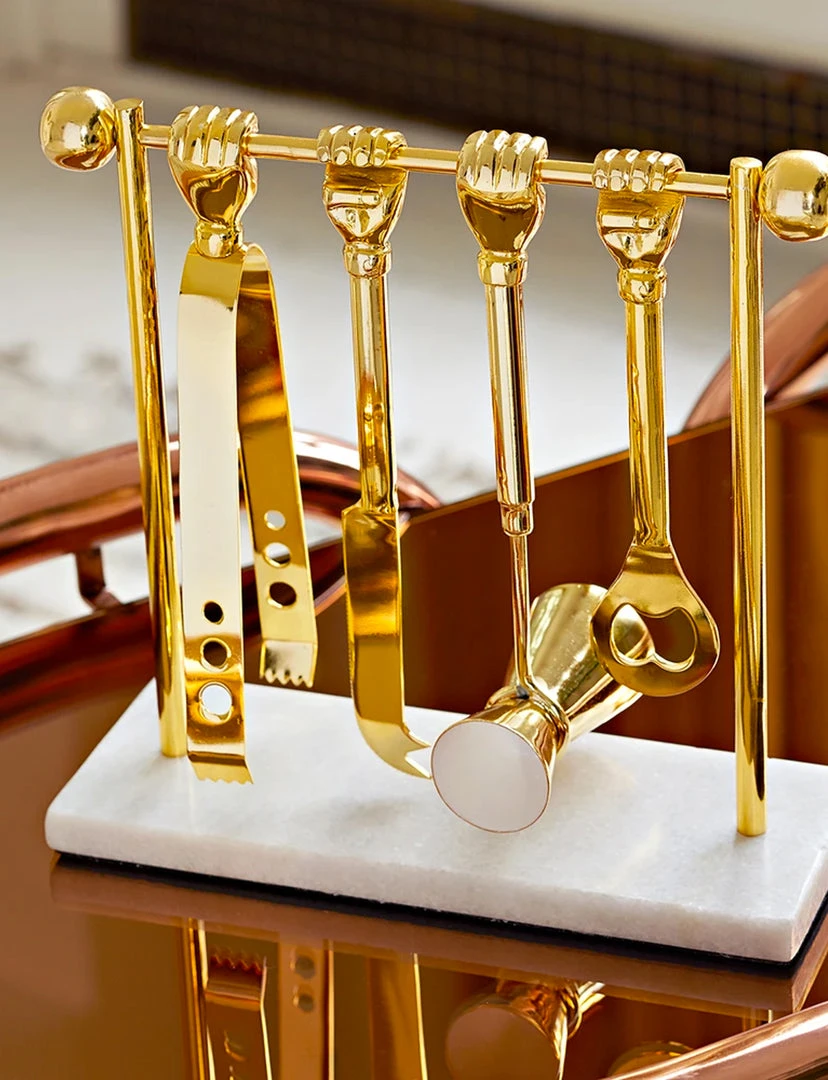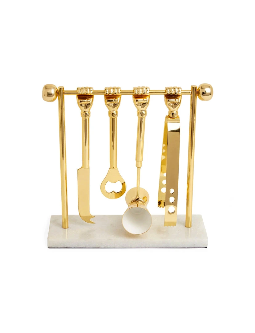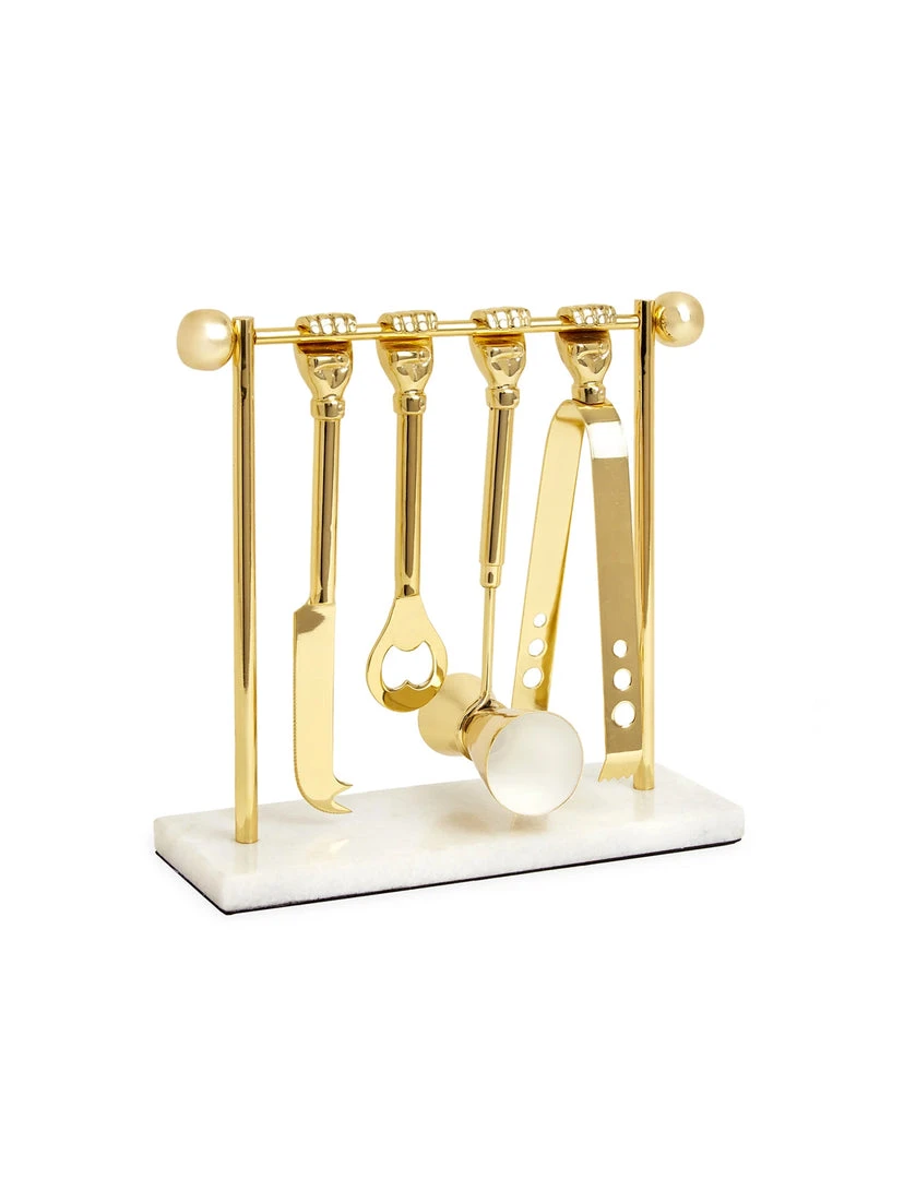 The perfect drink takes proper training. Inspired by the original workout gear—classic barbells—our brass bar tools latch onto a solid brass dumbbell elevated on a marble base. Includes ice tongs, a bottle opener, a double jigger, and a knife—each tool is finished with food-safe lacquer.