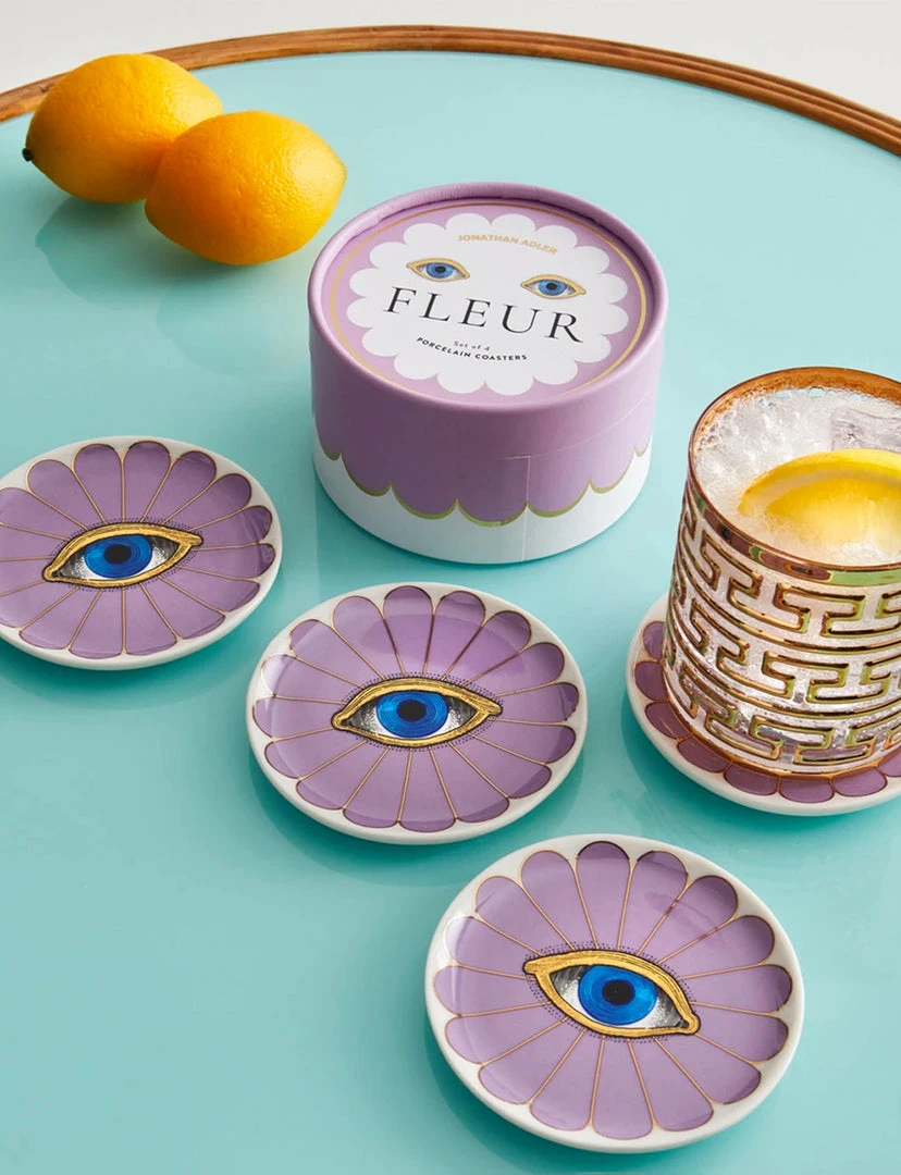Gold-lined baby blues blooming on a lavender petal backdrop are a sight for any stylish tablescape, and the perfect set of peepers for pepping up your cocktail hour. Packaged in a nifty gift box, our Fleur Coasters make the perfect hostess present (or pick-me-up for yourself).