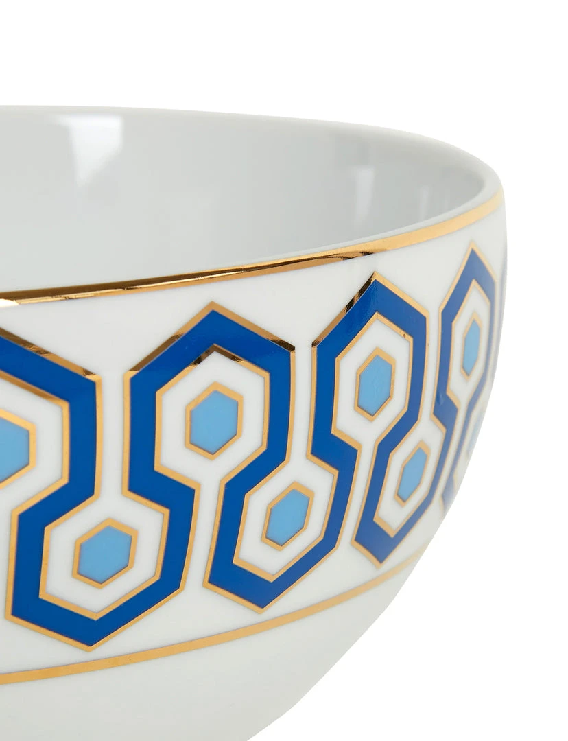 - High-fired porcelain with navy and blue in-glaze pattern and real gold detailing