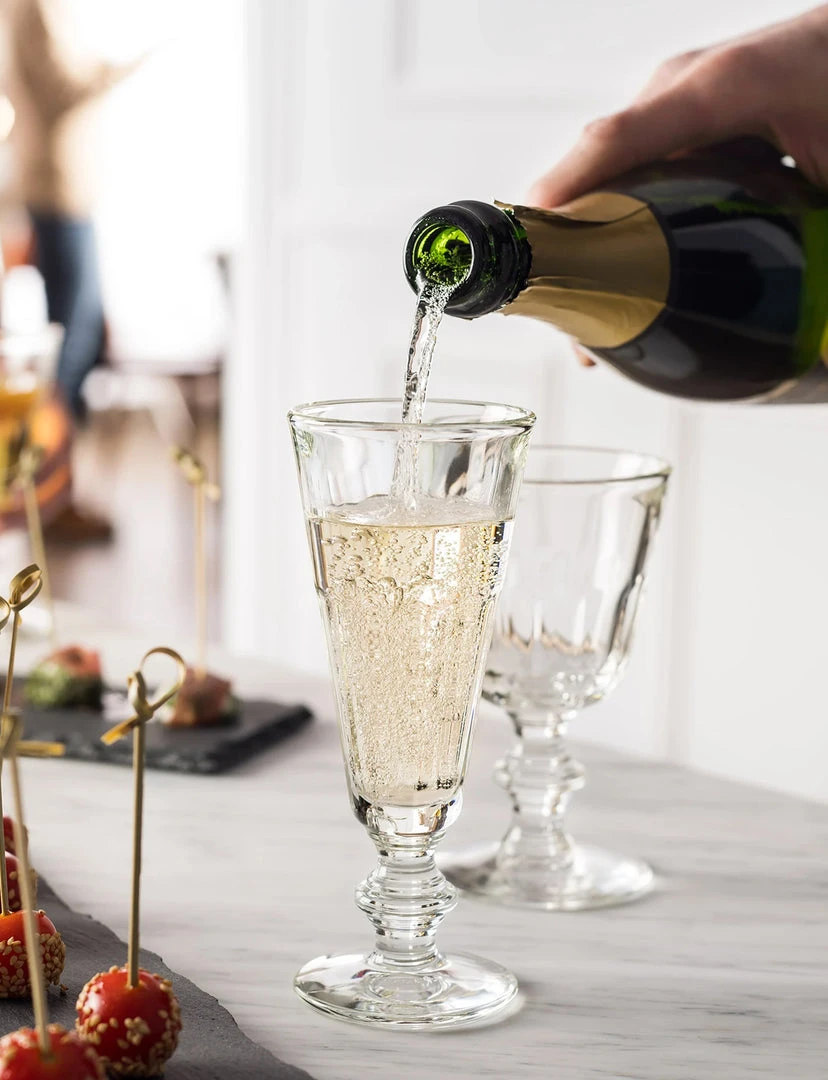 Perched on a distinctive hourglass-shaped stem, these champagne flutes have a French flair and sturdy design. The faceted flute catches and reflects light, offering a sparkling presentation for special occasions.