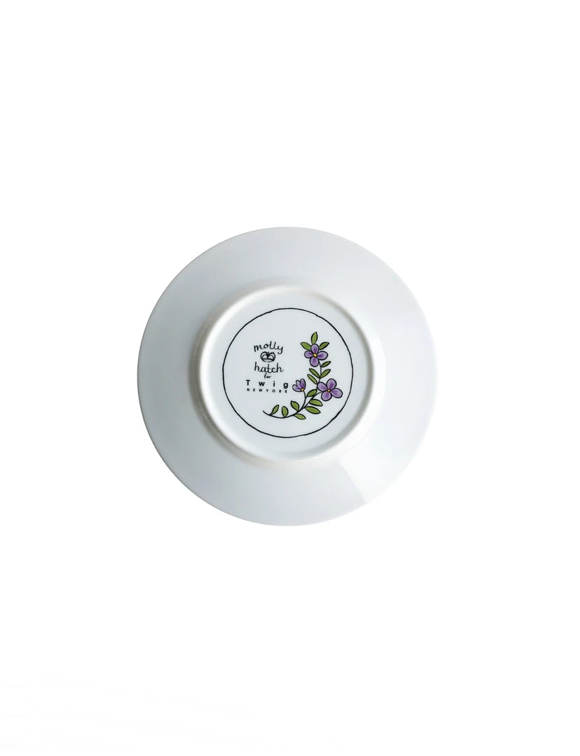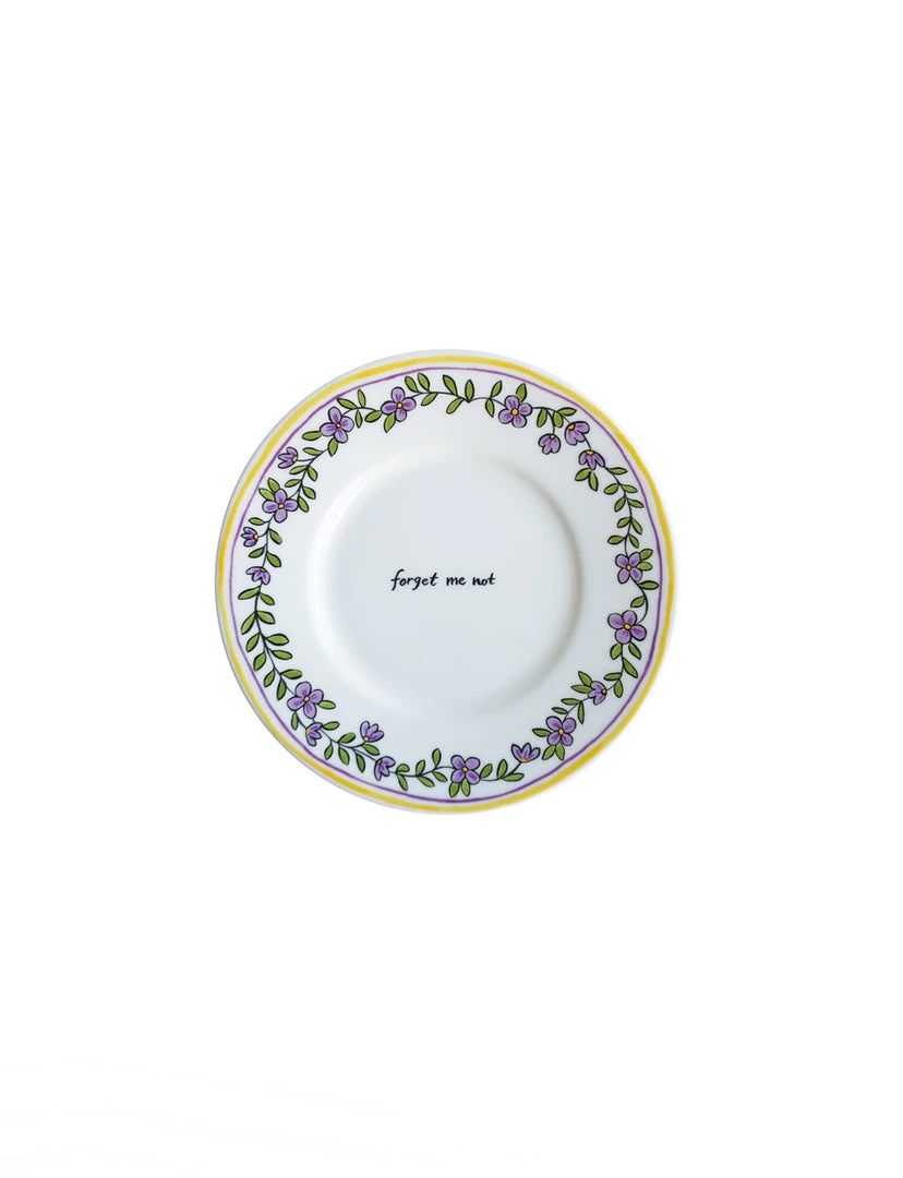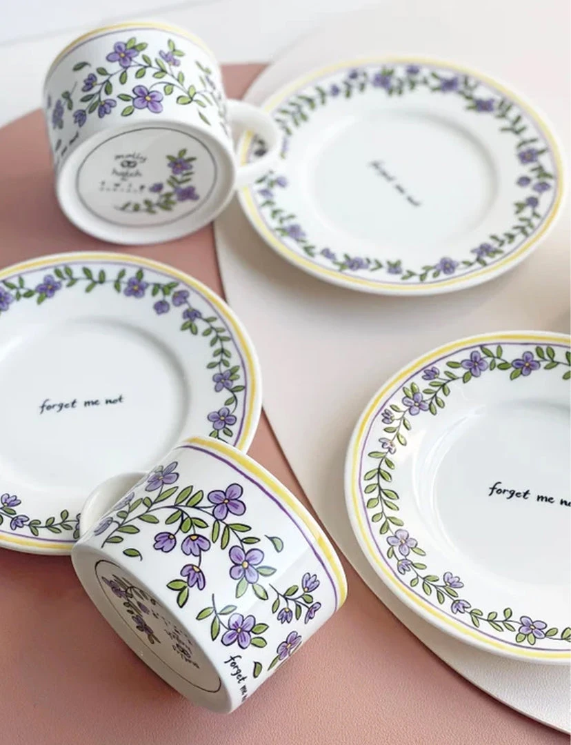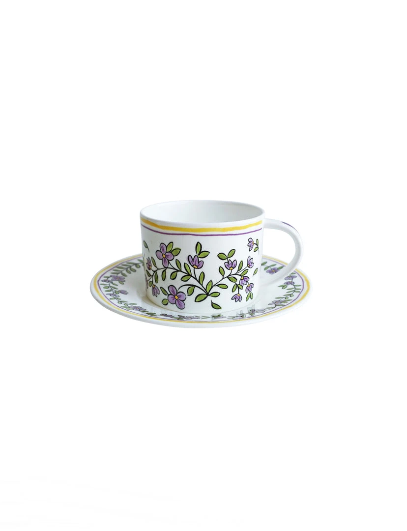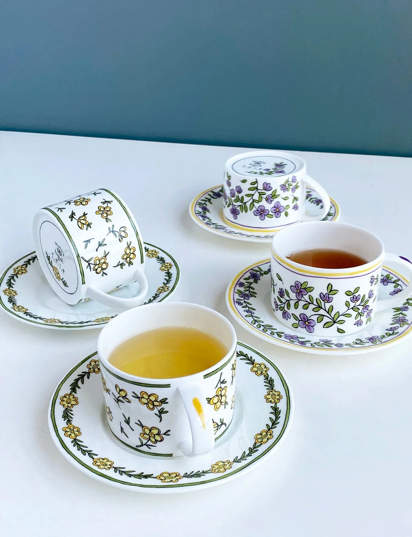 The Forget Me Not and Saucer. Celebrating the love between two individuals, inspired by the Forget Me Not plant and represented on Fine White Bone China. Decorated with a simple yellow border on both cup and saucer with the cup also featuring a floral pattern while the saucer features a chain of Forget Me Not plants. The hand applied decals are designed to have an embossed texture as if engraved for an added richness to the unique design. This cup and saucer is ideally sized for tea or for a small coffee served in style. Celebrating love and flowers in the Forget Me Not Collection by Twig New York.