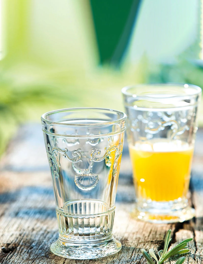 Elevate your tabletop style with these decorated tall iced tea glasses. Each glass is adorned with a shell and flower motif accompanied by an elegant faceted skirt base that radiates iconic French style.