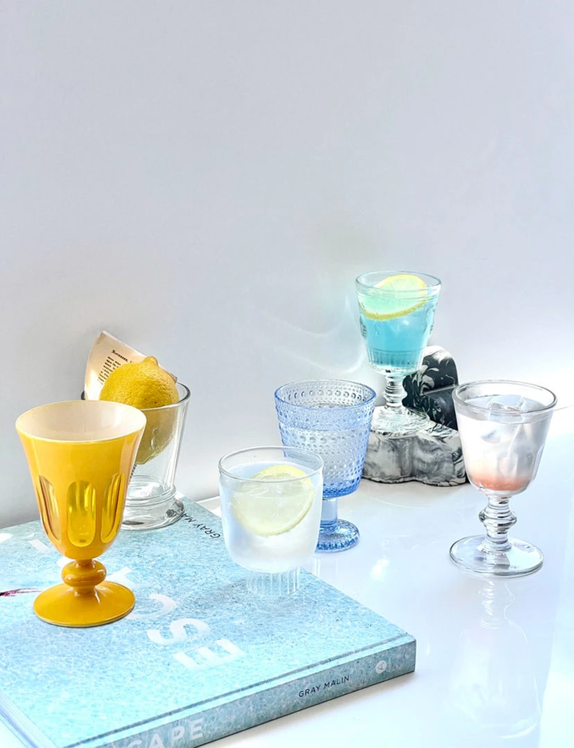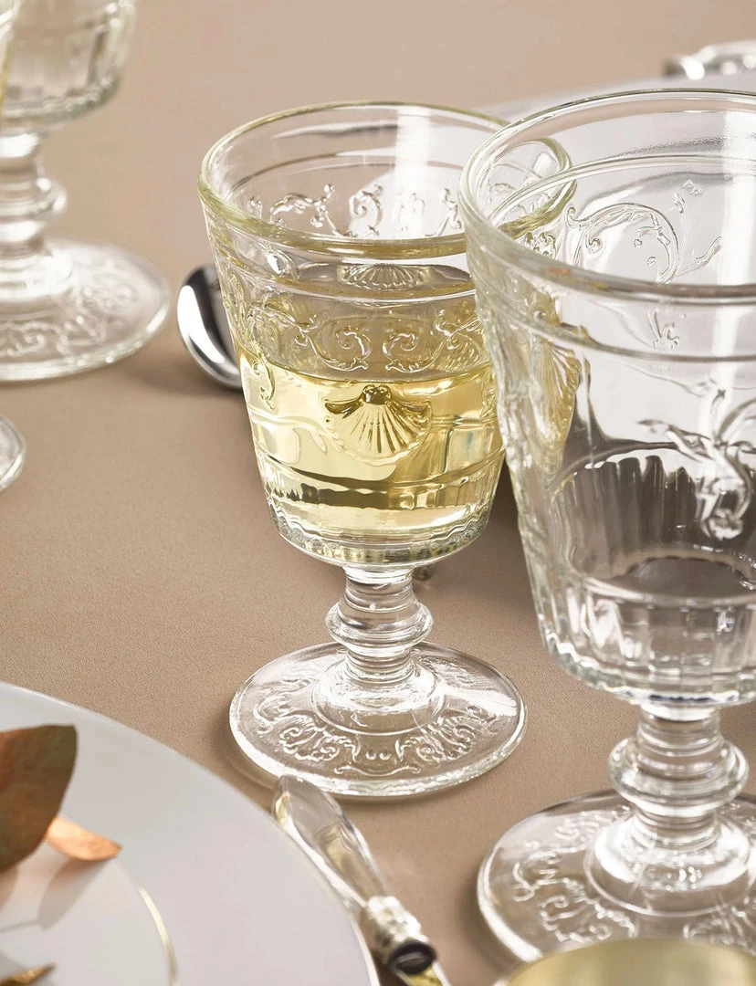 These exquisite wine glasses are embellished with an intricate shell and flower motif and a faceted base that catches and reflects light. Its squared silhouette is inspired by iconic glassware designs from the palace of Versailles.