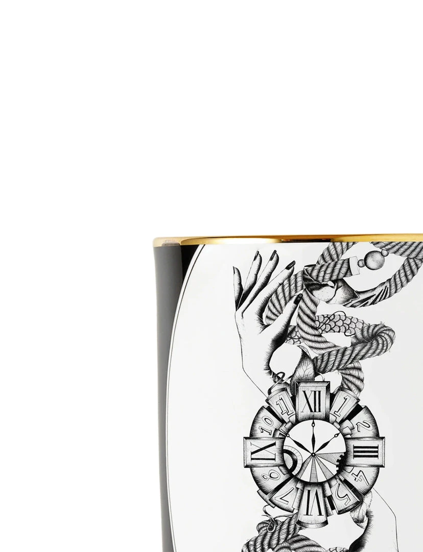 Bizarrely-elegant and steeped in dreams, The Divineness of Time explores musings on the passing of hours. Intangible, unstoppable, never slowing, always moving, discarded by some yet yearned for by others… These are some of the reveries inspiring this intriguing design. The grasping hands and convulsing rope are symbols of Time’s persistence and unyielding nature.