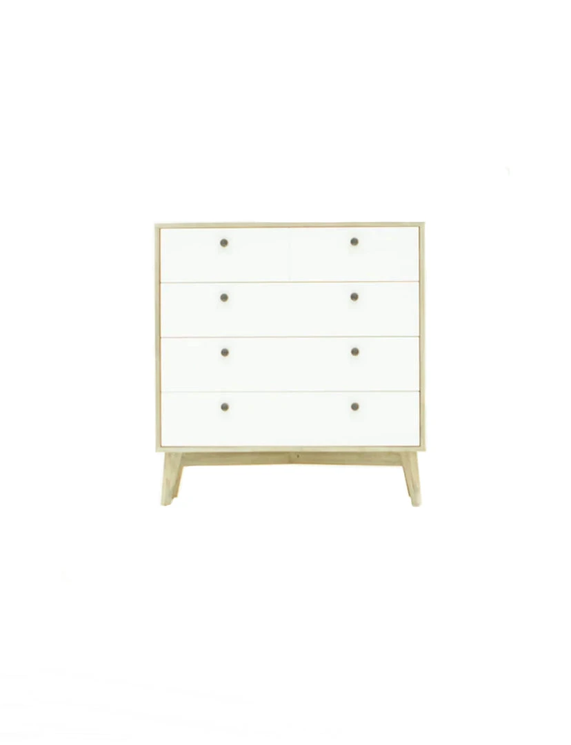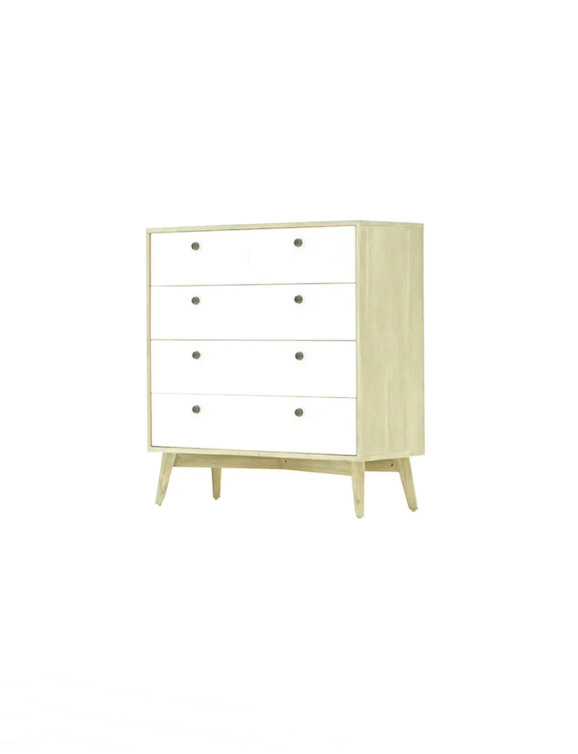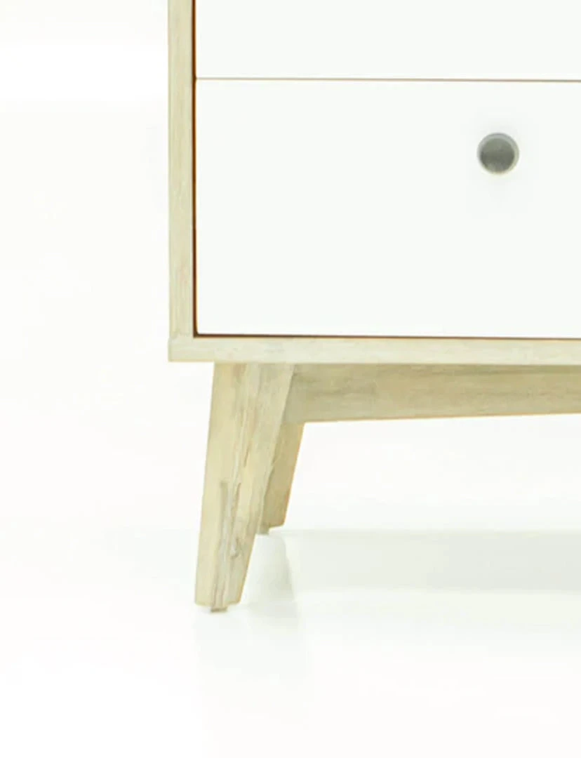 Goodbye basic, hello trending. This Anna chest will transform your space with its tapered legs, clean-lines, and light driftwood finish, that beautifully compliments the white drawers. Maximize your space with the additional storage and small metal knobs that complete this streamlined look.