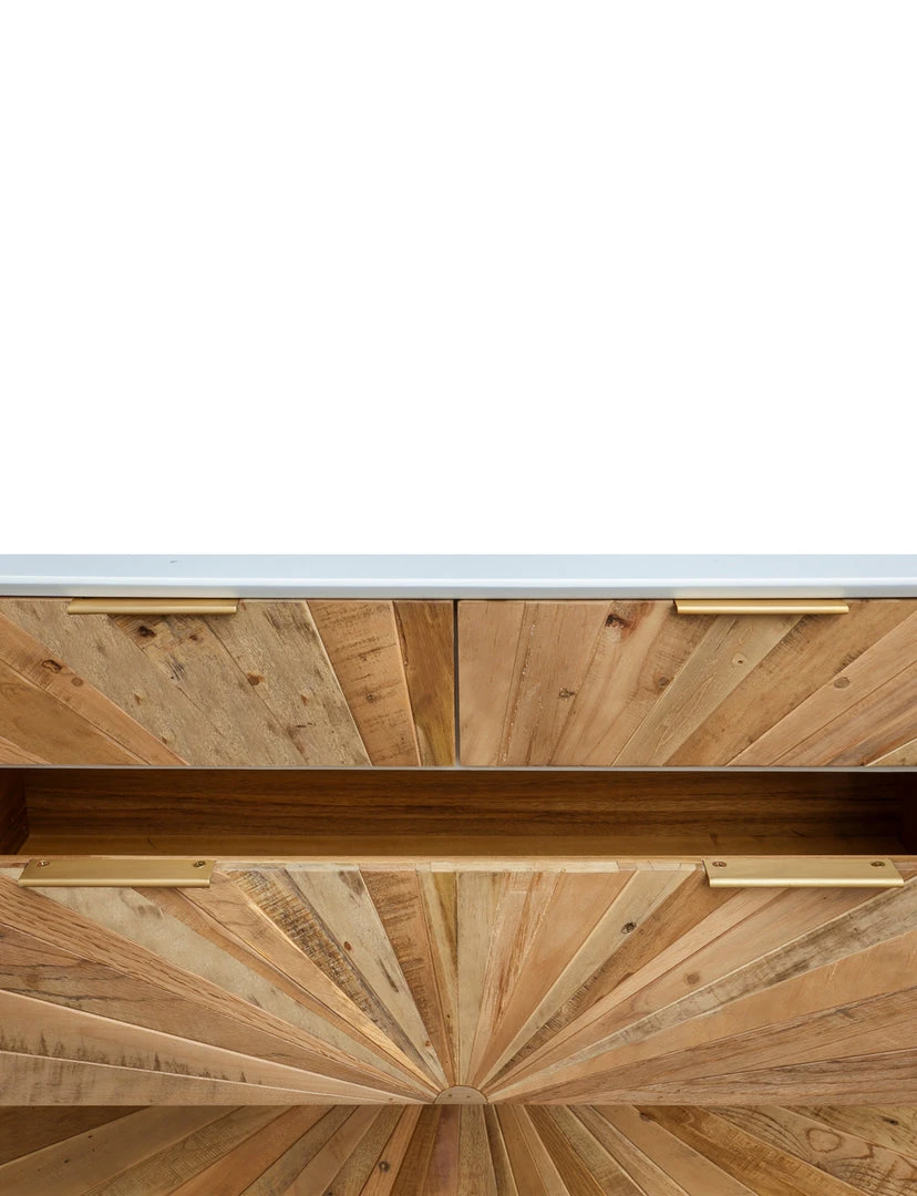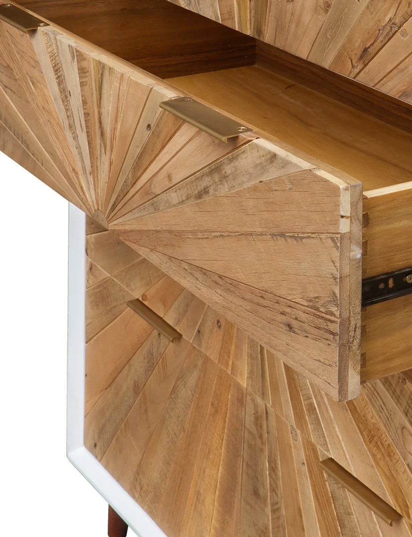 The Claudia Chest features a white lacquer frame, 5 drawers with hand pulls, and tapered legs. It is made of reclaimed Pallet wood and can be a perfect choice for any bedroom.