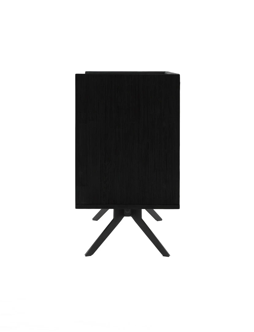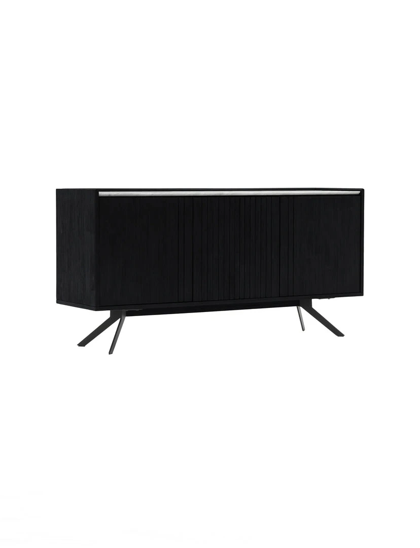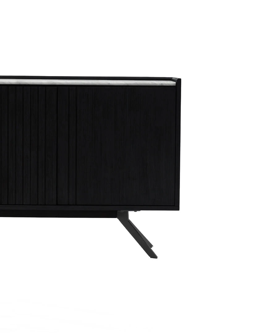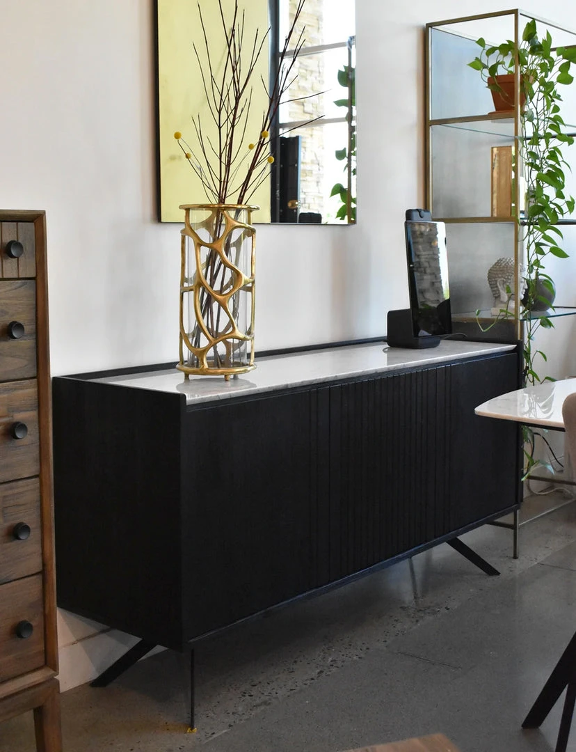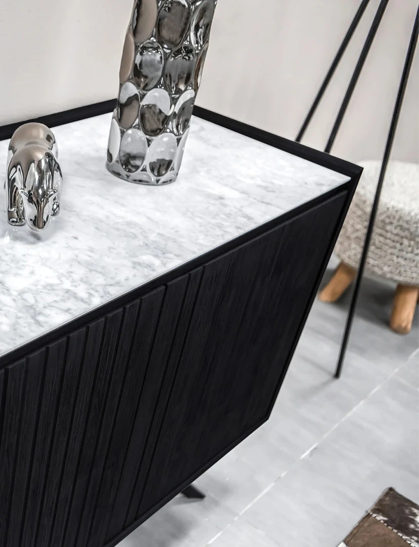 A deep black finish contrasts with the stark white top to give this sideboard a unique and striking look. The wood used for this piece comes from acacia trees native to Australasia while the top is carved from Carrera marble sourced in Italy. This piece combines traditional and natural materials with a modern design and sturdy craftsmanship.