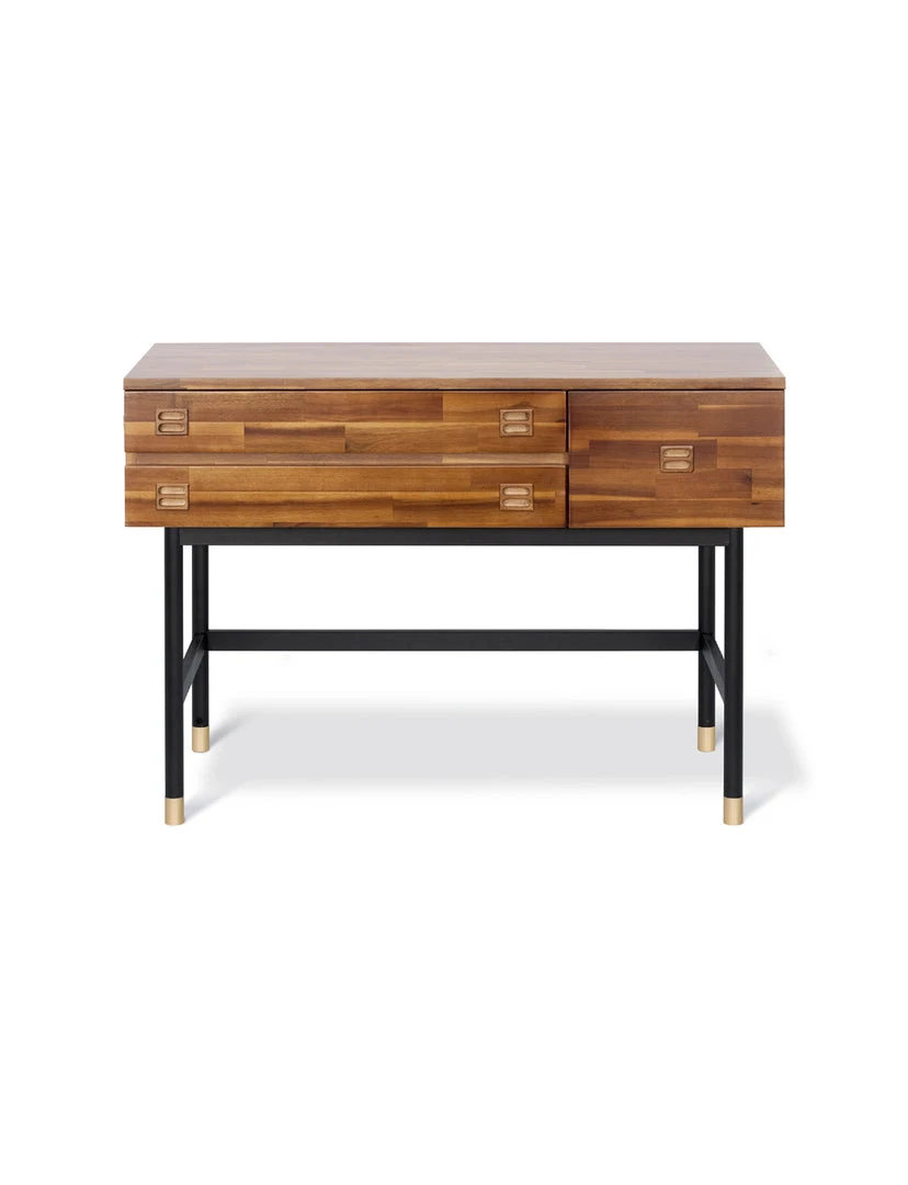A no-nonsense vanity featuring a solid acacia wood body and black powder coated legs with gold tubes at their feet. There are three drawers – two on the left with the top drawer having compartments, and a third larger drawer on the right – for ample storage of knickknacks.