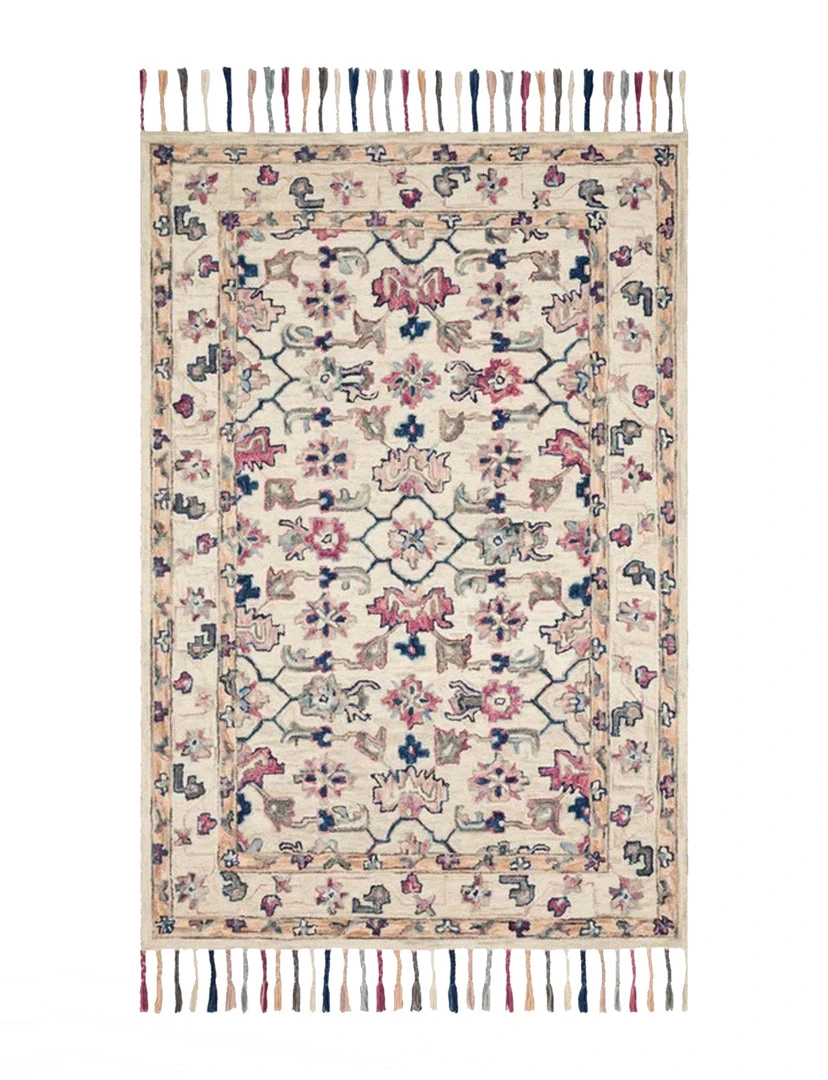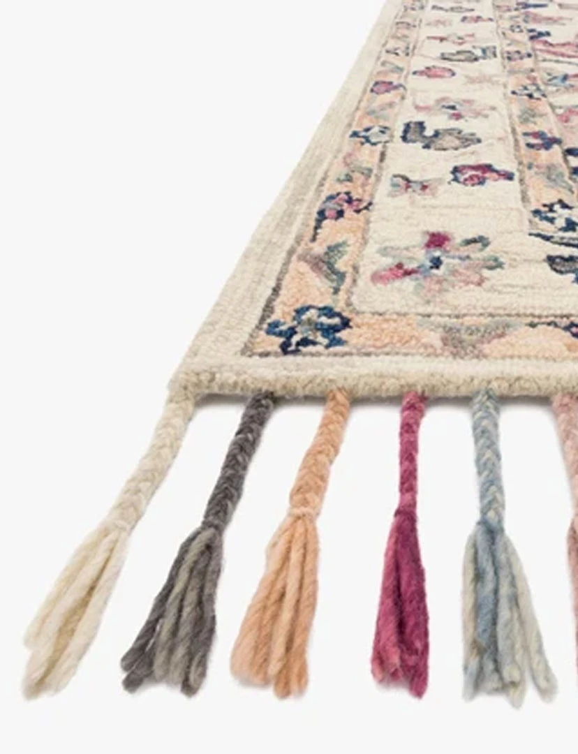 Hooked of 100% wool by skilled artisans in India, this Esmeralda Rug is soft to the touch and displays whimsical floral motifs complemented by luxurious, braided tassels to perfectly complement any space.