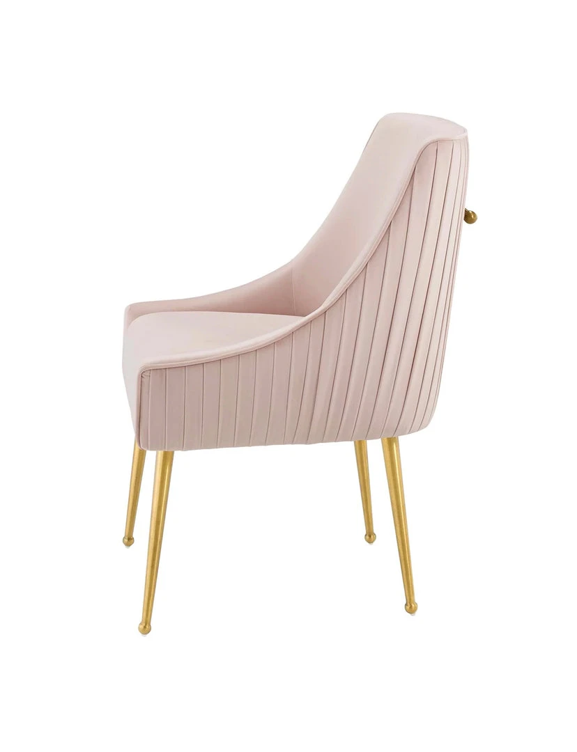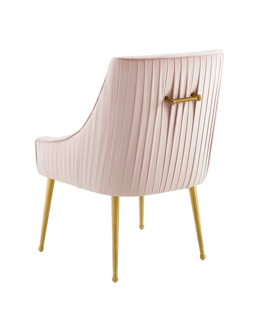 Gently sloping arms cascade down from the flowing design of the Disney Dining Chair. Solidly constructed from wood and plywood, Disney comes with dense foam padding upholstered in stain-resistant performance velvet. Complete with splayed brushed gold stainless steel legs and matching decorative handle on the back of the chair, Disney is a soft and durable addition to the dining room, kitchen entryway, living room, bedroom, home office, or vanity. Create a cozy seating experience with this versatile dining accent chair with non-marking foot caps.