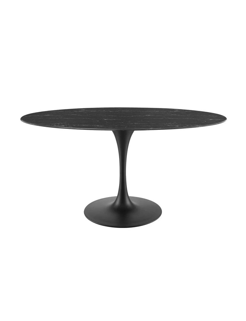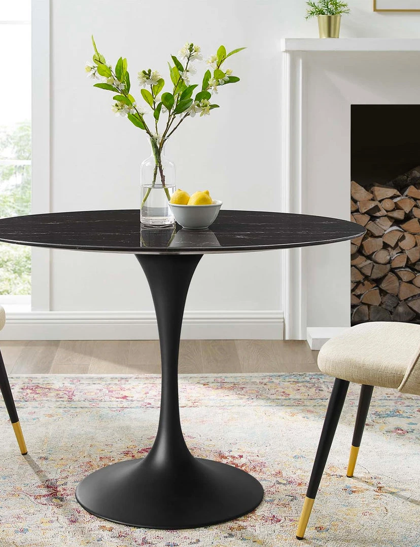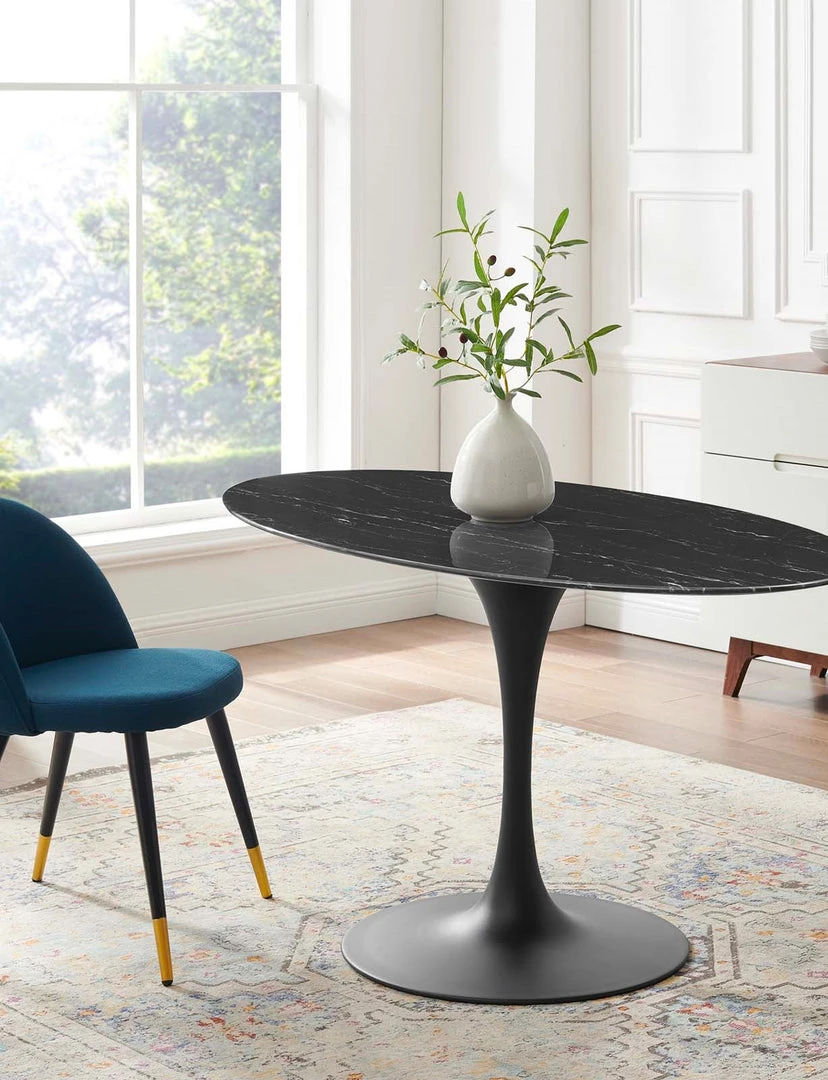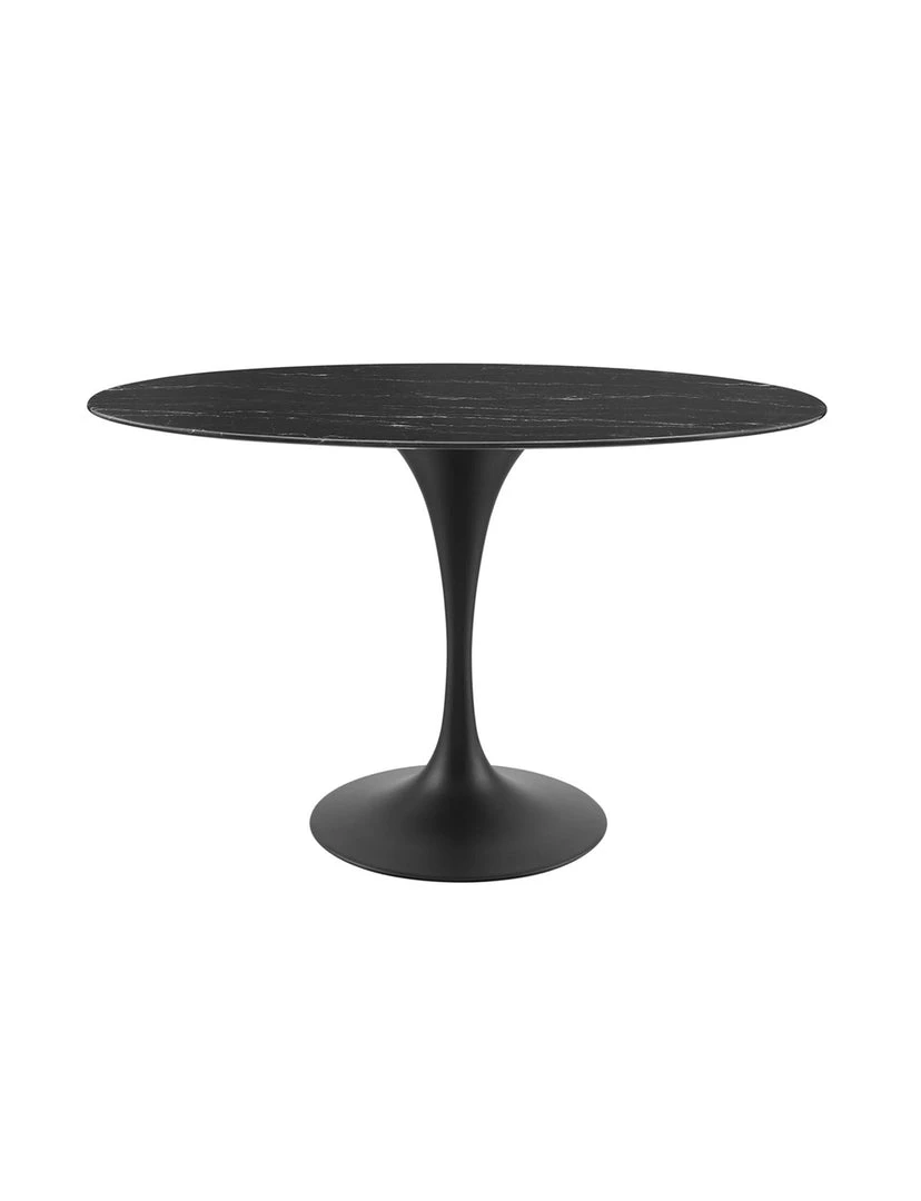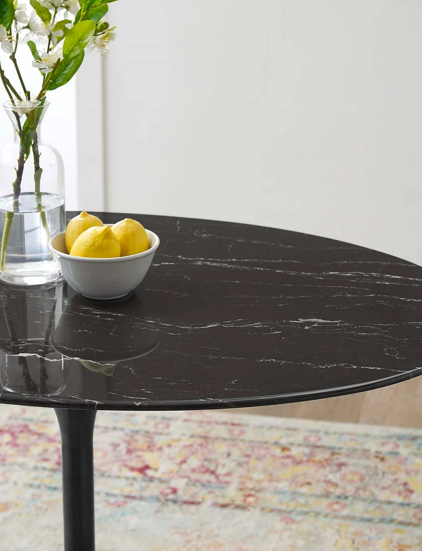 Reflecting a seamless organic shape and timeless form, the Lily Table has become a symbol of modernism for over the past 60 years. Before its release, homes were filled with clunky remnants of an industrial age long gone by. But in order to advance into the new world, homes first had to transition from the traditional square table, into a piece that connoted progress. The base and dimensions are true to the original specifications, while the table’s circular marble top, and tapered metal base, are carefully lacquered with a scratch and chip resistant finish.