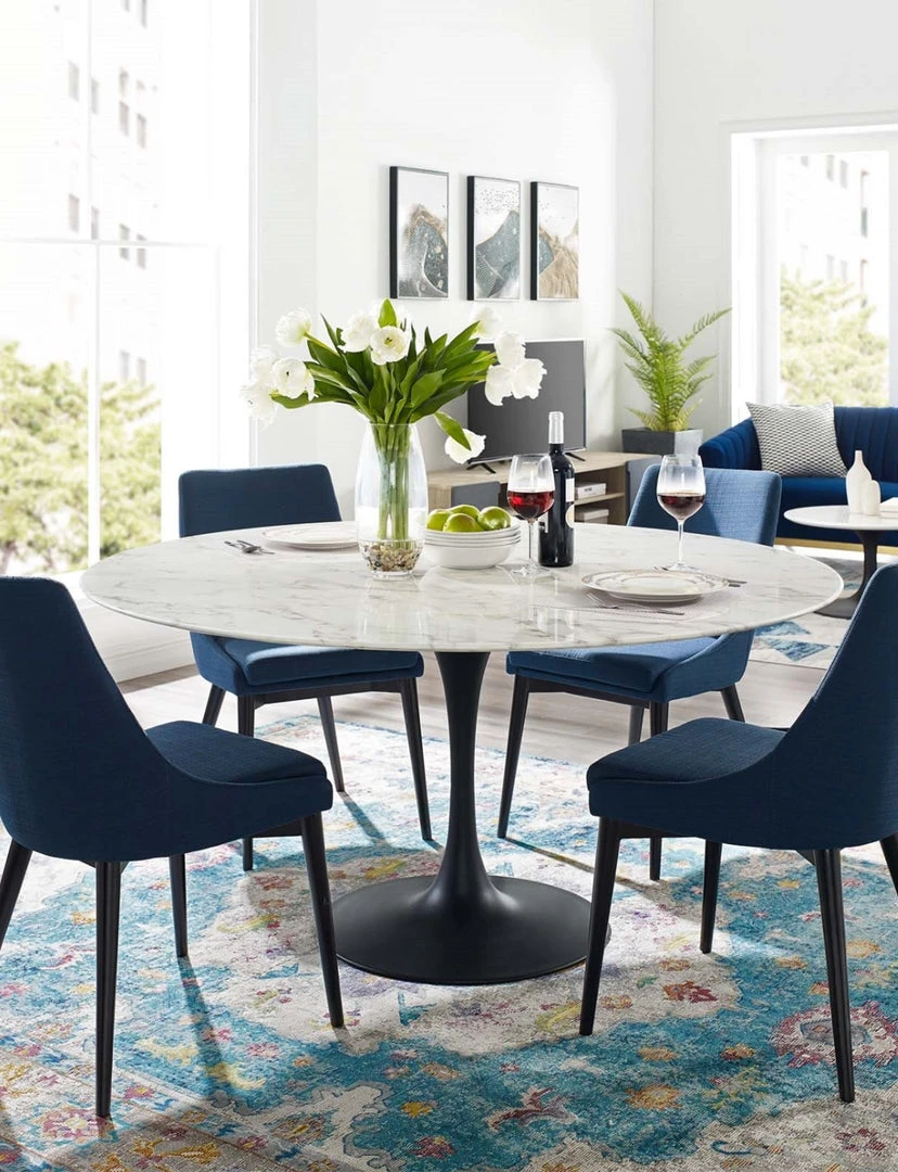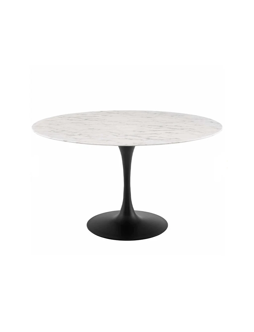 Reflecting a seamless organic shape and timeless form, the Lily Table has become a symbol of modernism for over the past 60 years. Before its release, homes were filled with clunky remnants of an industrial age long gone by. But in order to advance into the new world, homes first had to transition from the traditional square table, into a piece that connoted progress. The base and dimensions are true to the original specifications, while the table’s circular marble top, and tapered metal base, are carefully lacquered with a scratch and chip resistant finish.