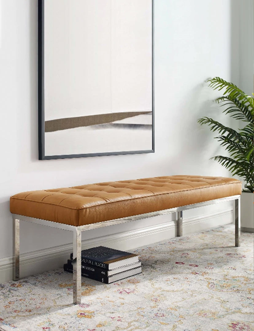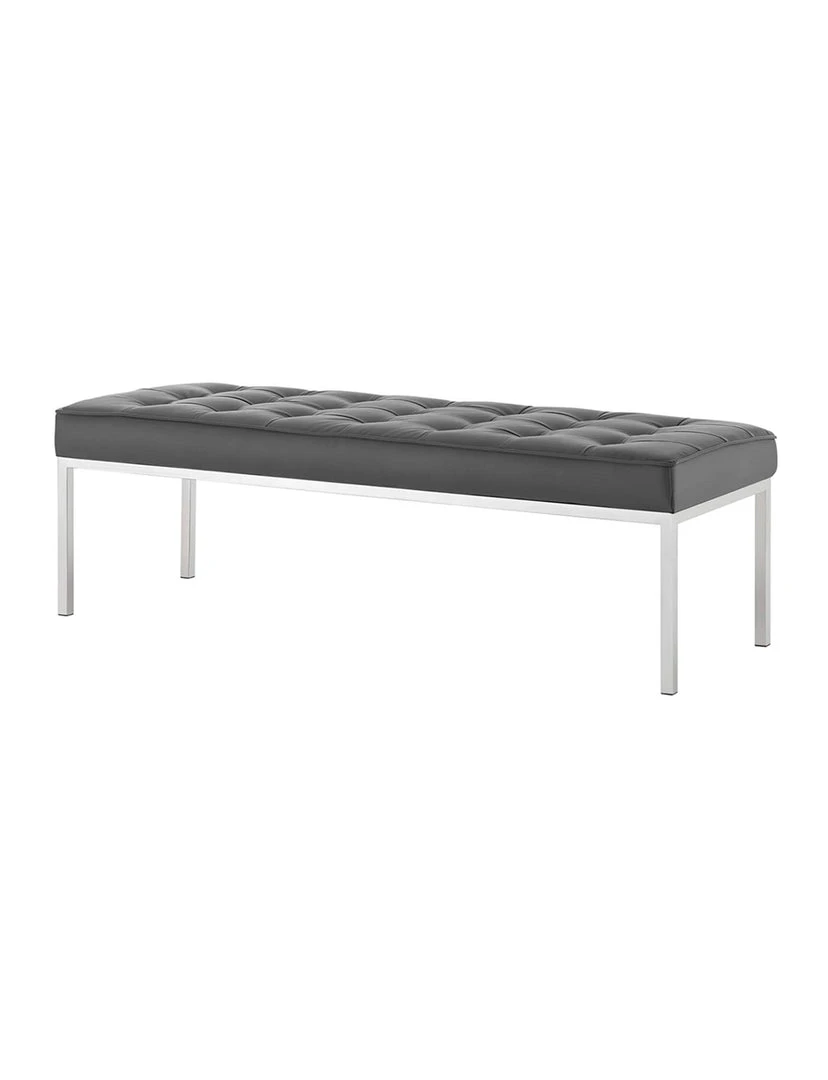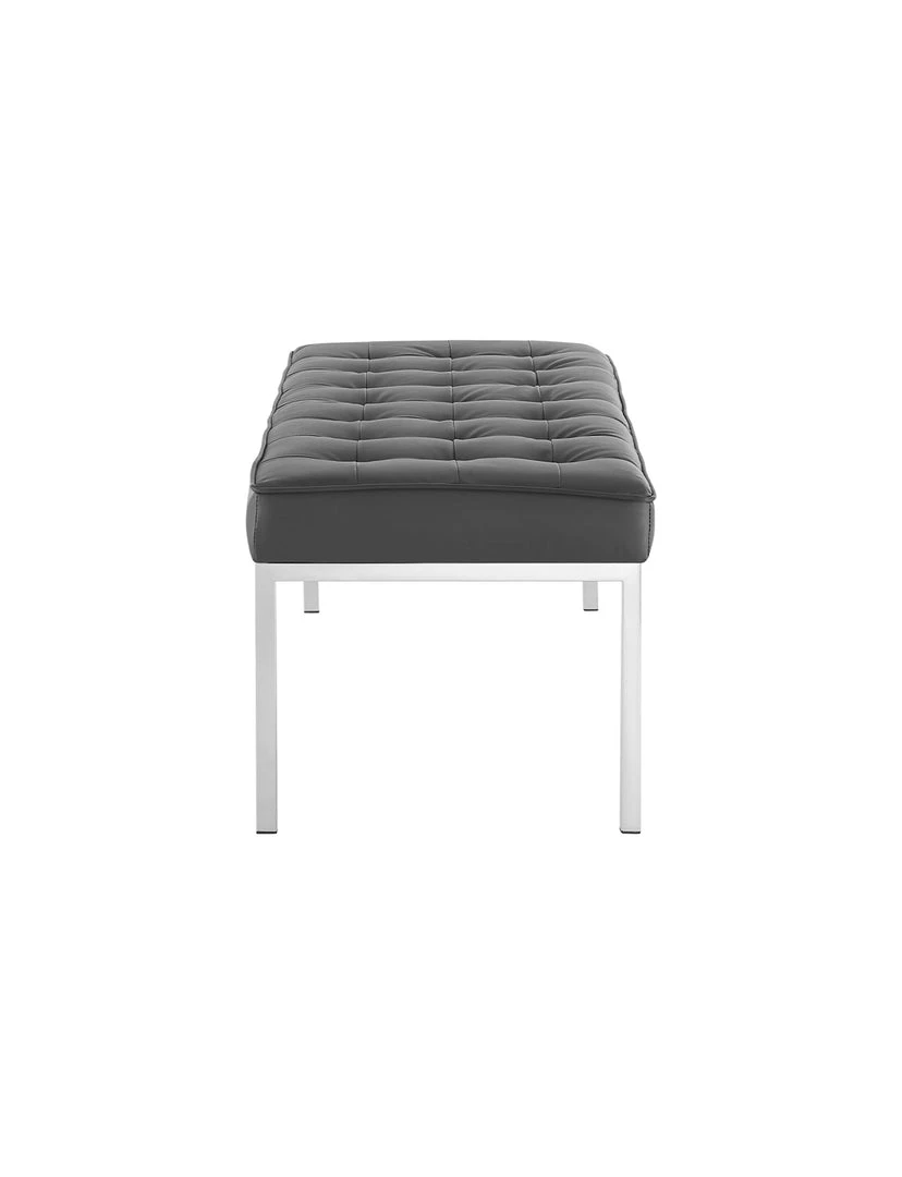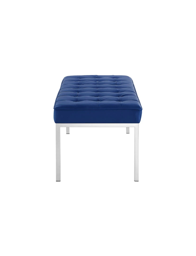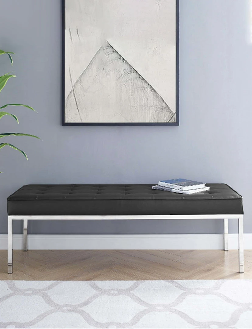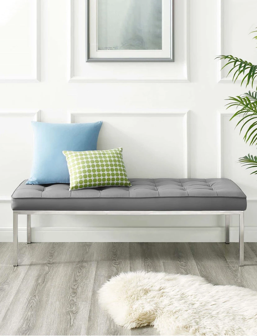 Revolutionize your living room furniture with the iconic Loft Tufted Button Faux Leather Accent Entryway Bench. Adding visual depth to your living room or lounge space, Loft features soft and durable faux leather upholstery accented in elegant button tufting. This modern living room accent bench comes in a captivating linear design with an external tubular stainless steel frame, four stainless steel silver legs, and non-marking foot caps. Inspired by the richness of mid-century modern style, Loft is the preferred choice of living rooms and lounge spaces. Bench Weight Capacity: 300 lbs.
