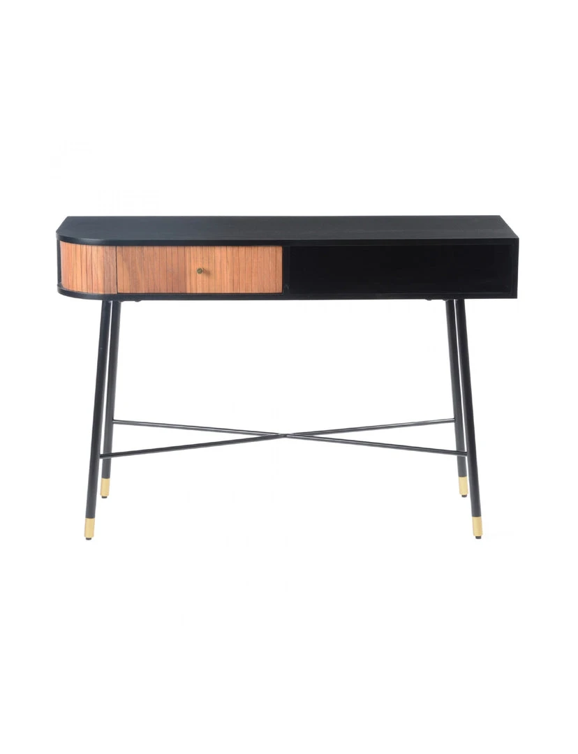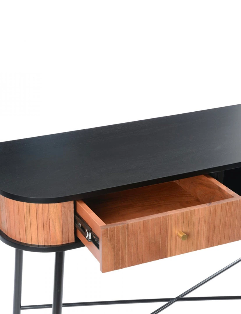 A wood and iron affair. The Bezi console table adds character to your home with its curved side, single drawer, and pinstriped detailing. Natural wood grain and knots give its iron frame and brass detailing a down-to-earth feel.