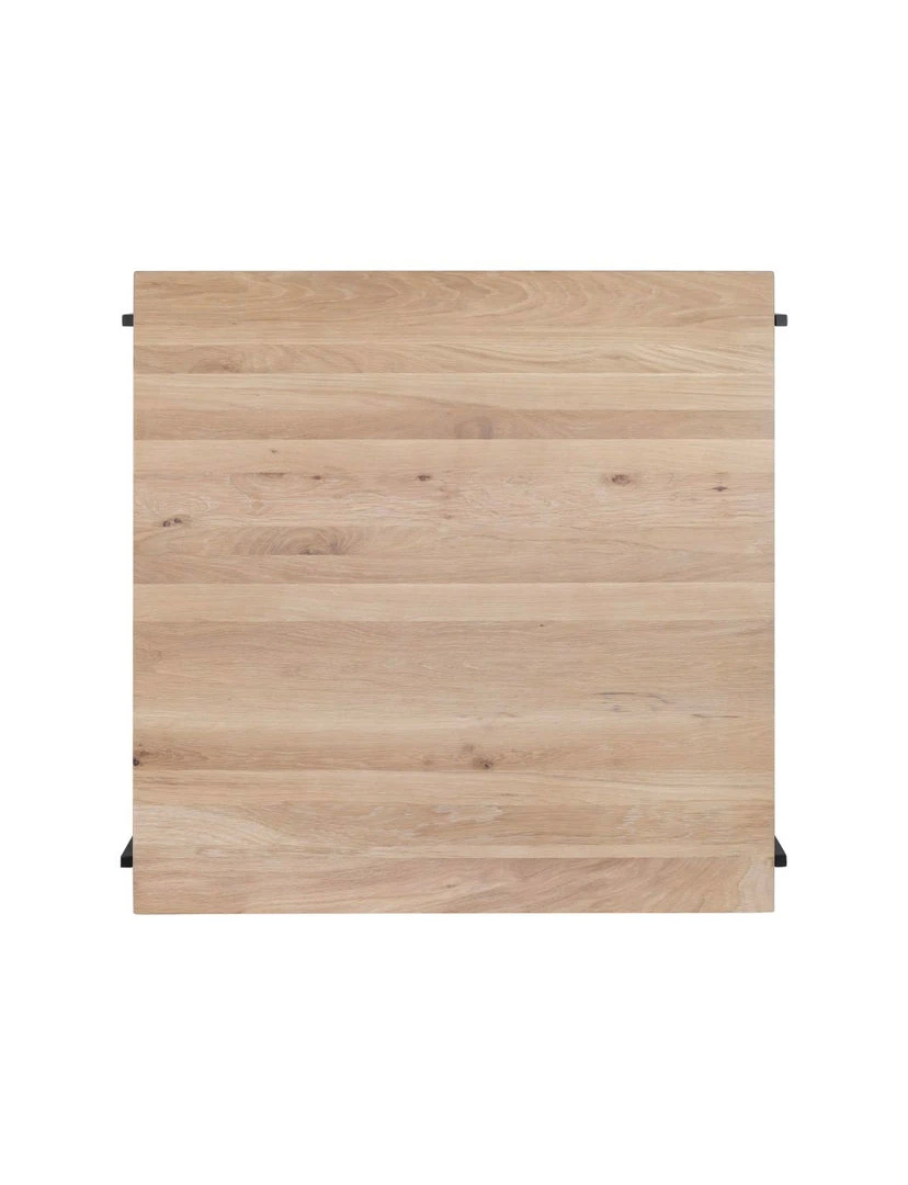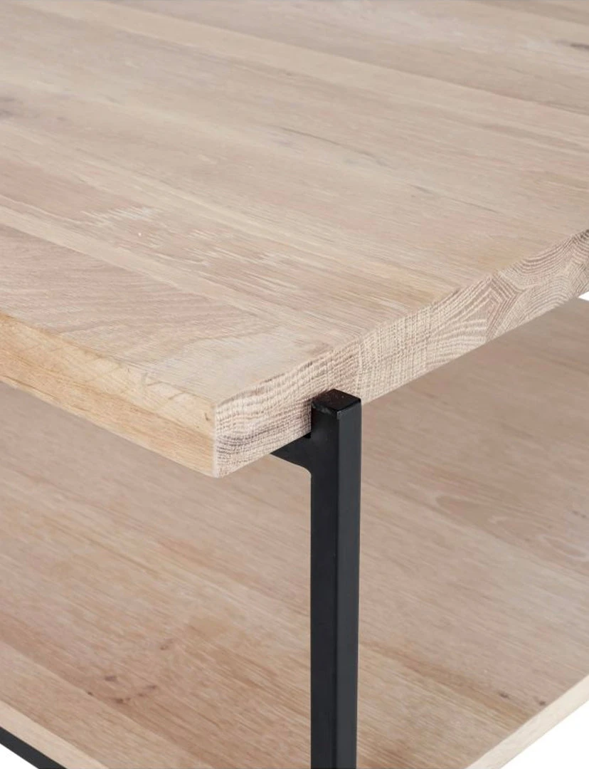 A scandinavian chic. The Mai Coffee Table is constructed in a richly textured solid oak table top that features its own unique knots, whorls, and woodgrain supported by strong metal legs giving it an industrial aesthetic. With two tiers, it comfortably fits all of your treasures from magazines to TV remotes to accent pieces.