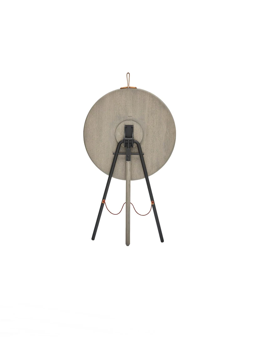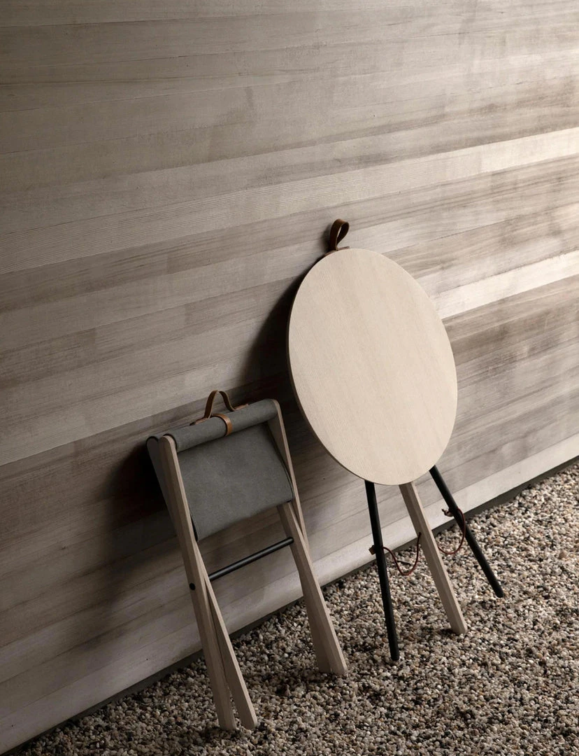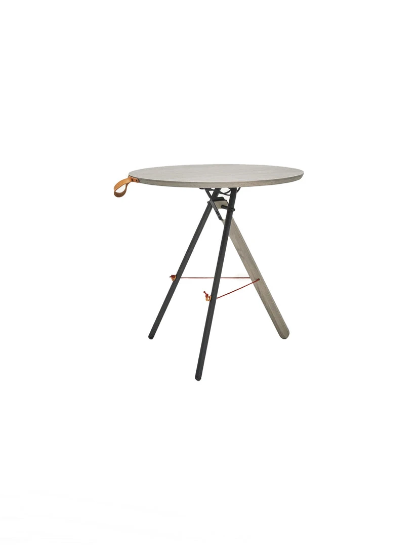 Beauty and brains work hand in hand: this Folding Café Table brings the best of both into a sophisticated yet highly functional design. Unapologetically useful, inspired by turn of the century Campaign Furniture, the table’s structural aspects are also its strongest design features. Ash edging supports a linoleum surface, with a material follow-through in one wooden leg complemented by steel props. A leather strap makes for easy handling.