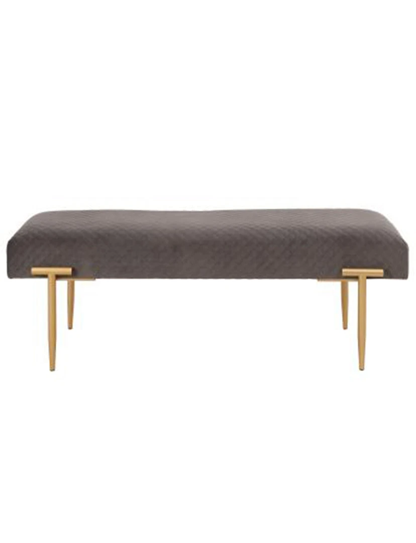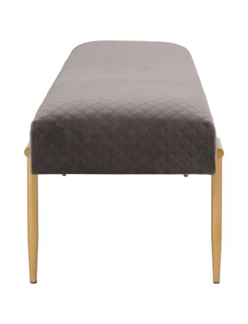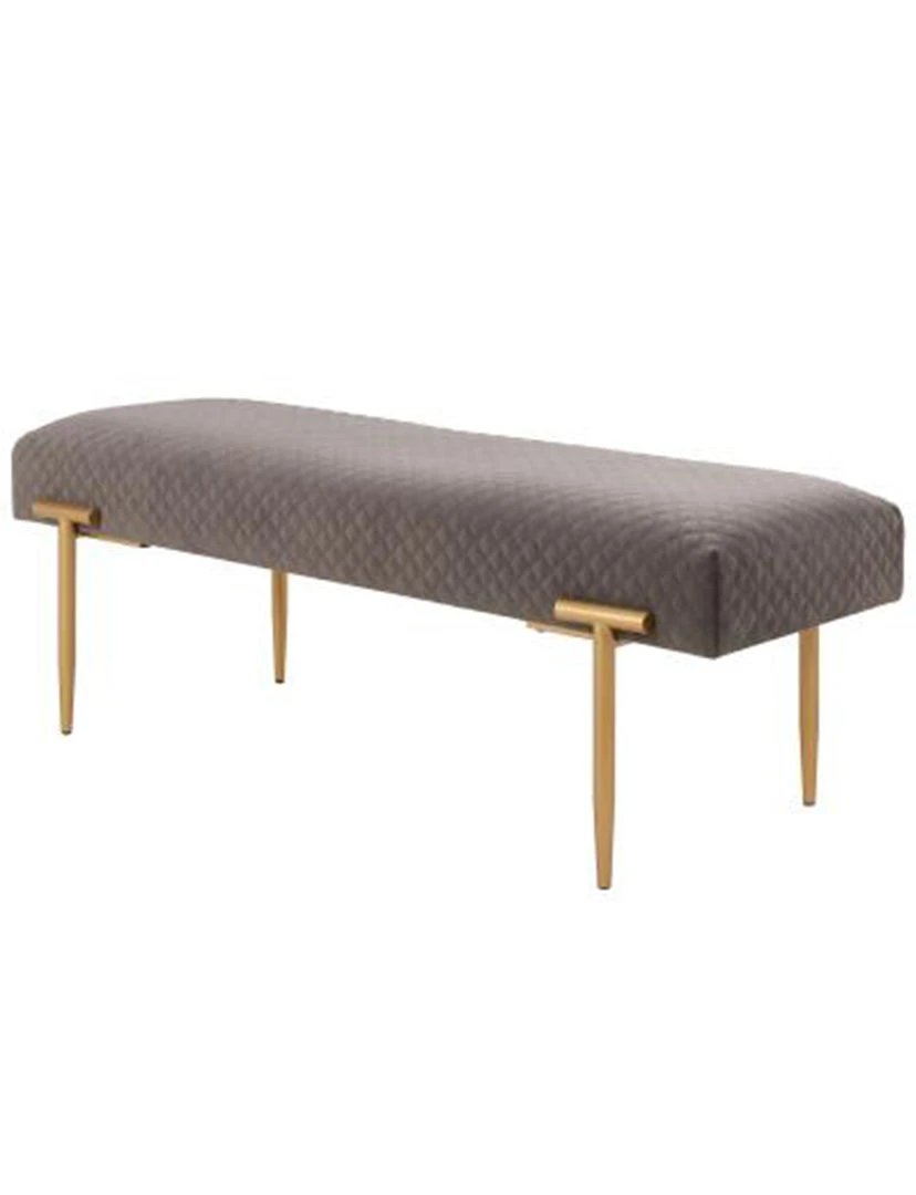 Glam up your space with Clarinet bench in luxe velvet upholstery featuring diamond quilted and stylish gold painted steel legs; providing an elegant sophistication to your living or bed room.