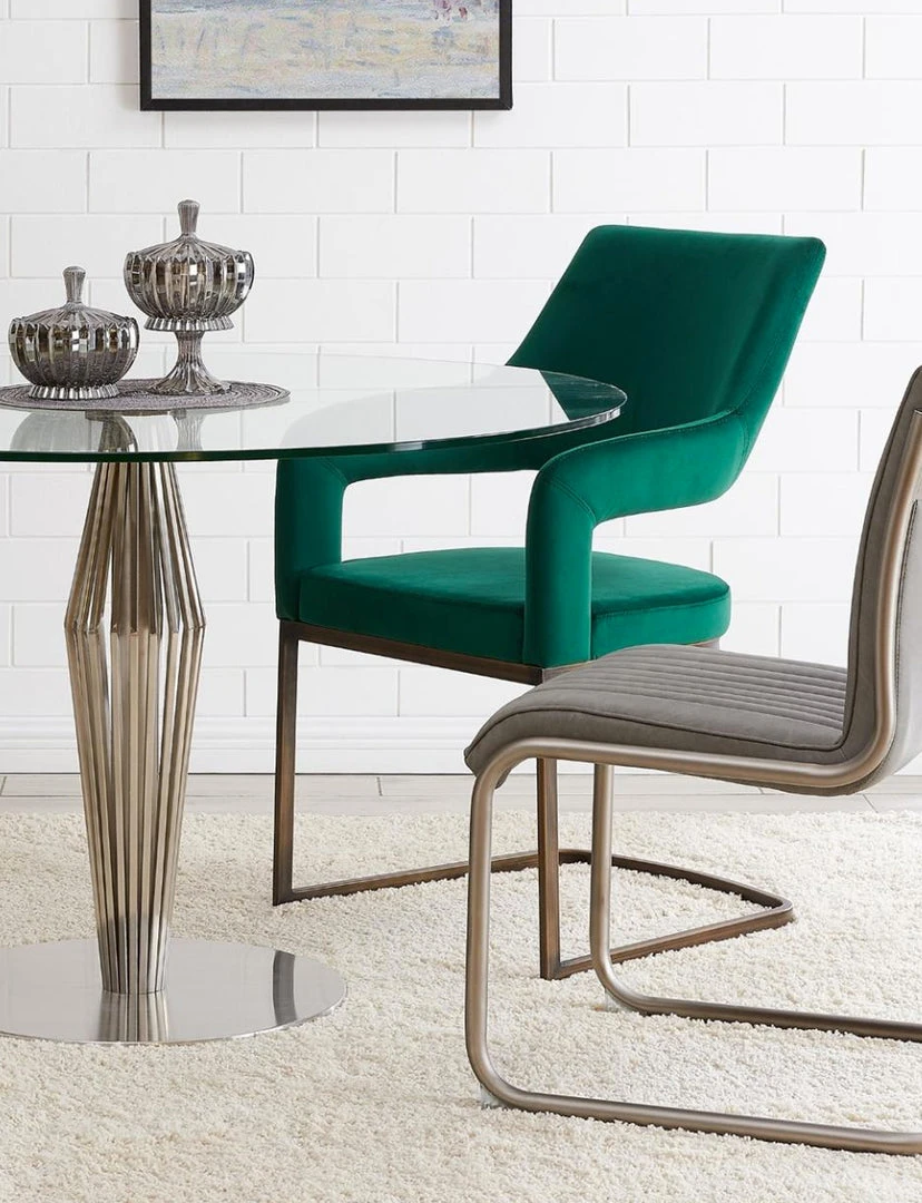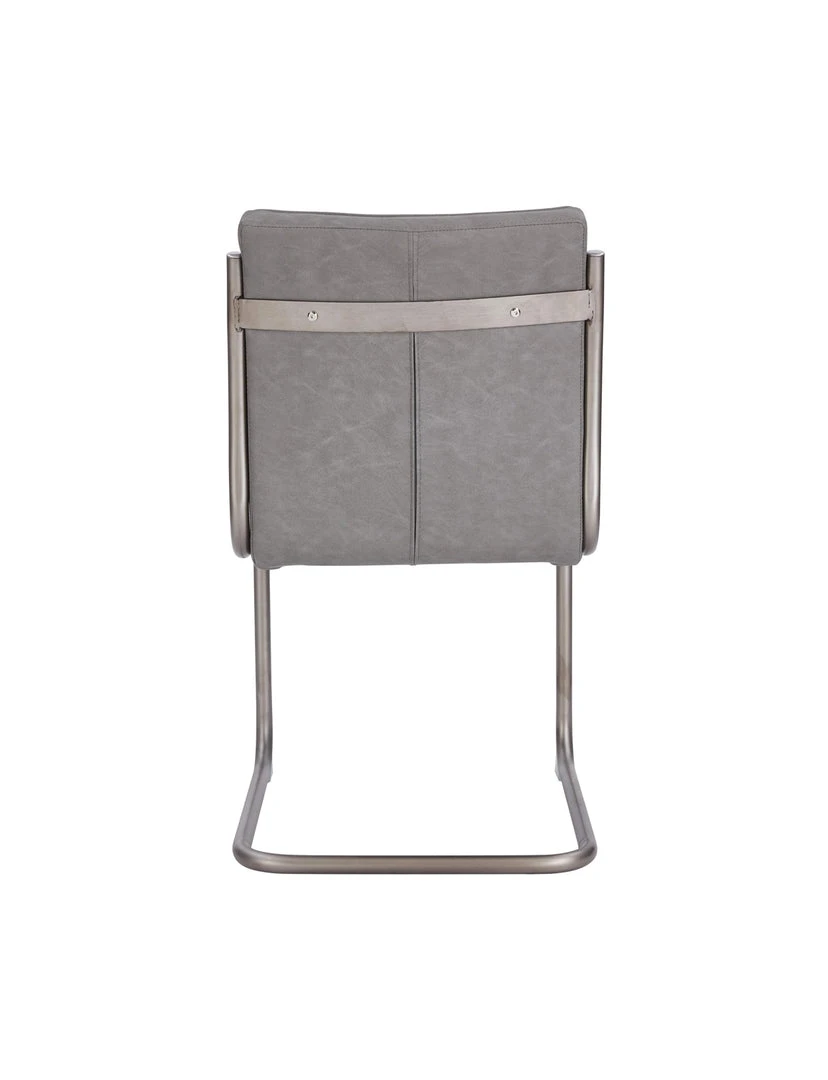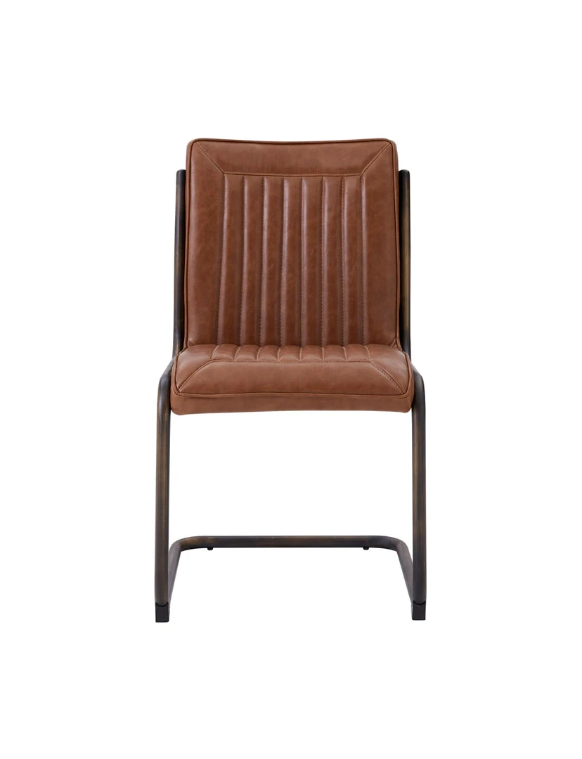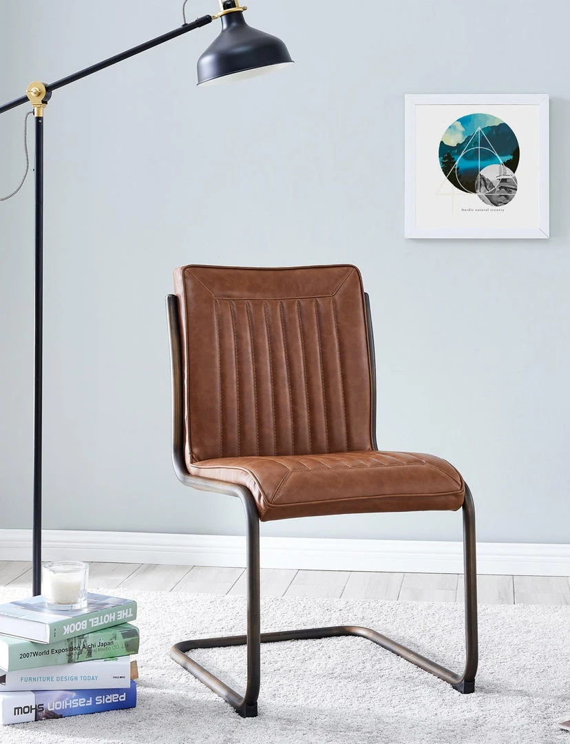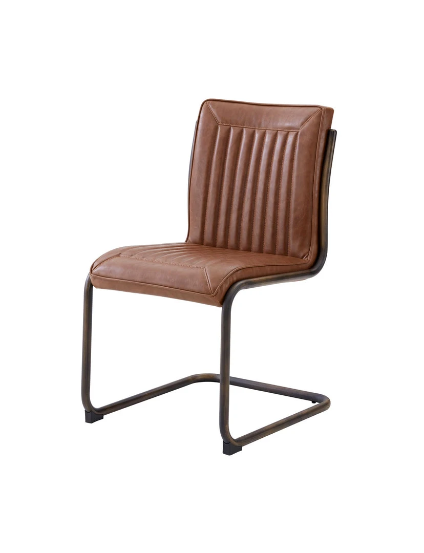 Industrial vintage dining chair with chic channel tufting PU upholstery and waterfalling seat on brass finish cantilever frame.