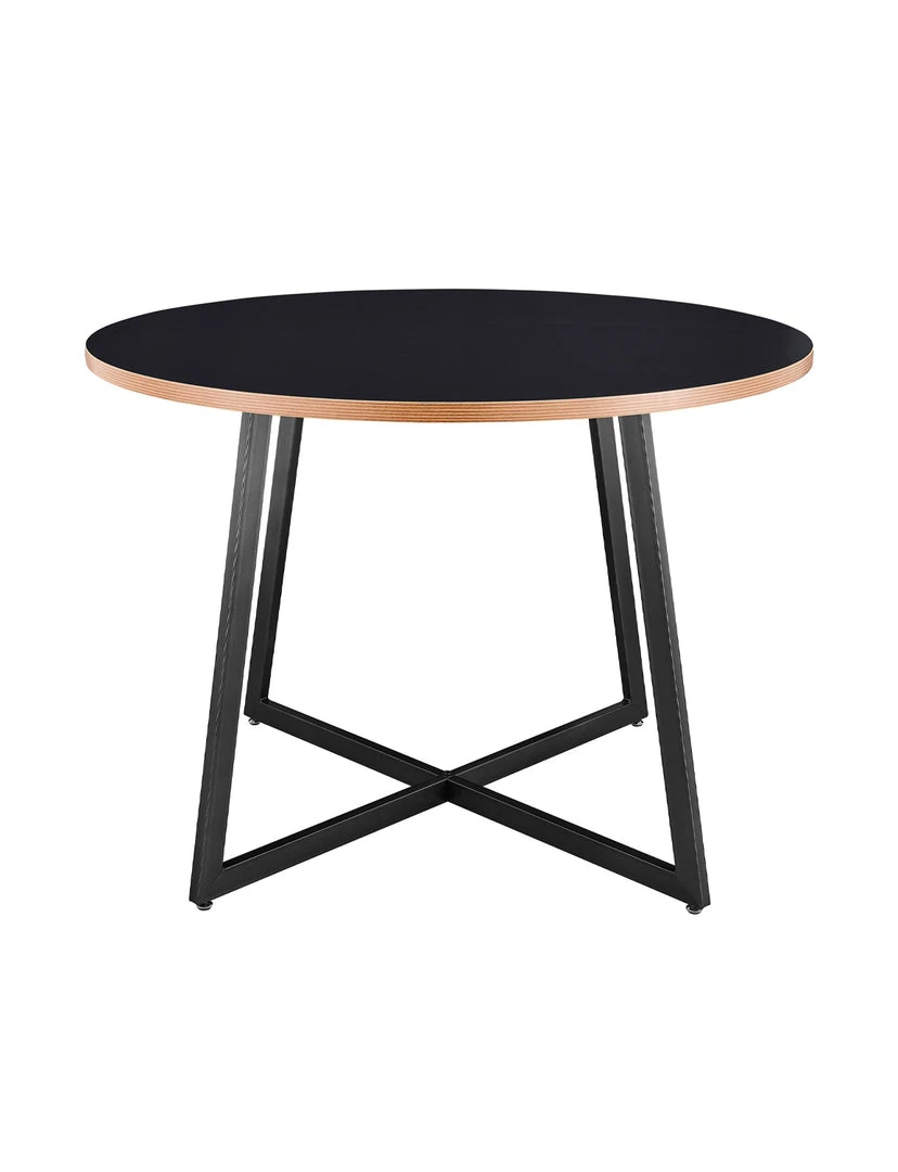 Modern Minimalist – round shape 42″ table top in sleek Black and Brown accent melamine finish is complemented on angular metallic gunmetal powder coated steel legs.