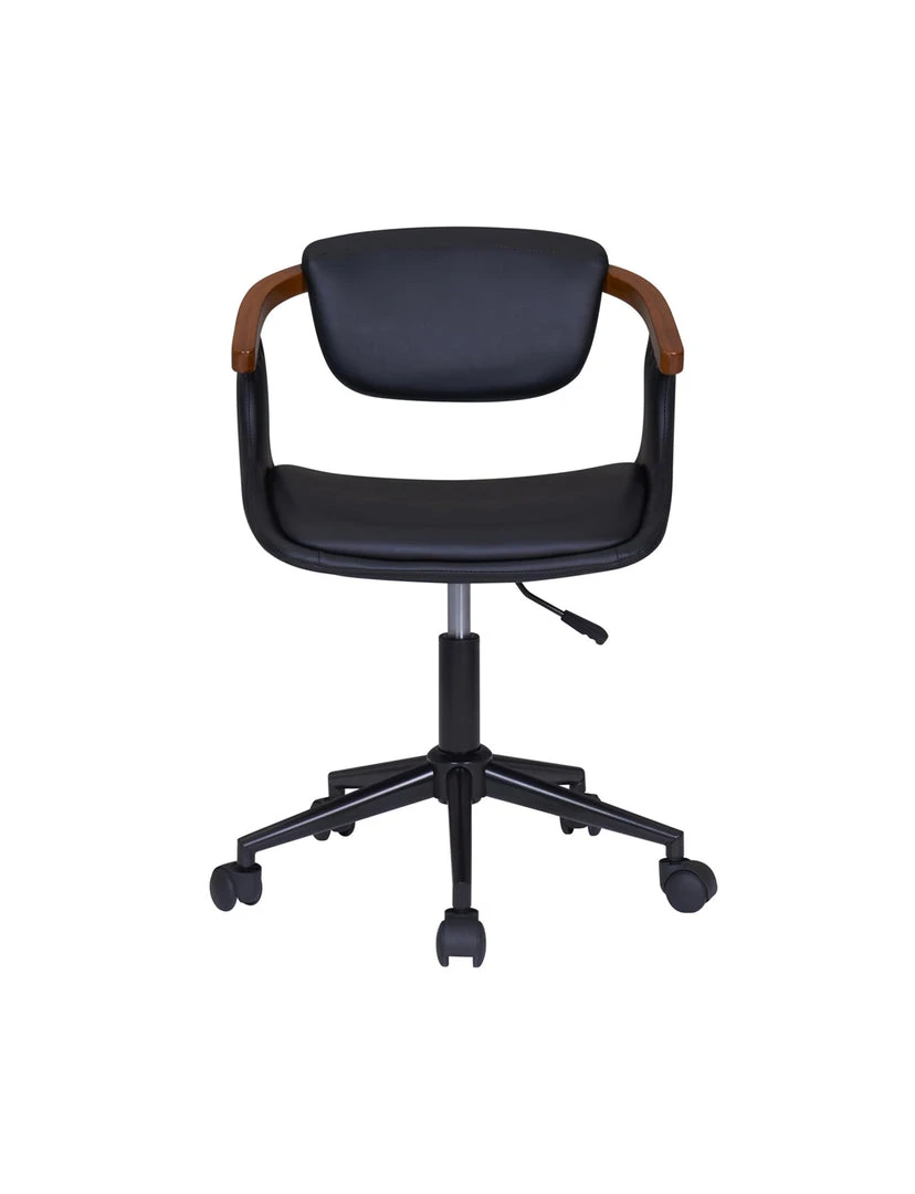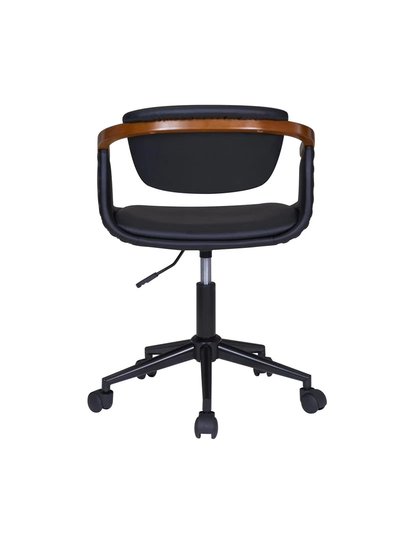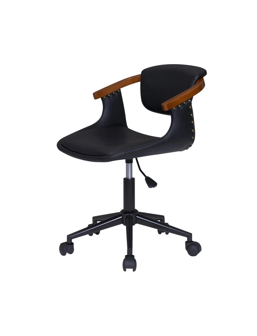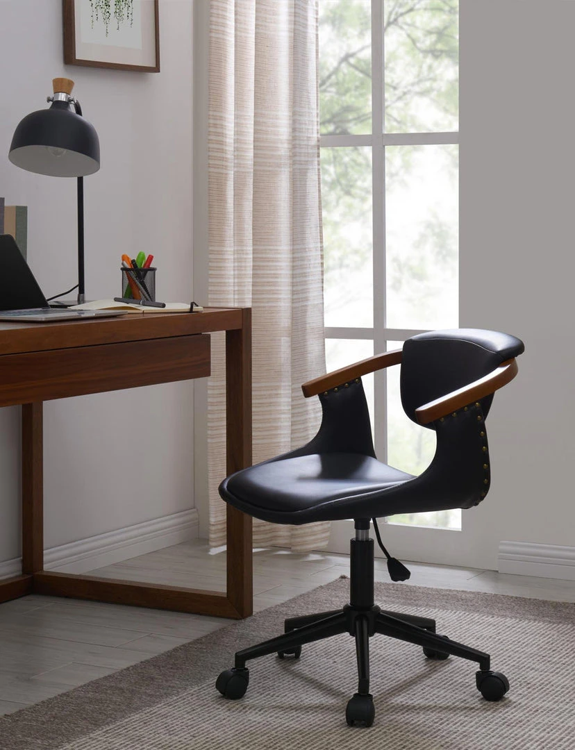 Drew office chair with bamboo back frame is a first-rate example of how classic forms evolve to become modern-day favorites. In the tradition of iconic Mid-Century Modern design, this open, airy chair’s shell is made from bent wood; it’s upholstered in sleek faux leather; and supported by powder coated steel caster legs. Bronze nailheads are placed by hand to enhance the chair’s curves. This chair swivels and rotates 360 degree, and adjusts between 17 – 20.5″ height.